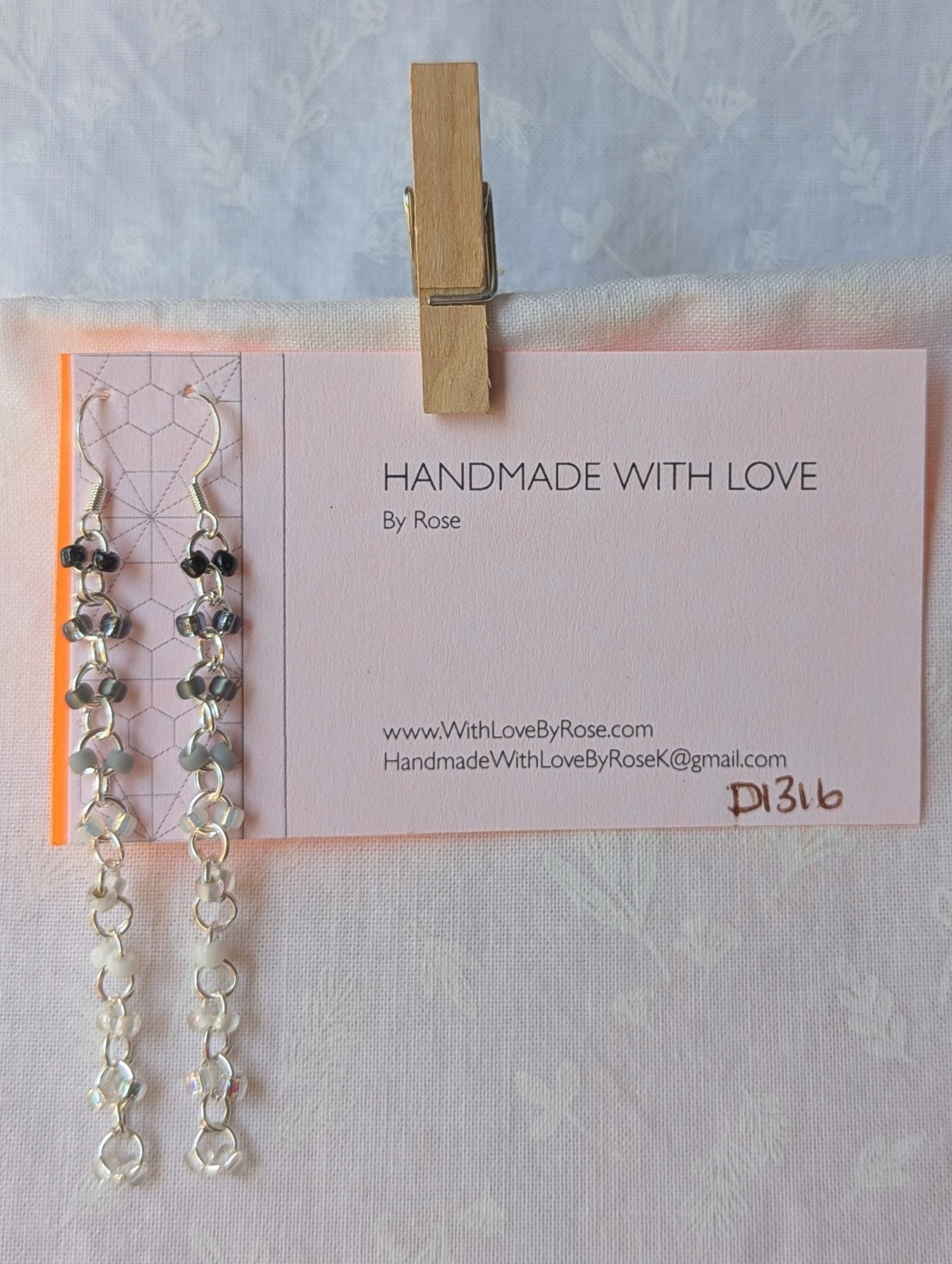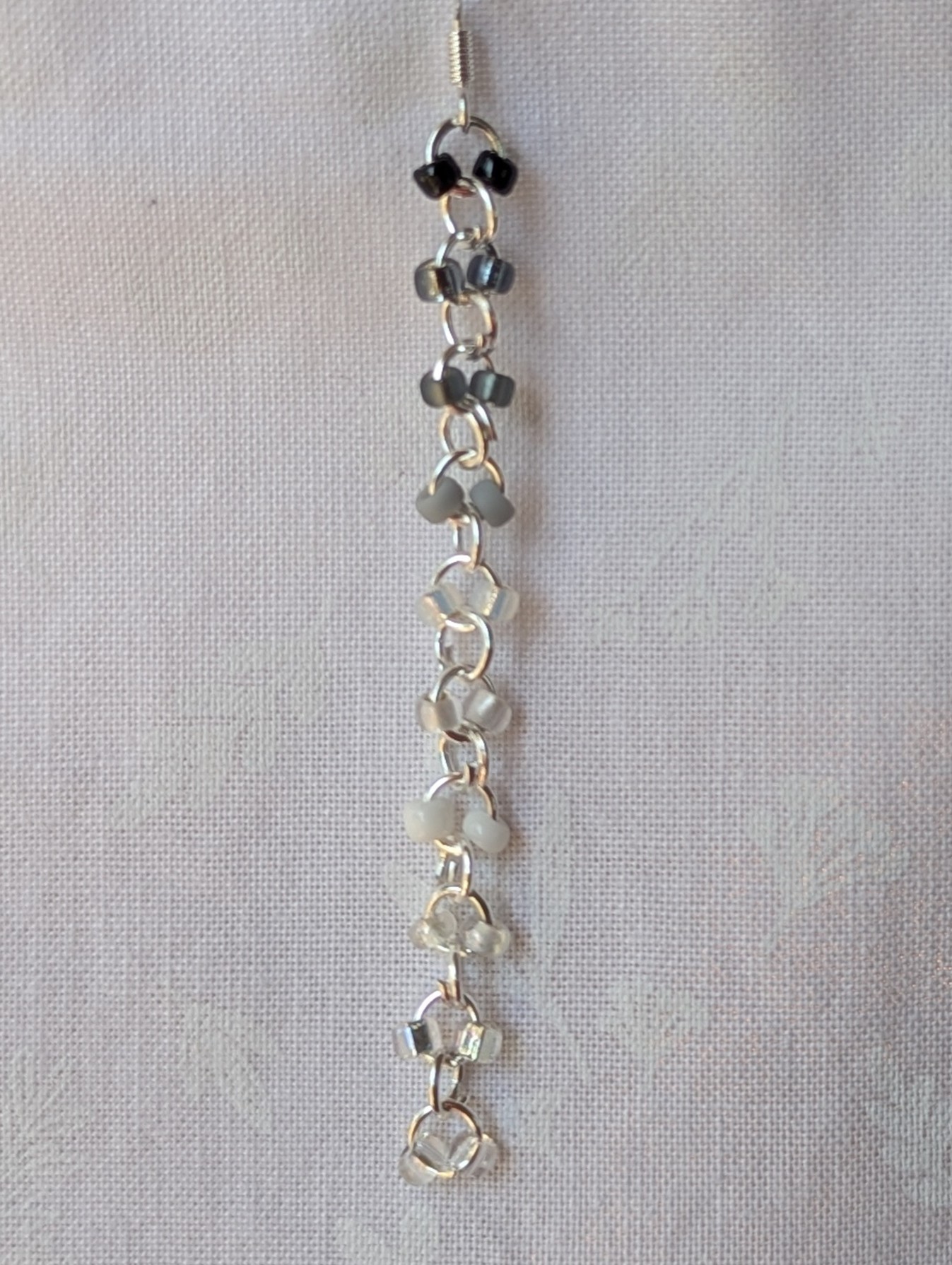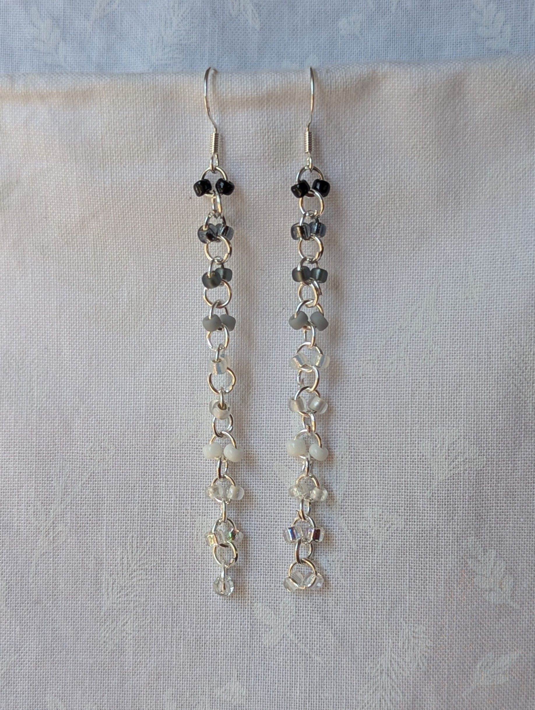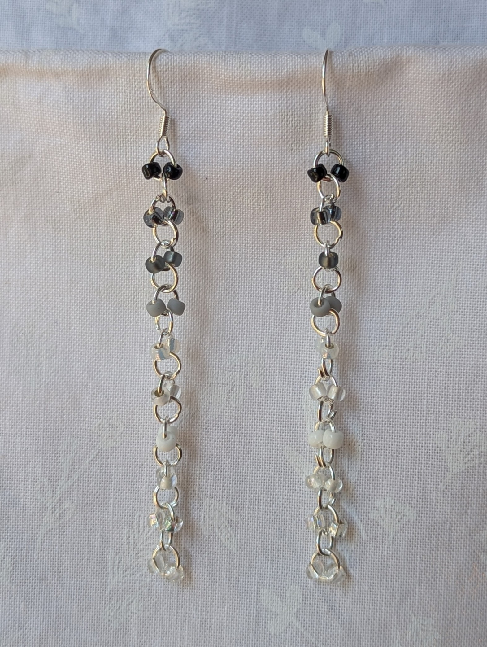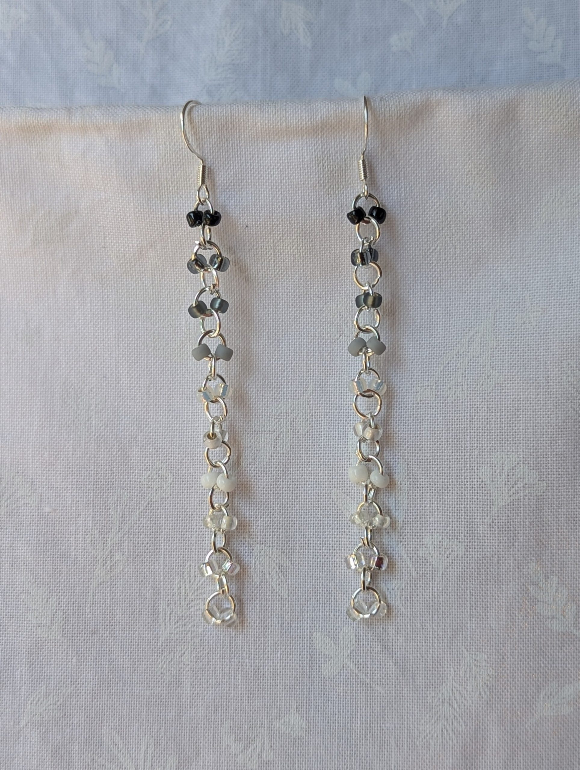 These black white earrings capture the beauty of contrast and light. Each earring features 20 shimmering glass seed beads that fade gracefully from deep onyx black to frosted white. The gradient effect evokes moonlight melting into shadow, all delicately linked with silver-colored metalwork. Finished with sterling silver French hooks, these lightweight earrings bring a sophisticated sparkle—perfect for elevating any outfit from day to night.