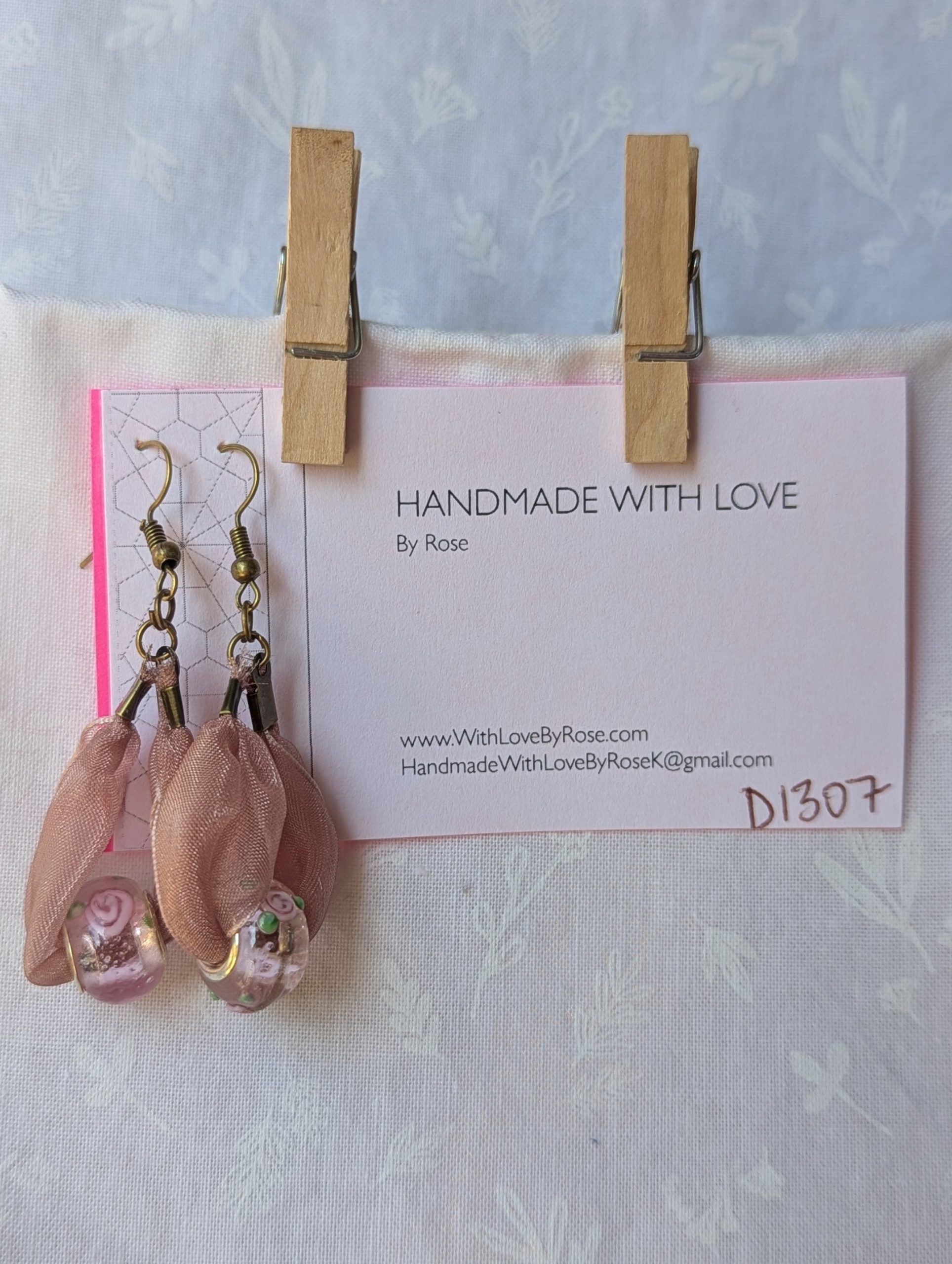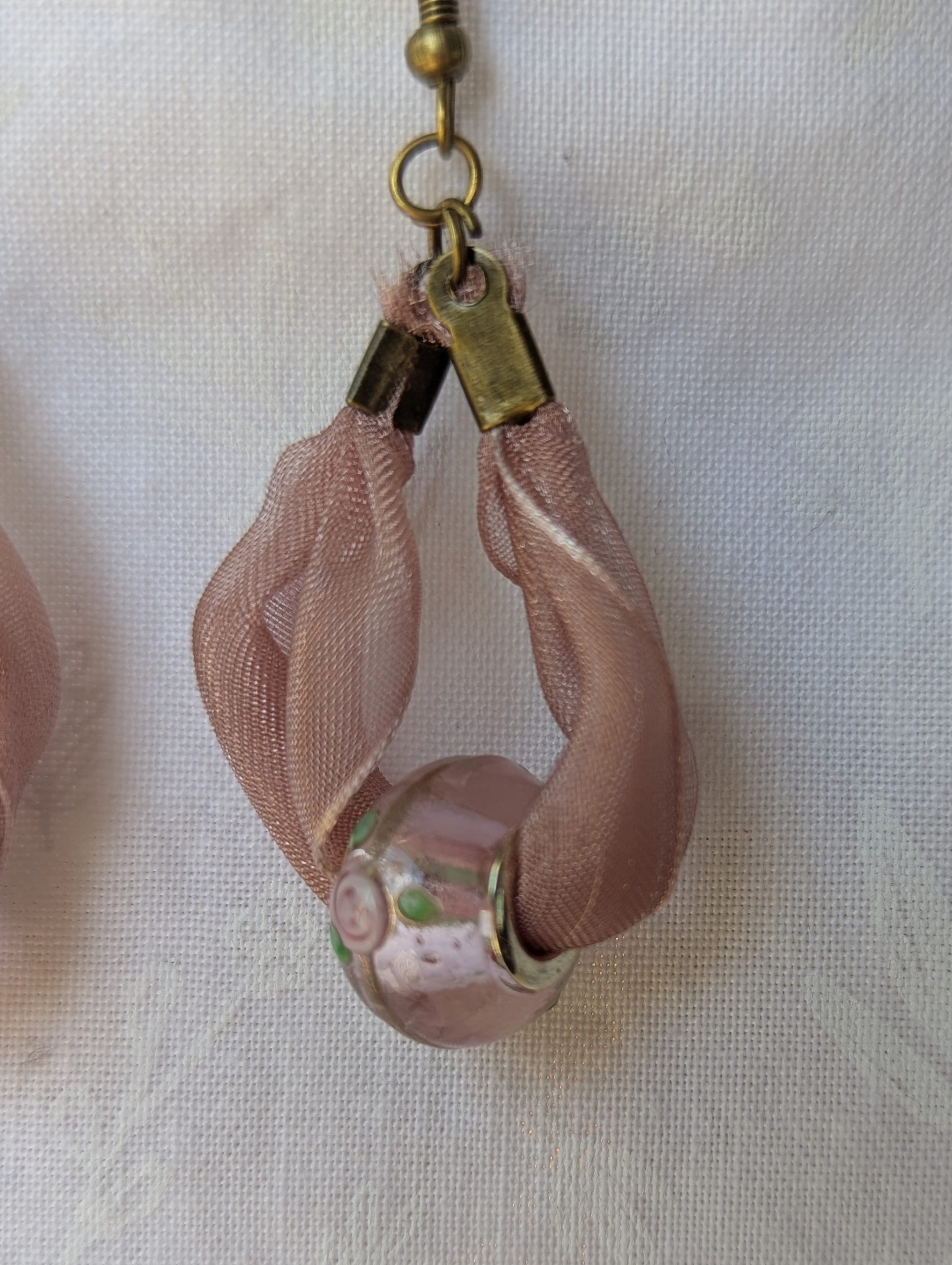 These Pale Pink Ribbon Earrings feature a unique blend of texture and color, combining the shimmer of glass with the softness of fabric. Each earring showcases a lampwork style pale pink glass bead detailed with delicate floral accents in pink and gold. The bead is looped through a ballet-pink ribbon that drapes naturally, creating an elegant, artistic flow. The earrings are finished with bronze-colored metal findings and matching hooks for a subtle, modern contrast against the organic ribbon texture. Lightweight yet visually striking, these earrings make a beautiful statement for anyone who appreciates artisan-crafted jewelry with a touch of sophistication.