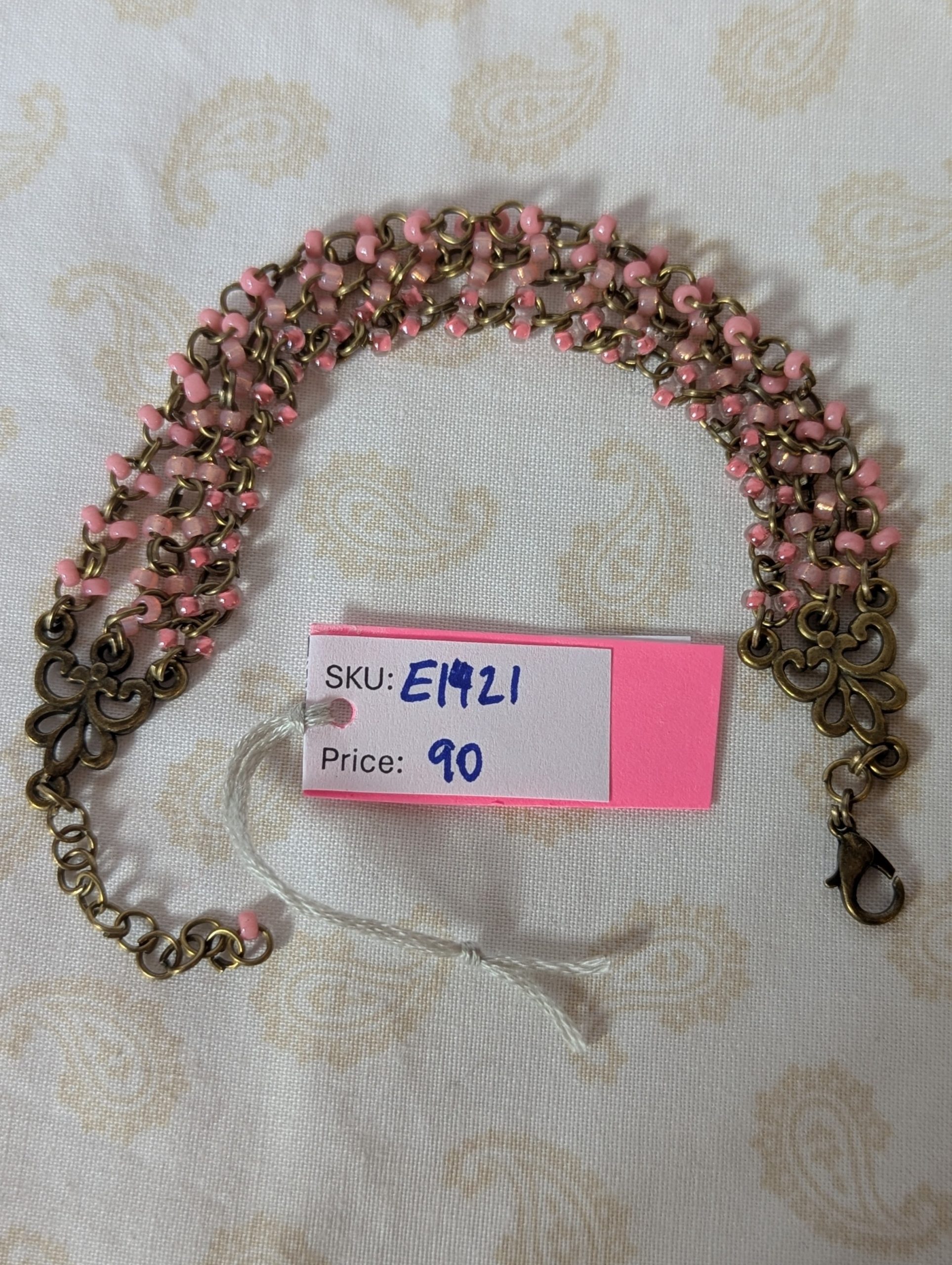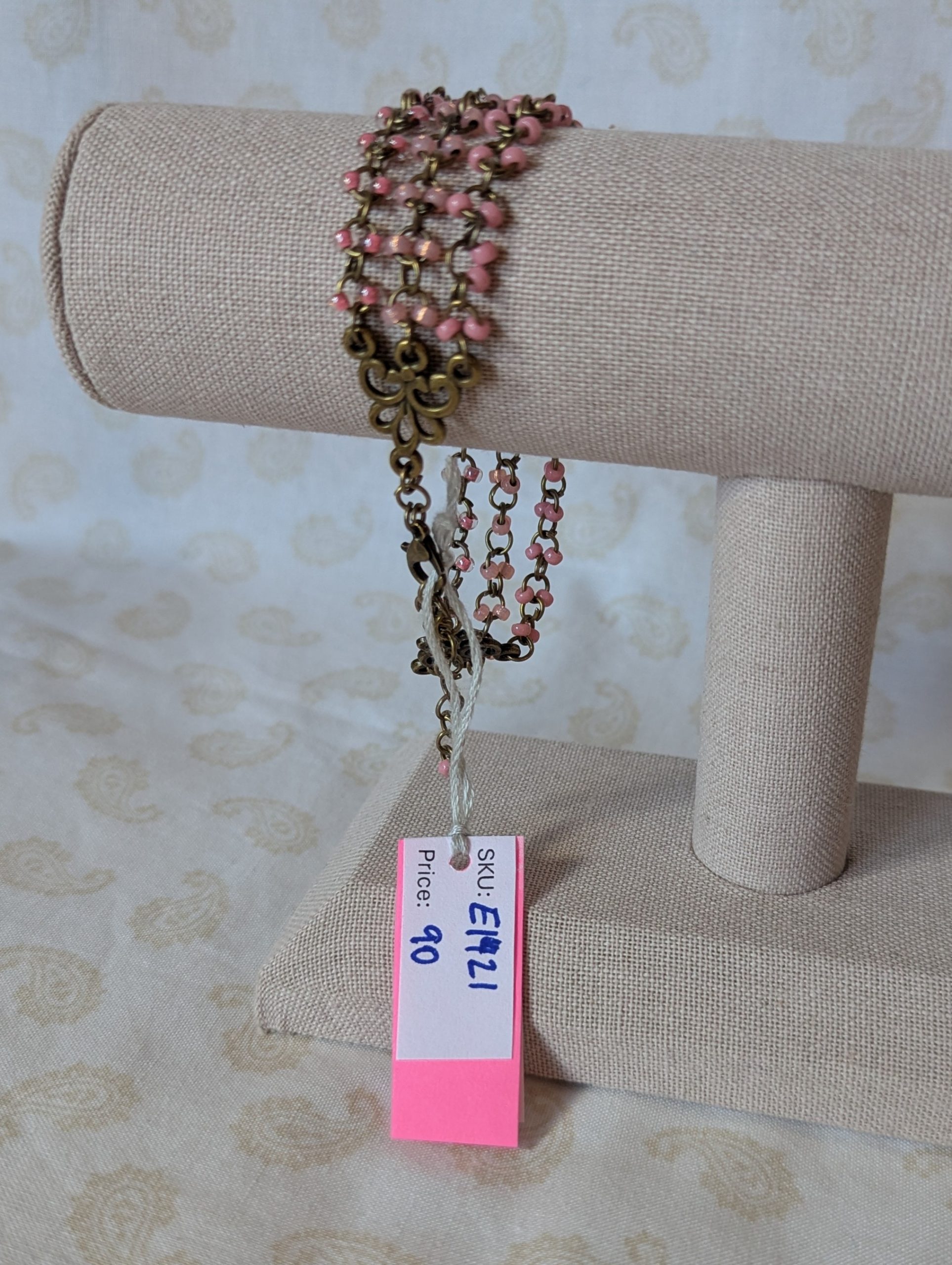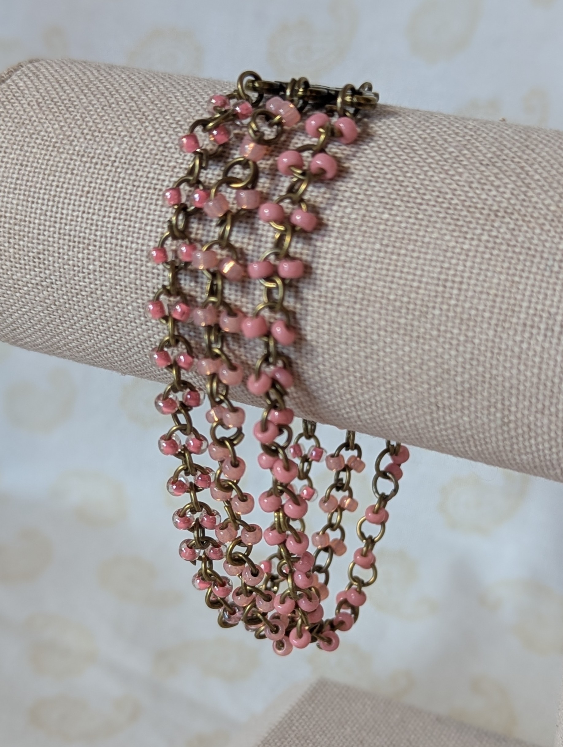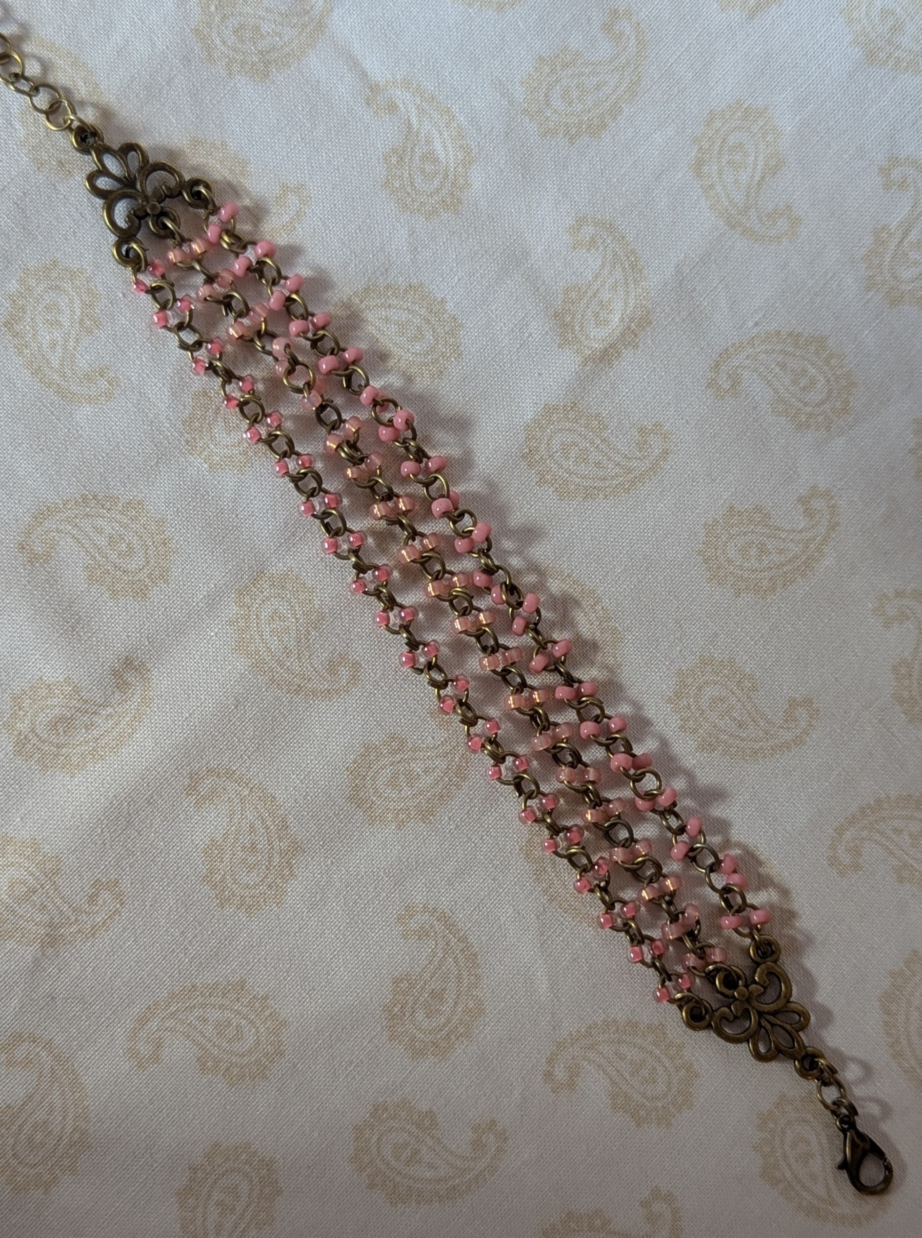 Softly romantic with a touch of antique charm, this pale pink triple-strand bronze chain bracelet is a delicate study in texture and tone. Three hand-linked, bronze-hued chains drape gracefully, each strand adorned with pairs of blush-toned beads set into alternating links. The beads create a subtle symphony of pink finishes: crystal-clear beads with pink lining, iridescent pink glowing with warm golden reflections, and smooth pearly pink beads with a soft, luminous sheen. Together, they offer depth and visual intrigue while maintaining a gentle, feminine palette. Finished with coordinating bronze-colored metal fixtures and a secure lobster clasp, this bracelet blends vintage…