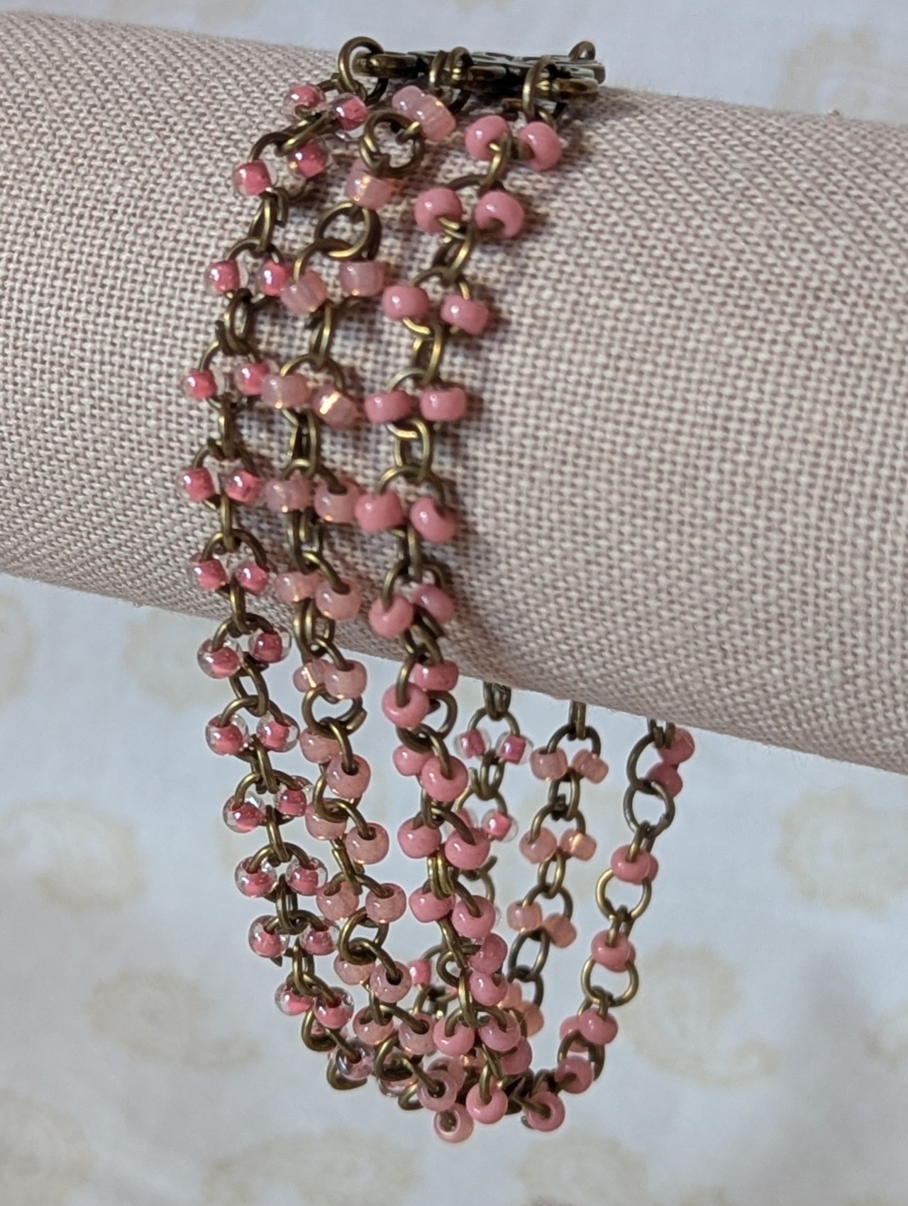 Softly romantic with a touch of antique charm, this pale pink triple-strand bronze chain bracelet is a delicate study in texture and tone. Three hand-linked, bronze-hued chains drape gracefully, each strand adorned with pairs of blush-toned beads set into alternating links.