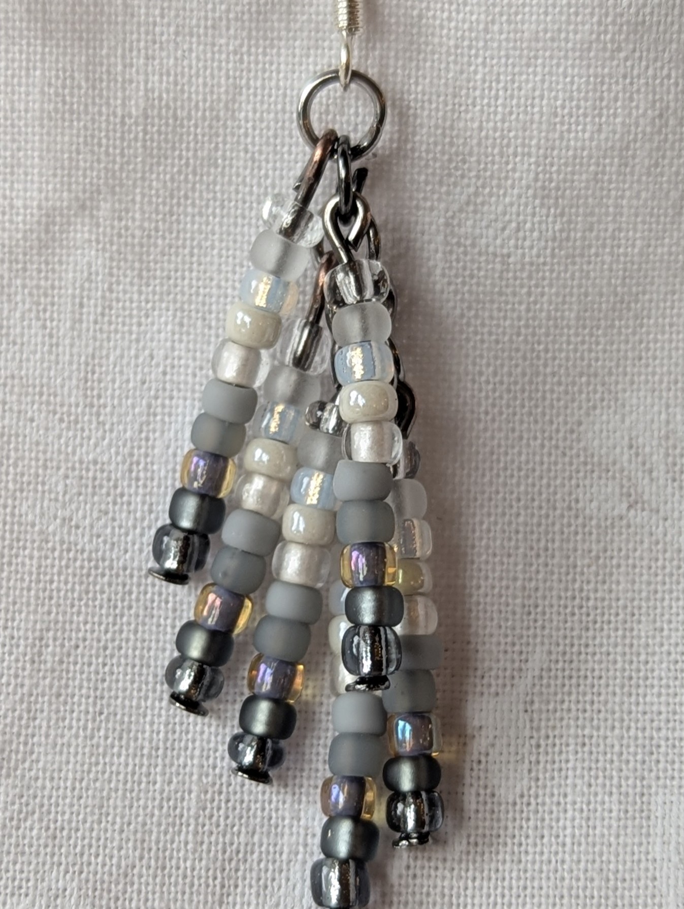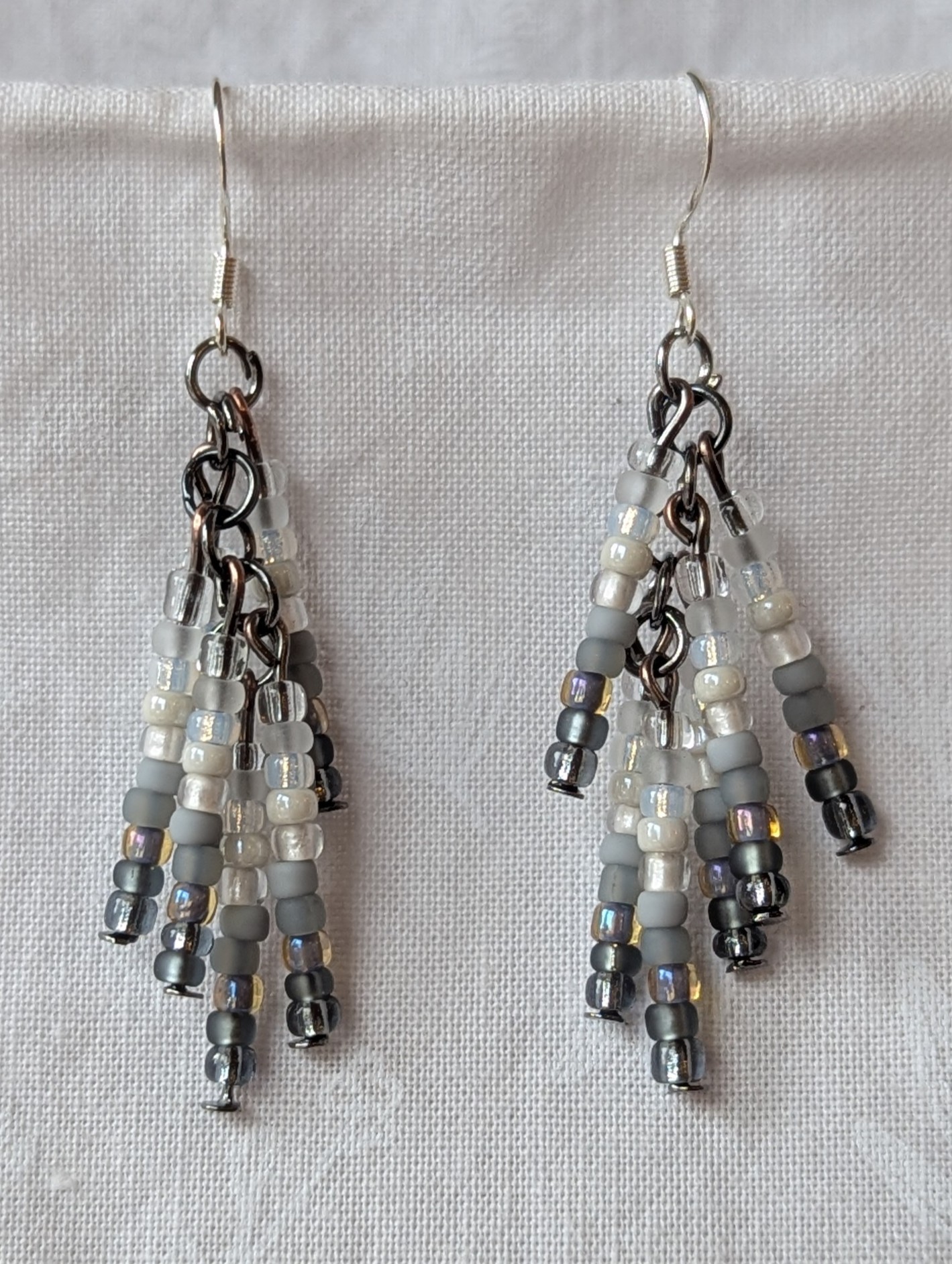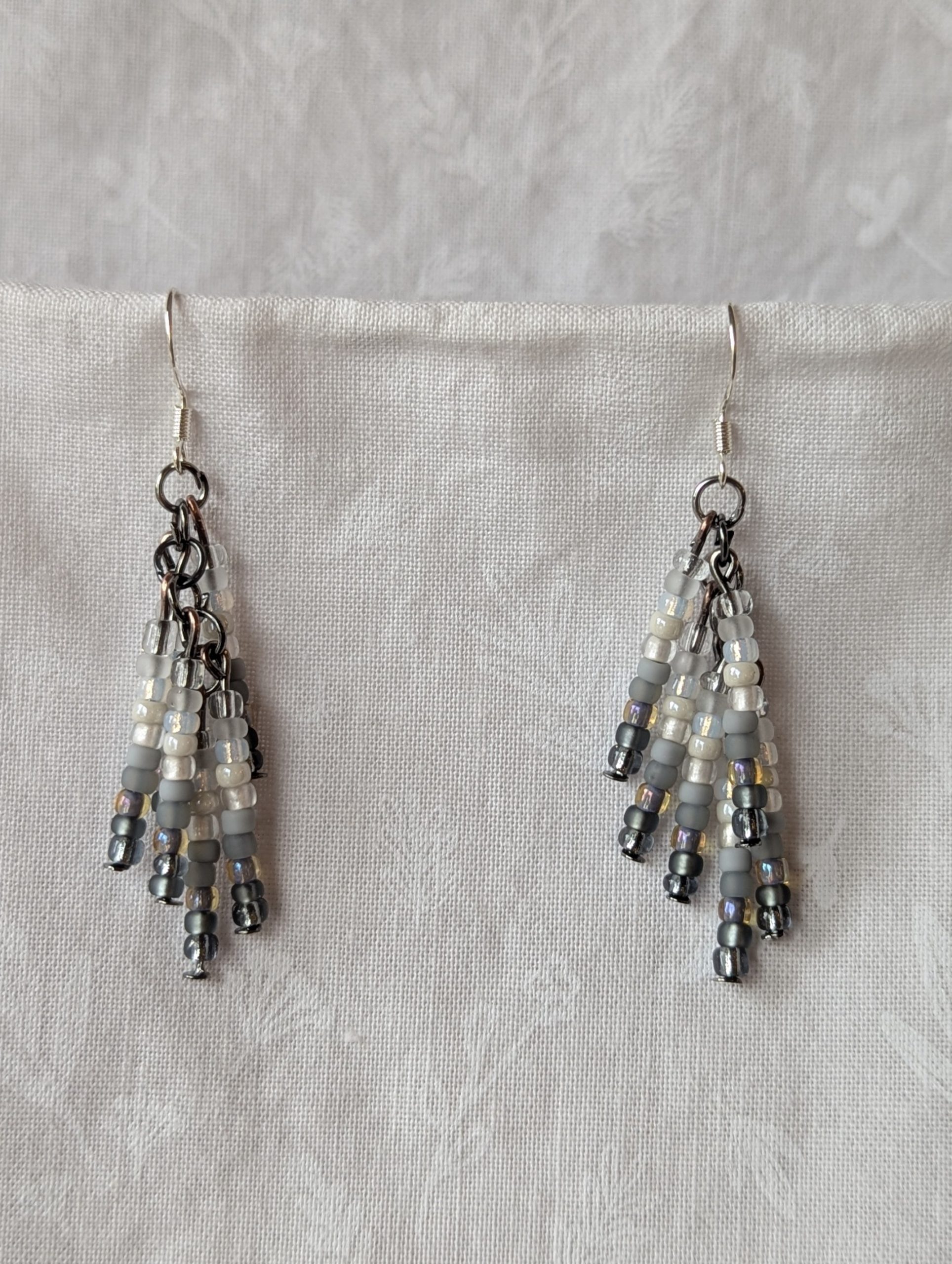 The beads are suspended from tungsten-colored posts and jump rings, adding a modern, industrial contrast to the soft neutral tones. Sterling silver hooks complete the look, making the earrings lightweight, comfortable, and elegant for everyday wear or special occasions. The monochrome palette makes them effortlessly versatile, pairing well with any outfit.