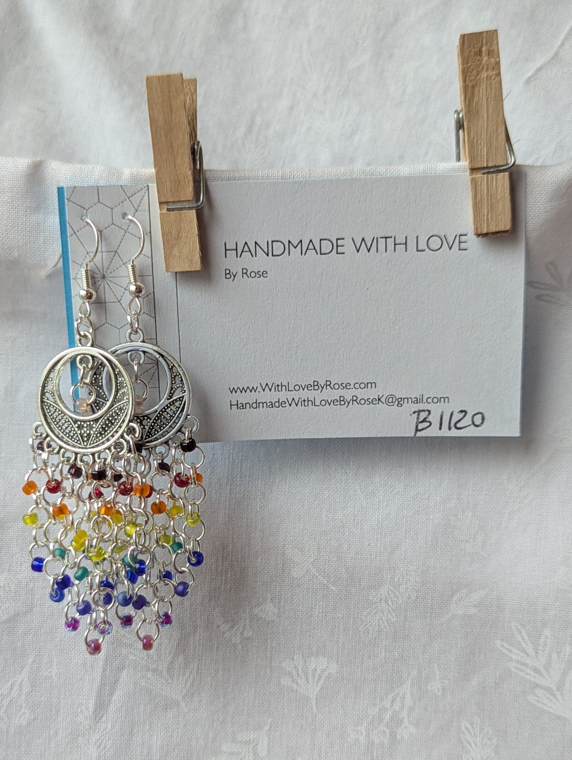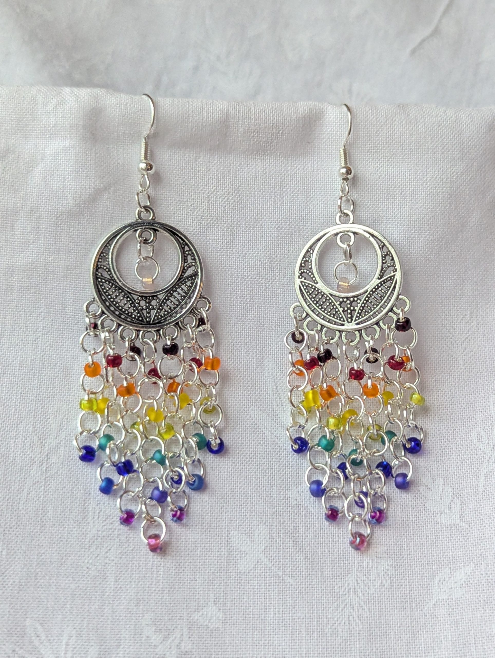 The Celestial Rain earrings capture the magic of starlit skies and shimmering rainbows. Featuring 32 luminous beads in deep red, red, orange, yellow, lime green, green, blue, iridescent blue, violet-lined blue, and pink, these earrings create a stunning cascade of cosmic color. Each bead is carefully linked with silver-colored jump rings and suspended from an intricately detailed silver-colored celestial ornament, evoking the beauty of the heavens. Finished with matching silver earring hooks, these earrings sway with every step, like a gentle rain of stars lighting up the night.