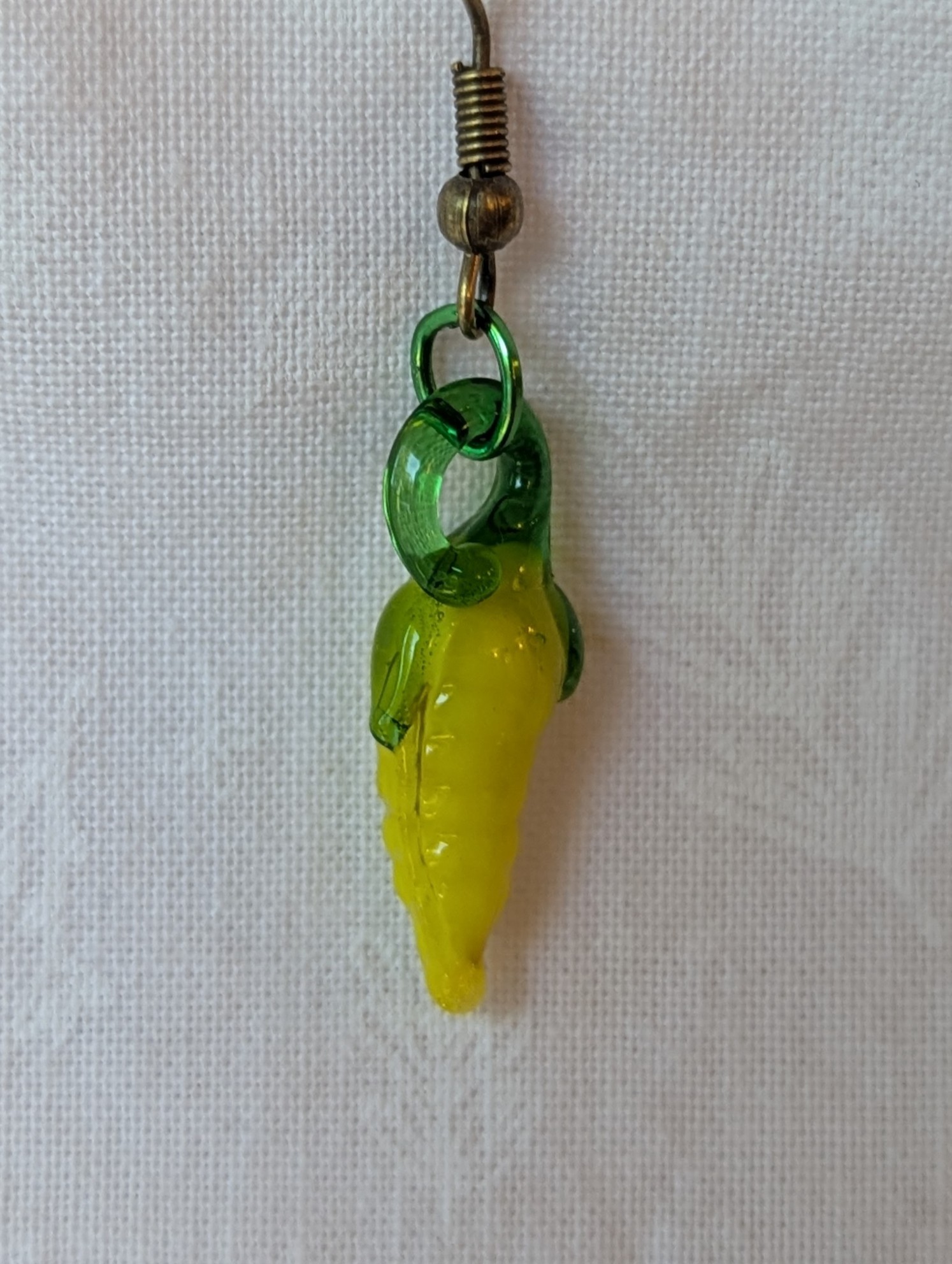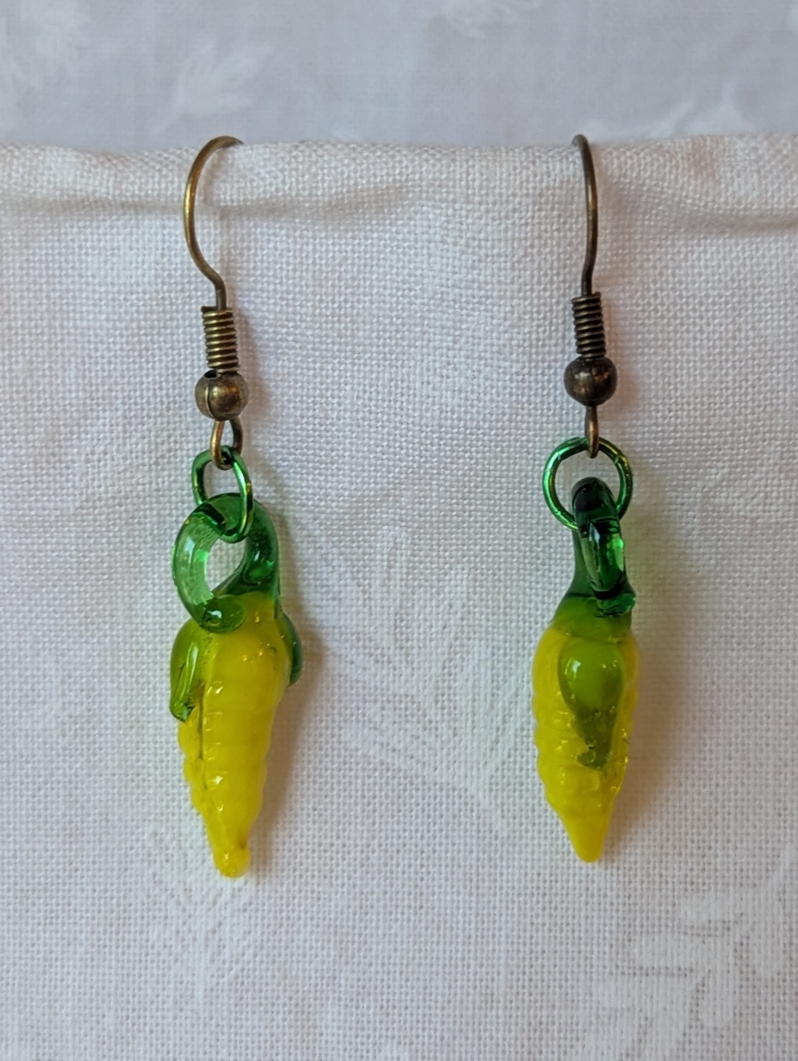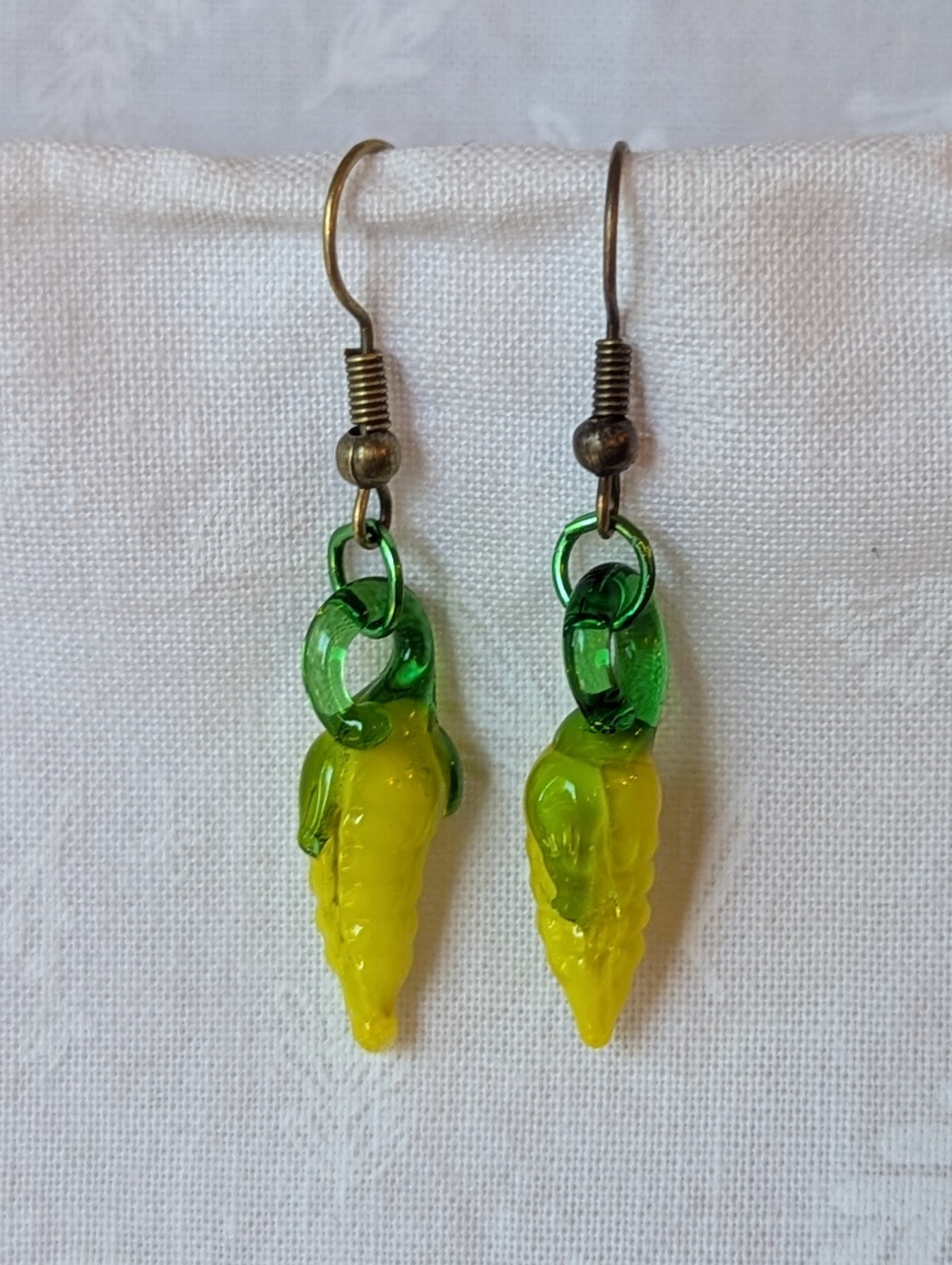 These Corn Earrings feature charming yellow glass beads shaped like miniature ears of corn, complete with bright green husks. The translucent glass captures light beautifully, creating a warm, golden glow that highlights the textured kernels and leafy details. Each earring is connected with a bronze-colored jump ring and hung from matching bronze hooks, adding an earthy, rustic touch to the vibrant design.