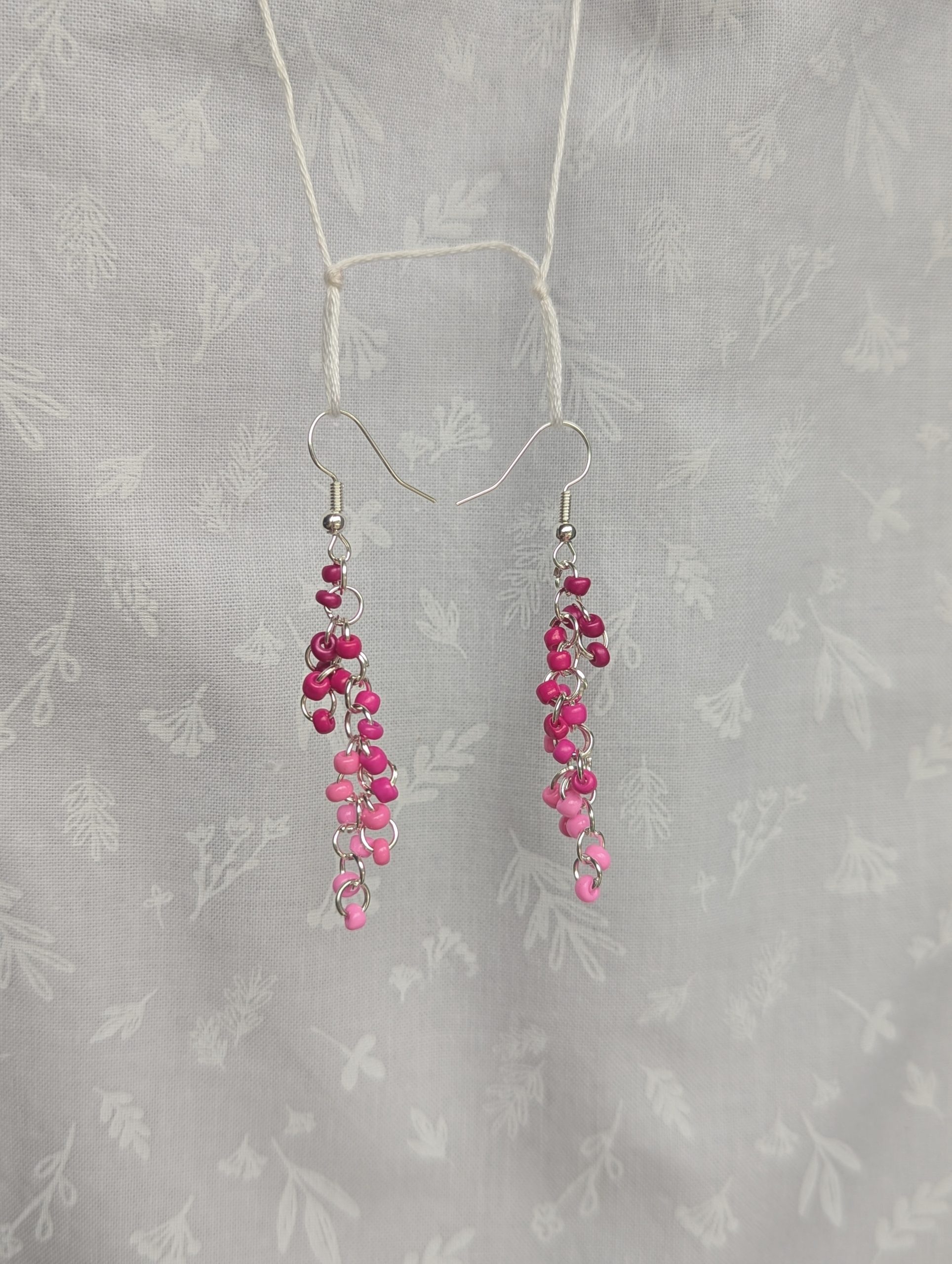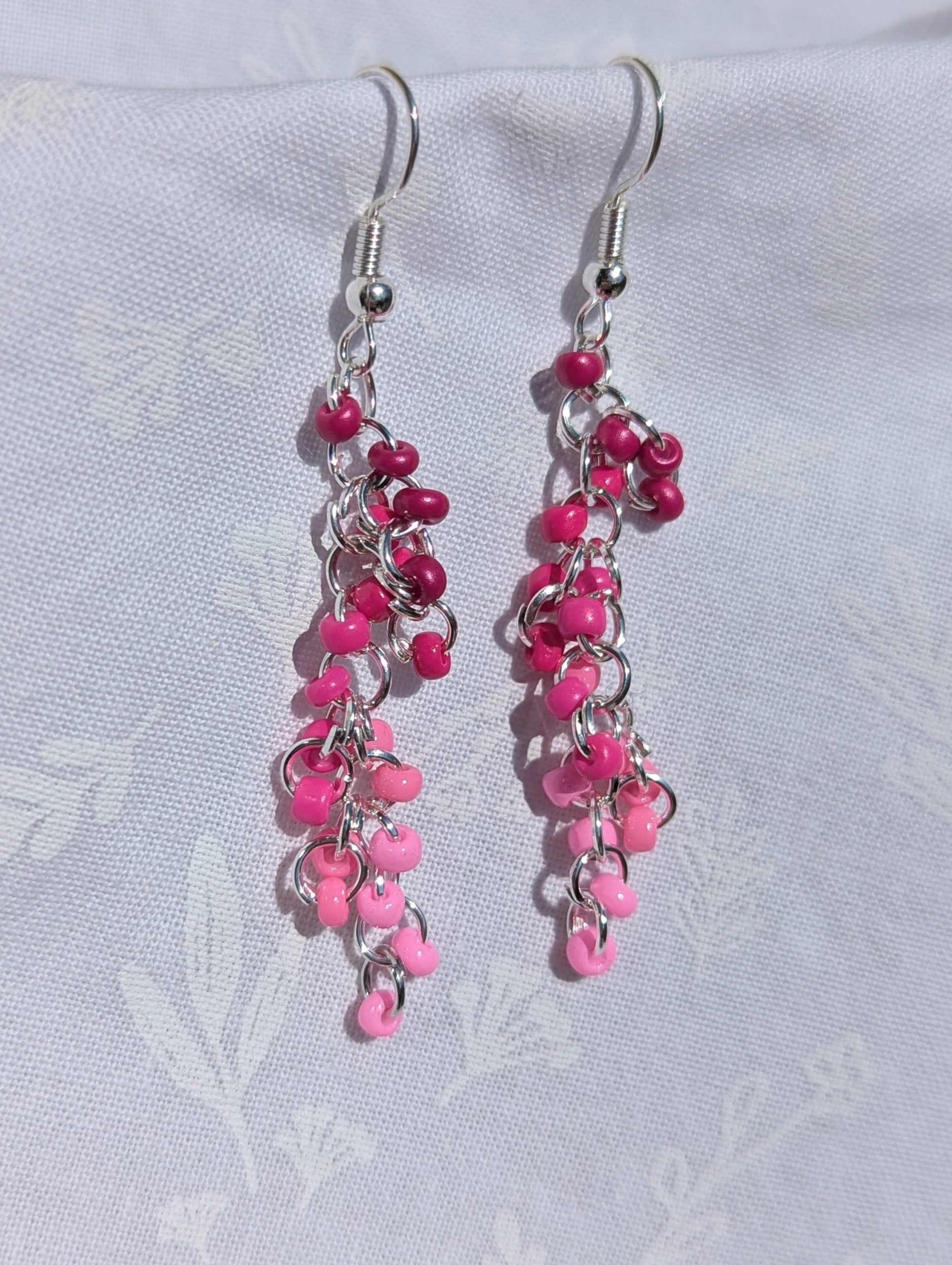 These whimsical Cotton Candy Cascade Earrings feature five different hues of pink in solid colors, creating a soft, gradient effect. With 20 beads per earring, four beads of each color, they offer a delightful cascade of pink shades. Silver-colored jump rings connect the beads, and the matching silver-colored earring hooks complete the design, offering a light, playful, and elegant touch. These medium-length earrings are perfect for adding a sweet pop of color to any outfit.