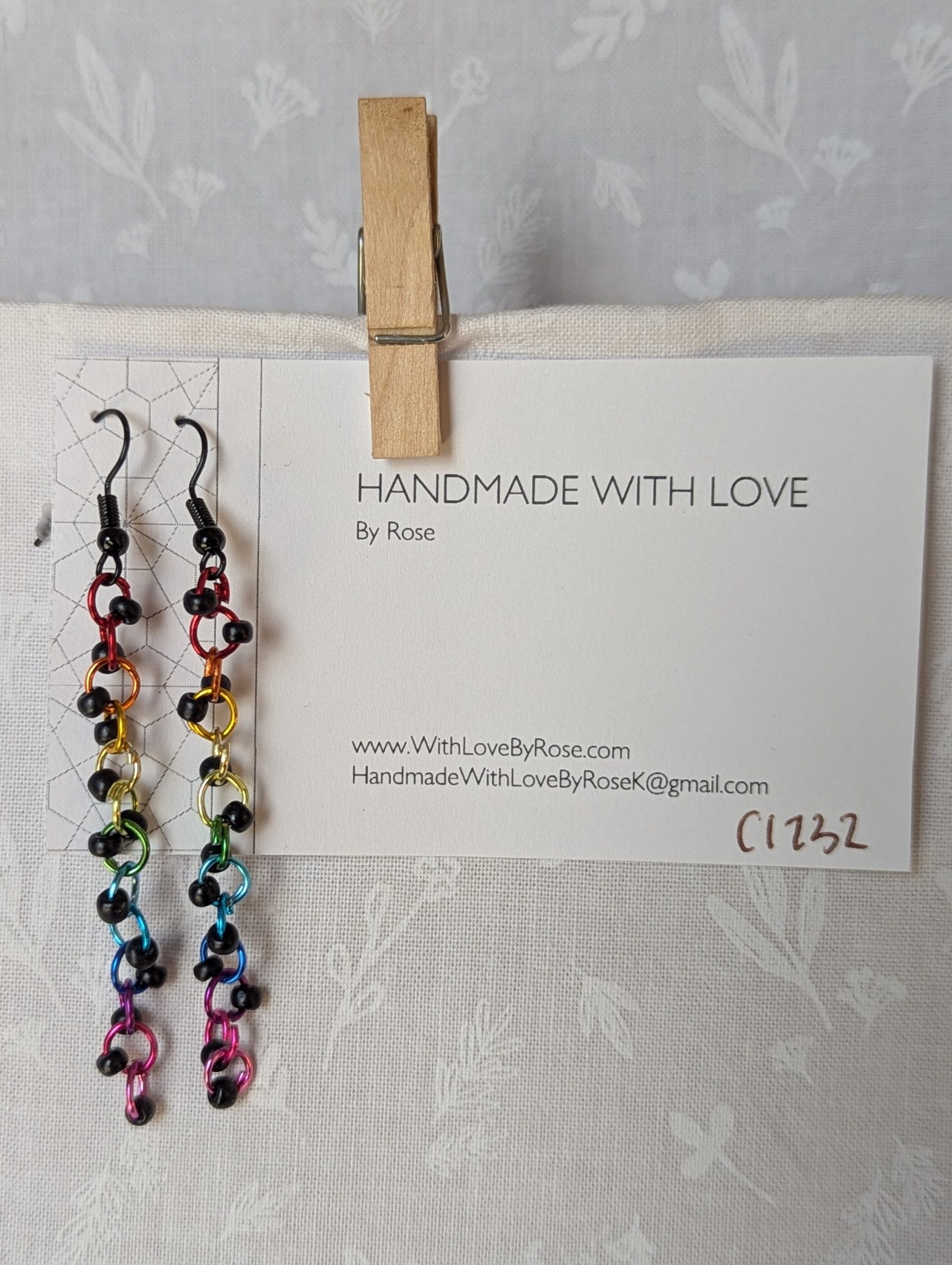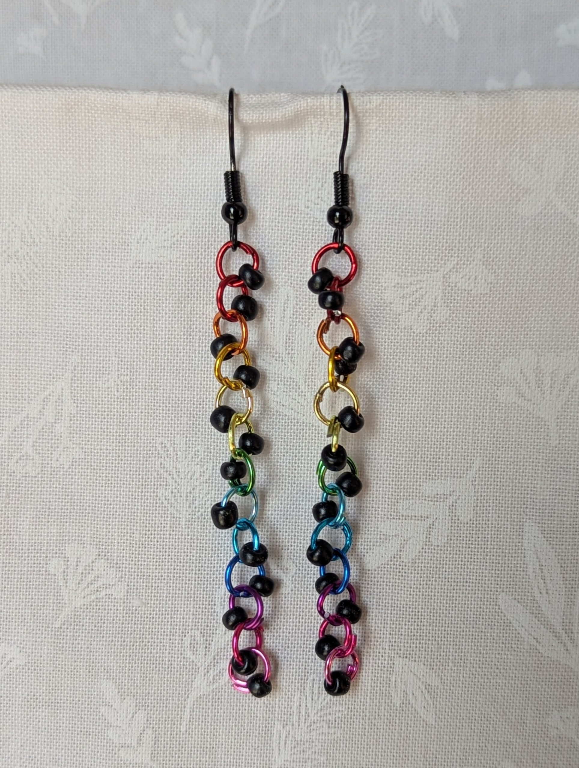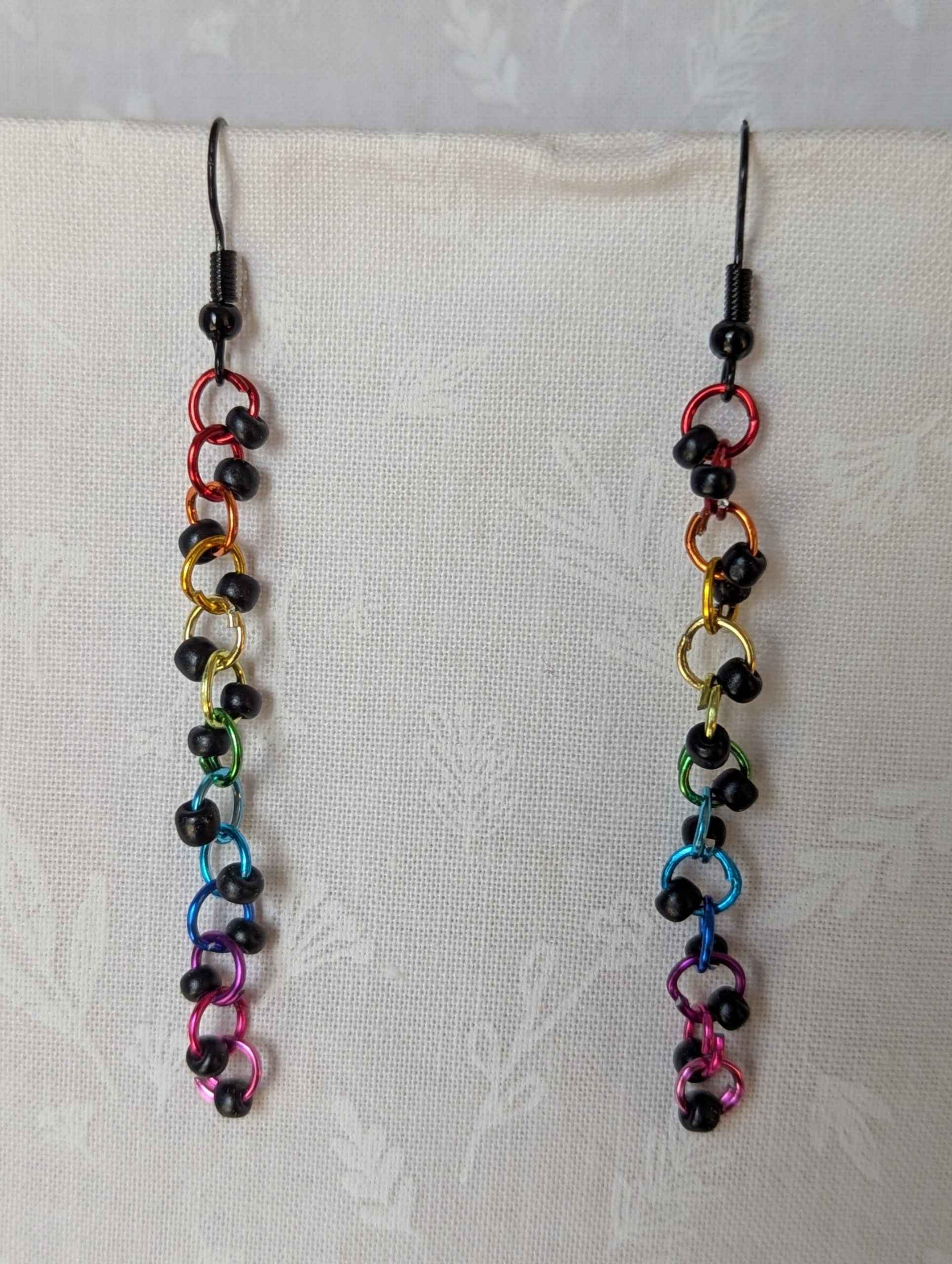 Unleash your inner rainbow with the Dark Prism Earrings, a striking fusion of vivid color and gothic flair. Each earring features 13 rich, matte black seed beads, suspended from a vibrant cascade of anodized aluminum jump rings. The rings glow in a full rainbow gradient—from fiery red and molten orange through emerald green, oceanic blue, and ending in hot magenta pink. Finished with sleek black earring hooks, the Dark Prism Earrings are a bold celebration of contrast and color. Perfect for Pride, punk-inspired fashion, or anyone who lives loud and proud.