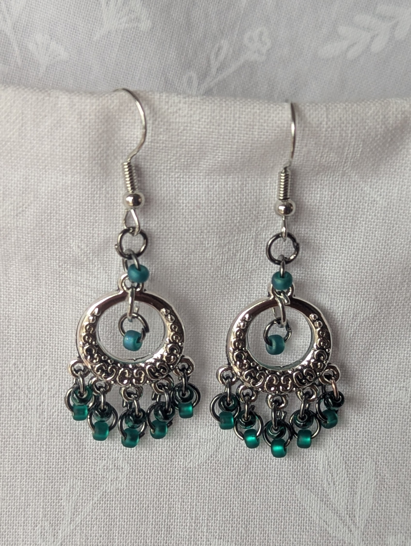 The Enchanted Forest Chandelier Earrings capture the rich, mysterious beauty of nature with 12 beads in three luxurious shades and textures of deep emerald green: frosted, silver-lined, and matte iridescent. Each bead adds depth and intrigue to the design, which is suspended from a Tibetan chandelier-style silver-colored ornament. Completed with tungsten-colored jump rings and steel-colored earring hooks, the Enchanted Forest Chandelier Earrings are a perfect blend of earthy elegance and bold sophistication.