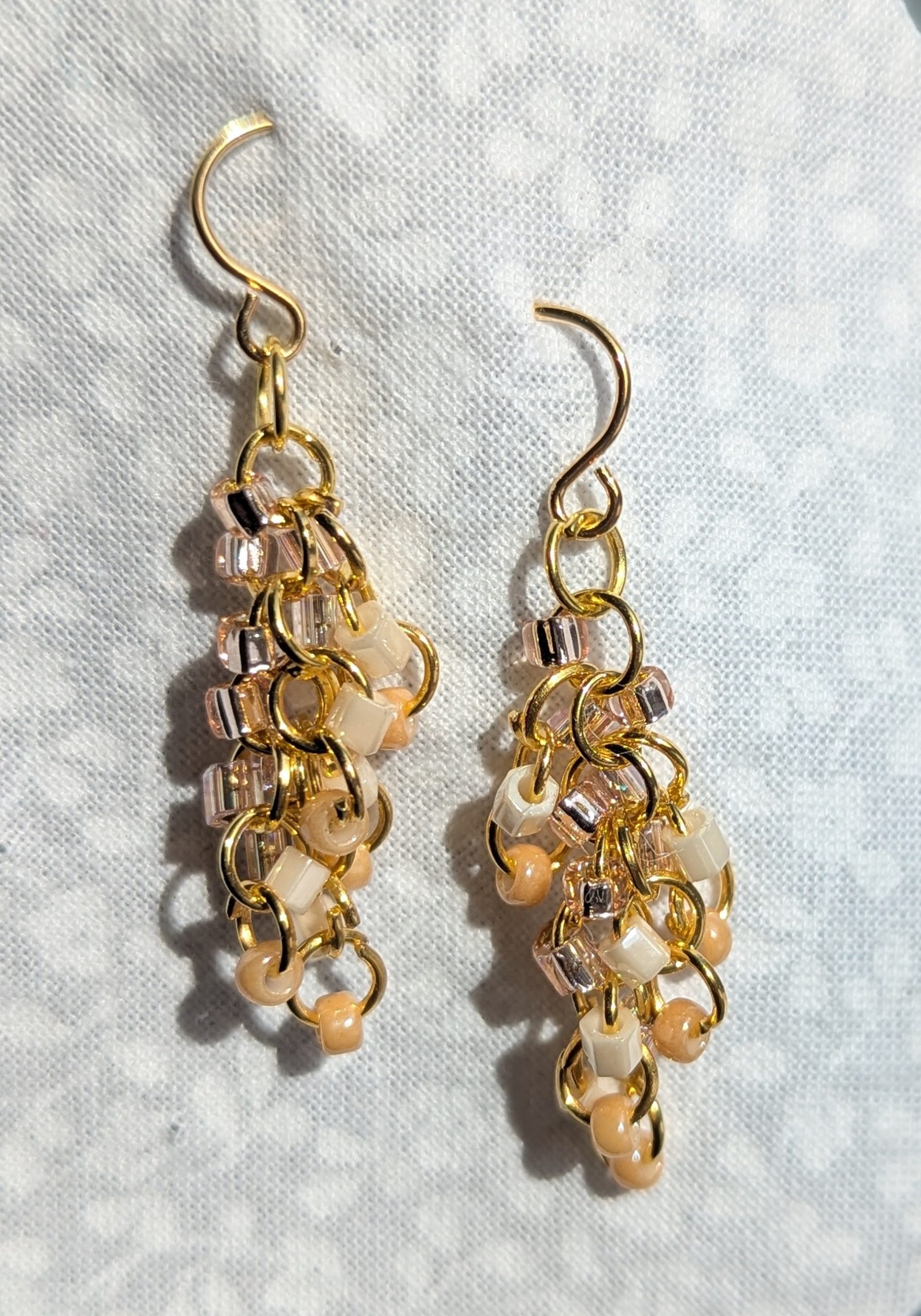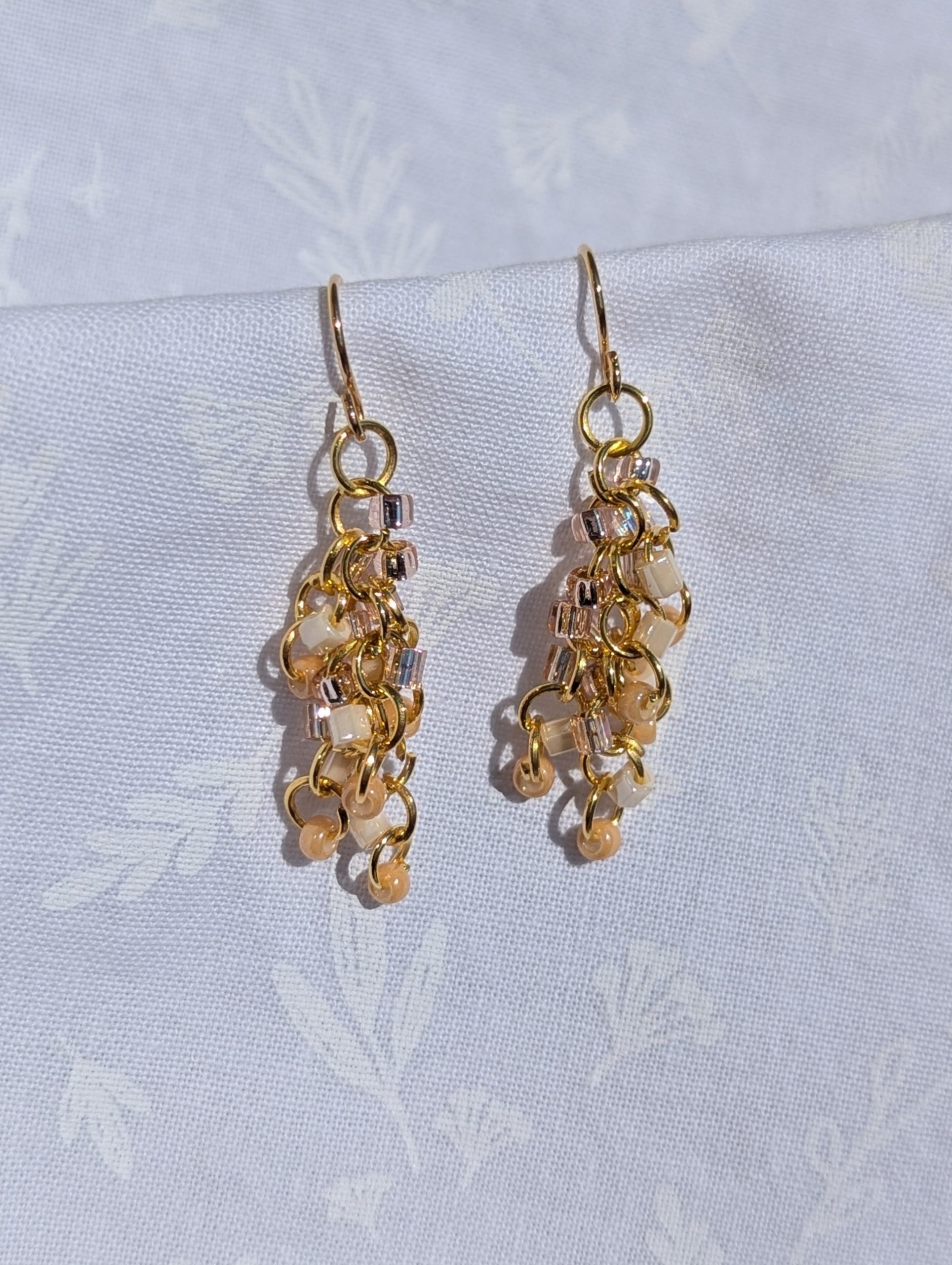 Elegant and delicate, these Golden Blush Earrings feature a soft blend of pale pink, cream, white, and clear beads, beautifully arranged to create a subtle shimmer. With five different hues and varied textures, each earring contains 20 glass seed beads—four of each color—linked together with gold-colored jump rings. Suspended from gold-colored earring hooks, these lightweight earrings add a touch of sophistication and charm to any outfit.