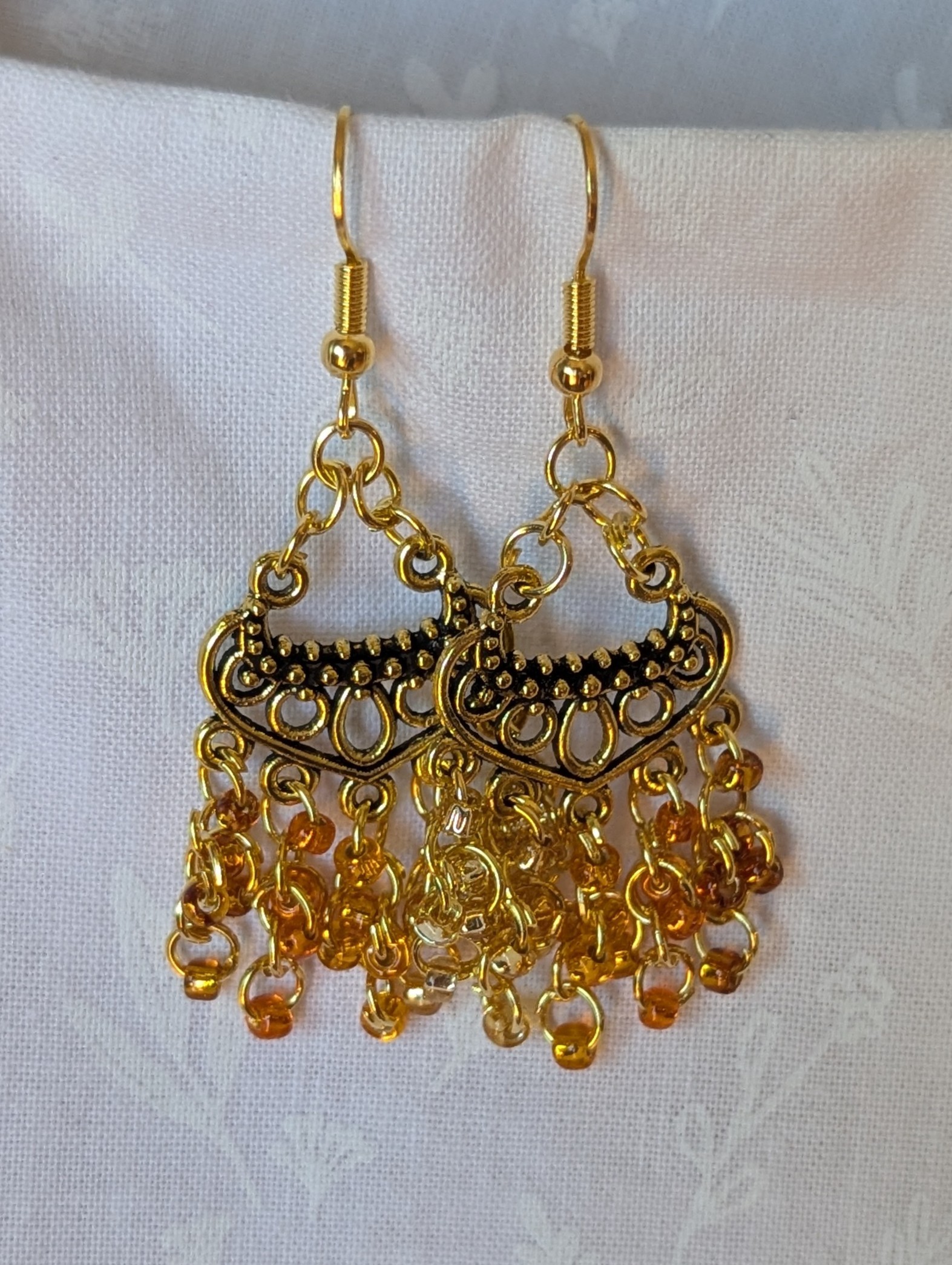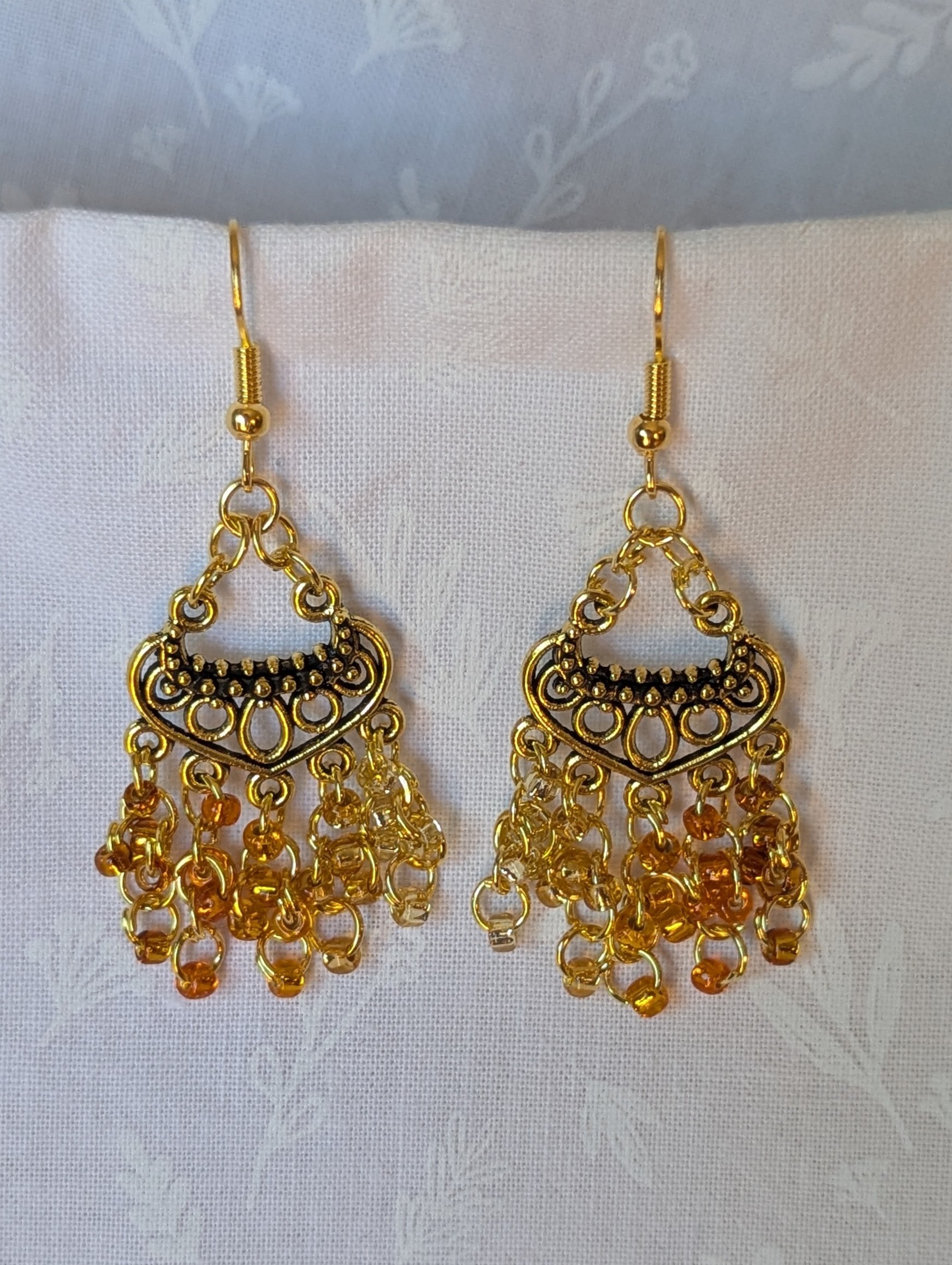The Golden Hour Cascade Earrings capture the warmth and luxury of sunset in motion. Featuring 25 shimmering glass beads in five distinct golden tones and textures—translucent amber, matte gold, metallic bronze-gold, pale champagne shimmer, and deep honey luster—each bead is carefully arranged to create a dynamic cascade of color. Suspended from ornate, antiqued gold-colored chandelier-style ornaments and connected with coordinating gold-colored jump rings, these earrings bring an elegant glow to any ensemble. Perfect for adding a radiant touch to special occasions or elevating everyday style.