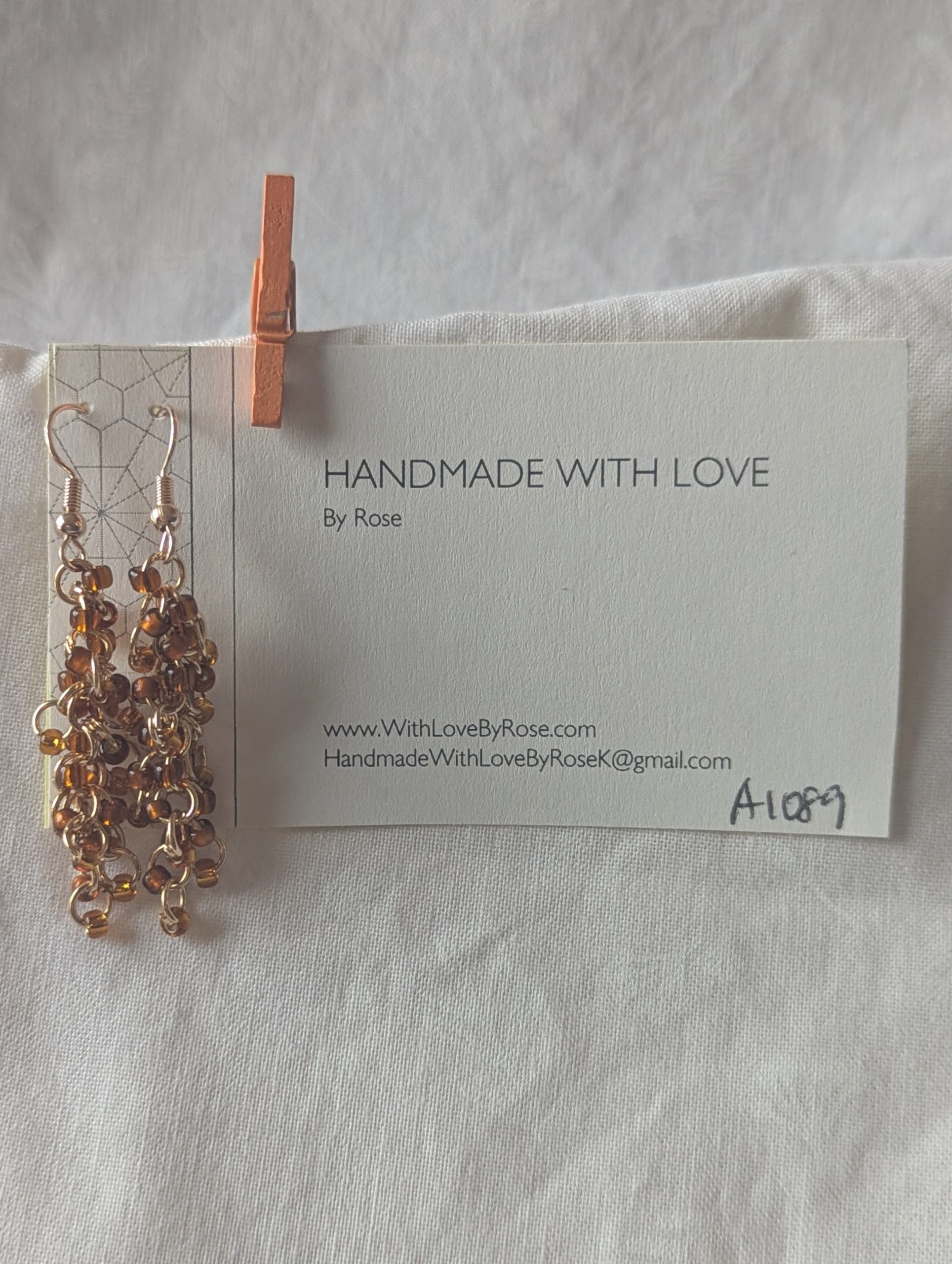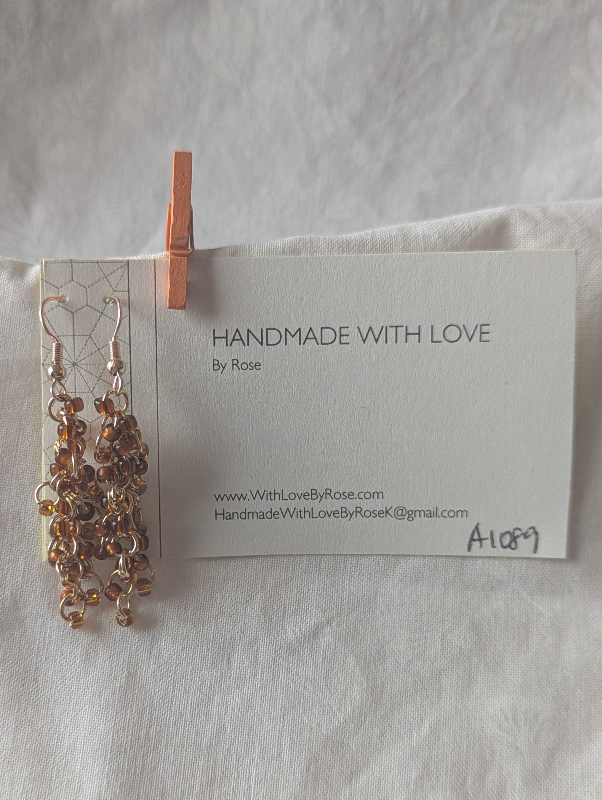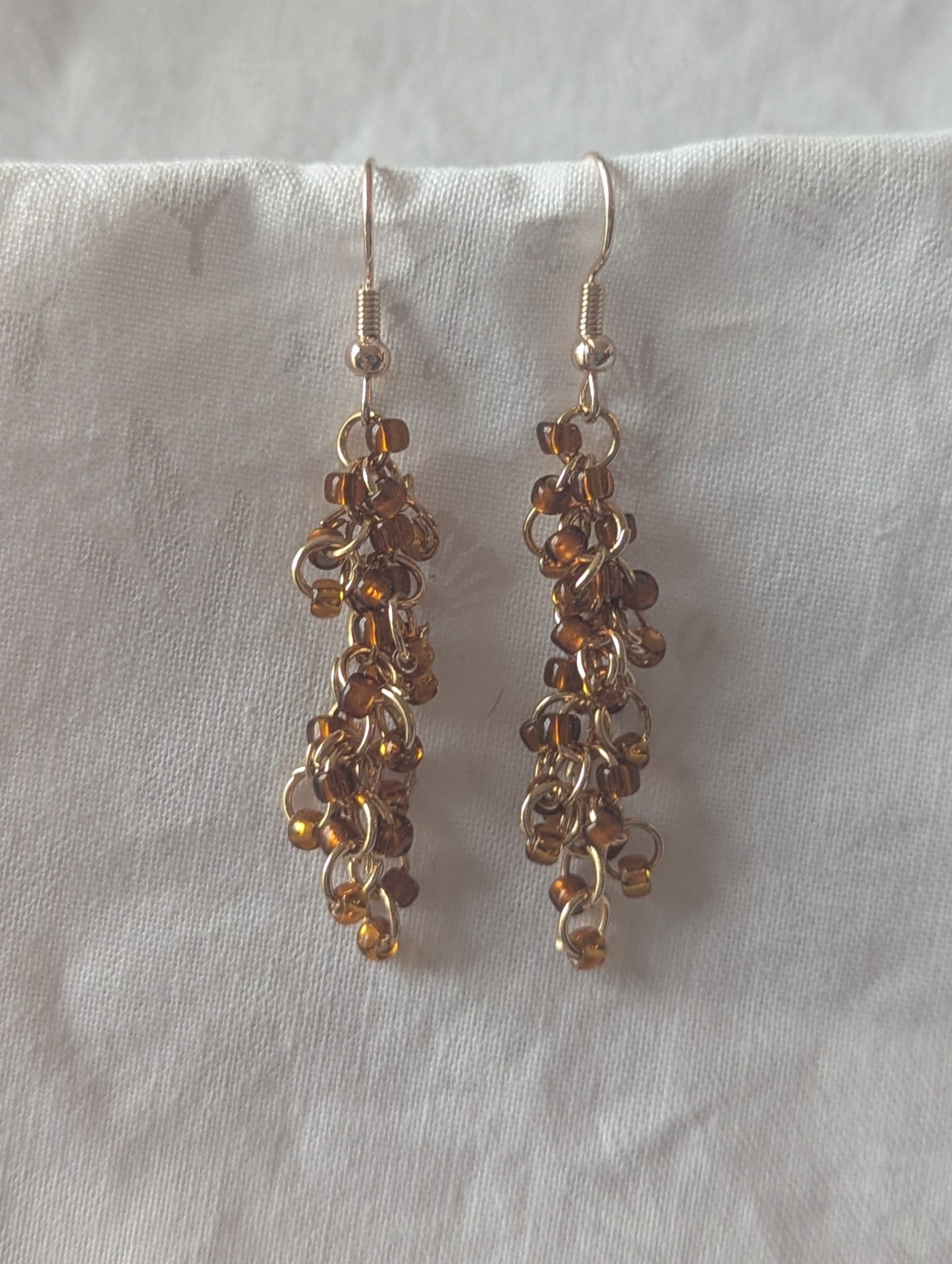 Warm, rich, and effortlessly cozy—the Golden Roast Earrings are a tribute to comforting hues and timeless style. Featuring 27 beads—nine each in clear brown, silver-lined brown, and pearly brown—this design evokes the tones of freshly brewed coffee and golden autumn leaves. Gold-colored jump rings and matching earring hooks add a luxurious finish, making these earrings perfect for lovers of earthy neutrals with a hint of glow.
