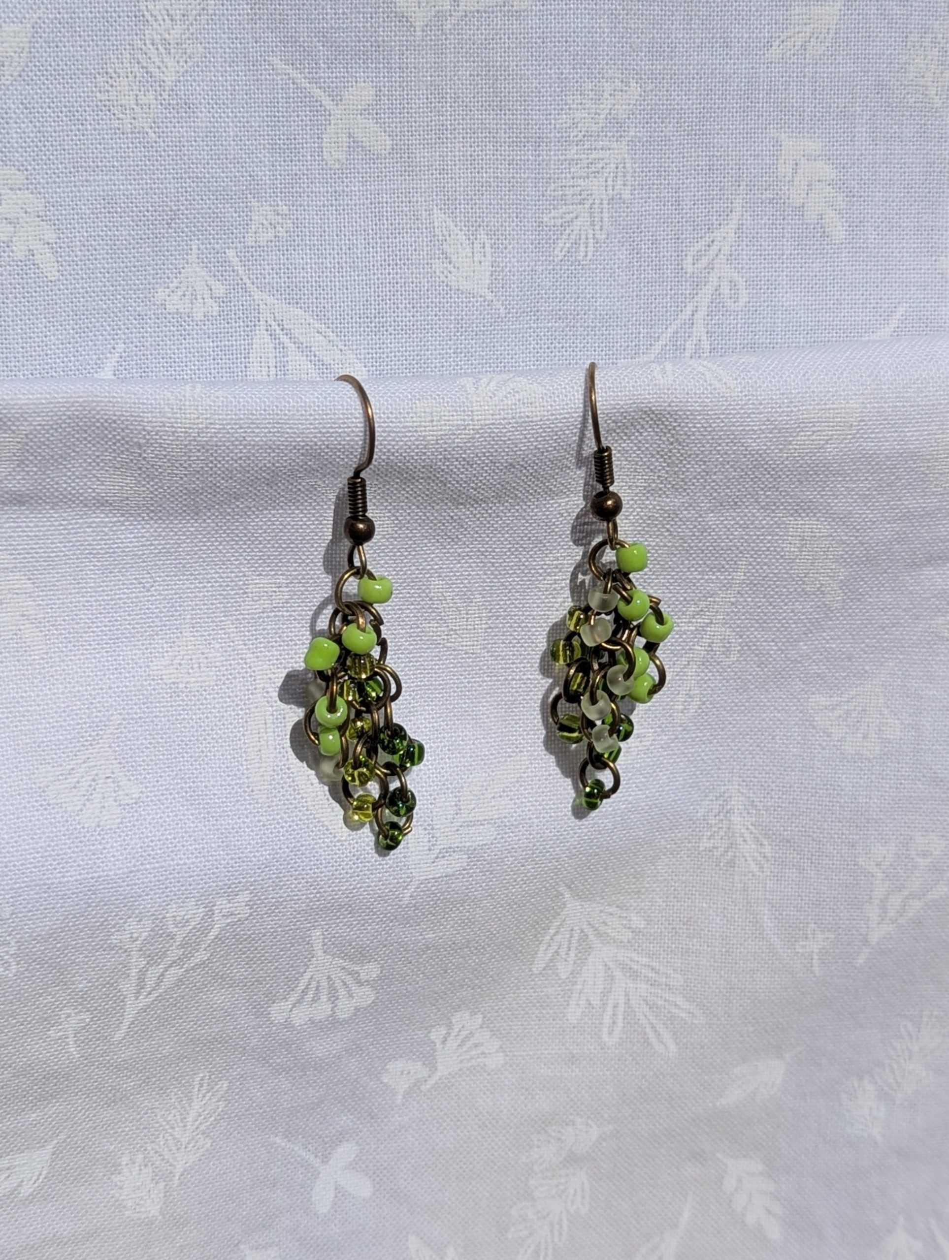 Add a subtle yet vibrant touch to your style with these green gradient beaded earrings, featuring four different shades of green ranging from bright to subtle. Each earring is delicately handcrafted with five glass seed bead per shade, linked together with bronze-colored jump rings for a lightweight and playful cascading effect. Finished with bronze-colored earring hooks, these earrings are perfect for everyday wear or as a cheerful gift.