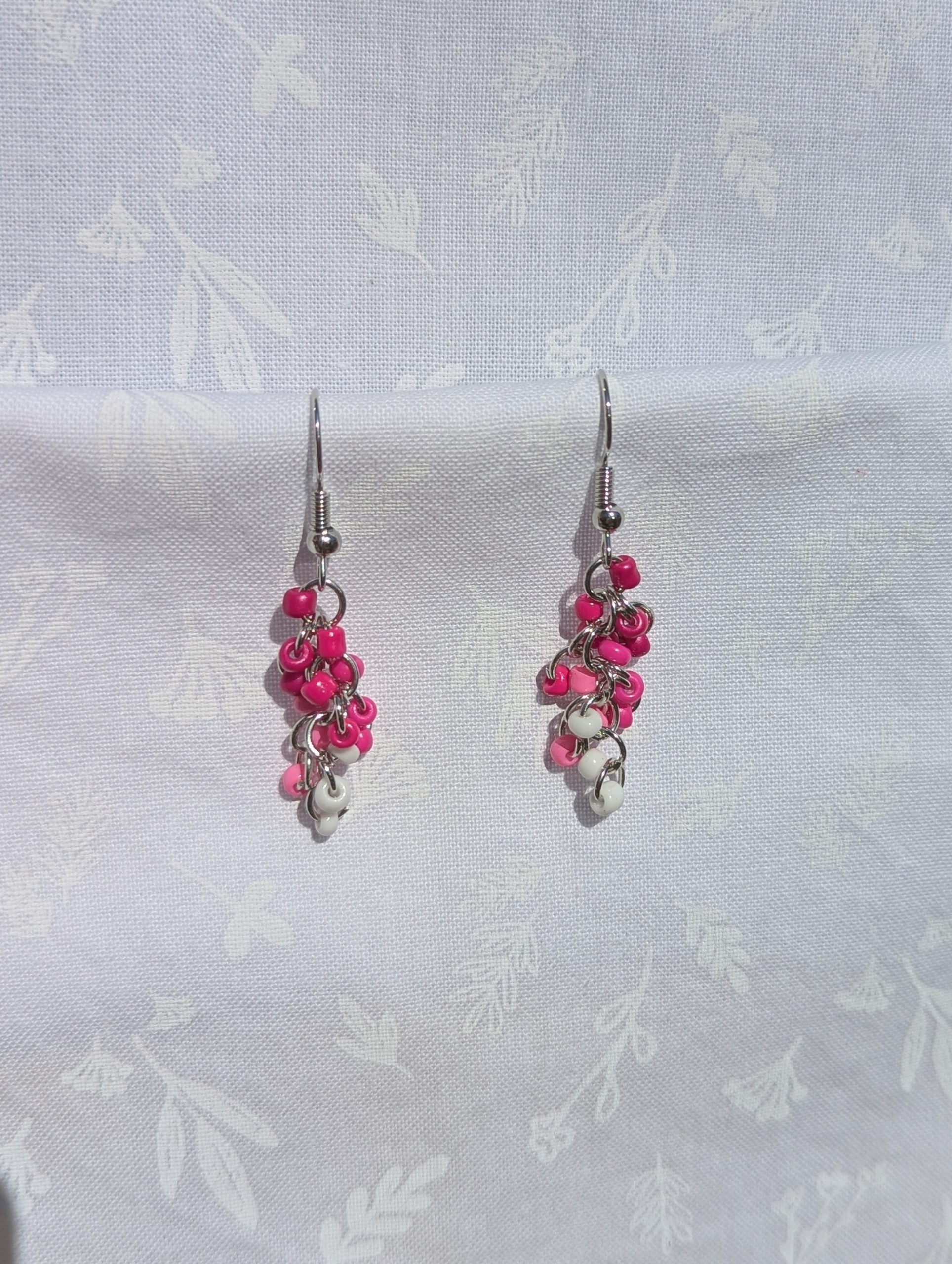 The I Love You earrings are perfect to wear on Valentine’s day.  These handmade earrings feature a stunning blend of pink and white glass seed beads, each with a solid texture. A total of 18 beads per earring—three beads per shade—cascade gracefully, creating a vibrant and eye-catching effect. The steel-colored jump rings and matching earring hooks provide a sleek, polished finish that complements elegant color palette. Perfect for adding a touch of cool energy to any outfit, these earrings are a must-have for color lovers.