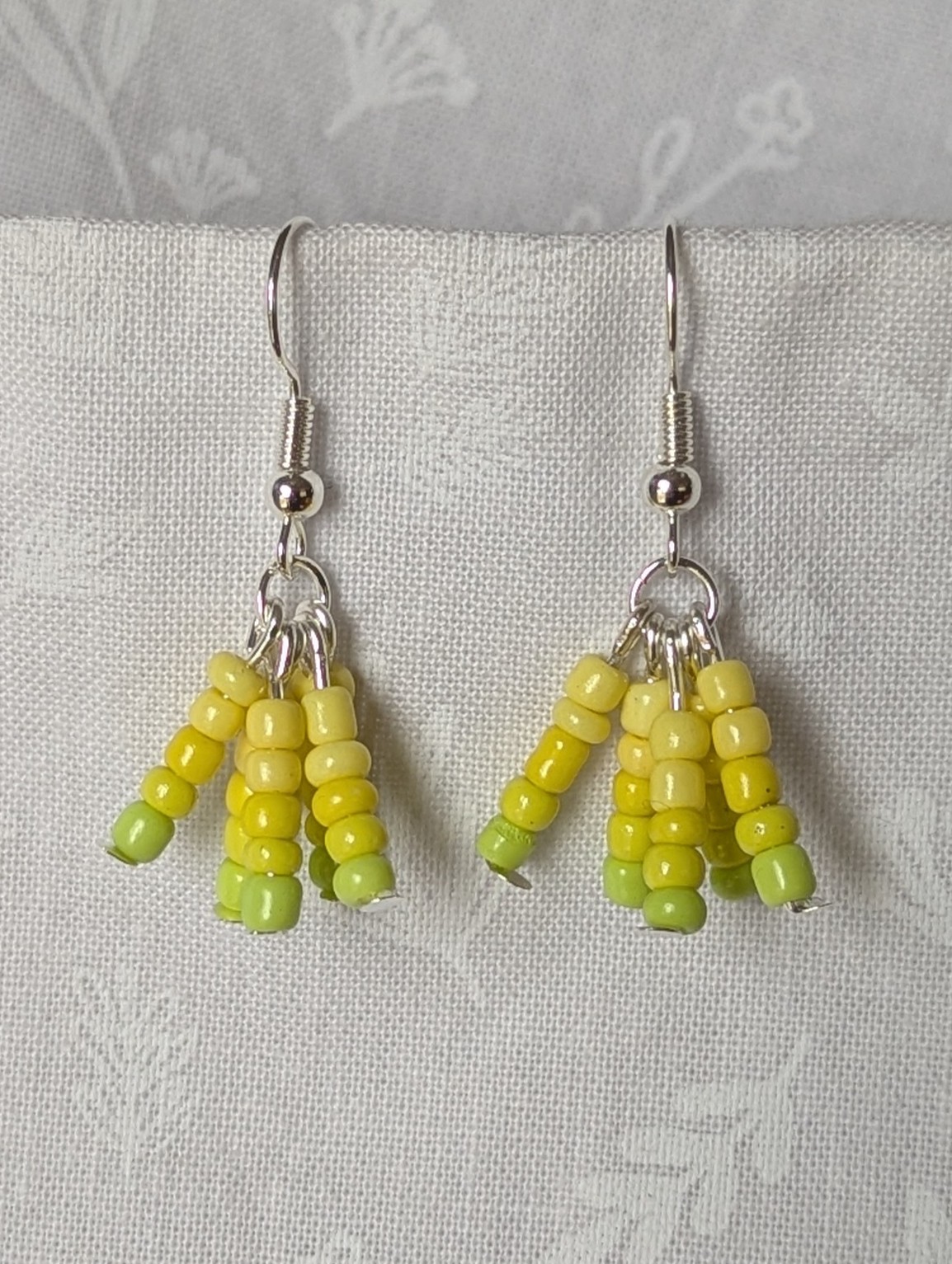 Radiate brightness with these Lemon Glow yellow gradient earrings. Each earring features 25 glass beads in five glowing shades of yellow: pale lemon, creamy butter, honey gold, amber, and rich marigold. The yellow gradient earrings are arranged in strings of five, suspended from silver-colored posts and finished with silver jump rings and hooks. These yellow gradient earrings are perfect for adding cheerful warmth to any look.