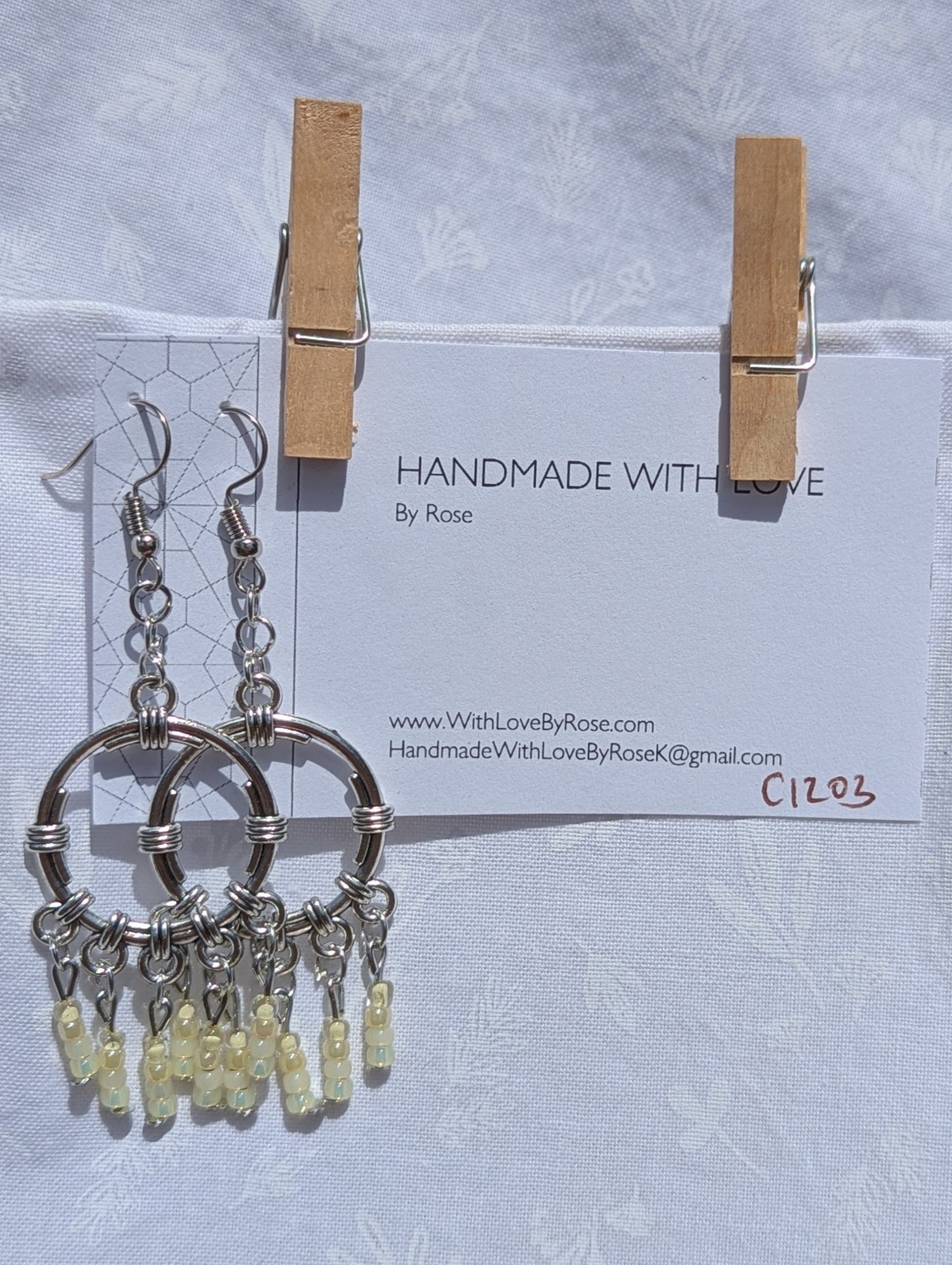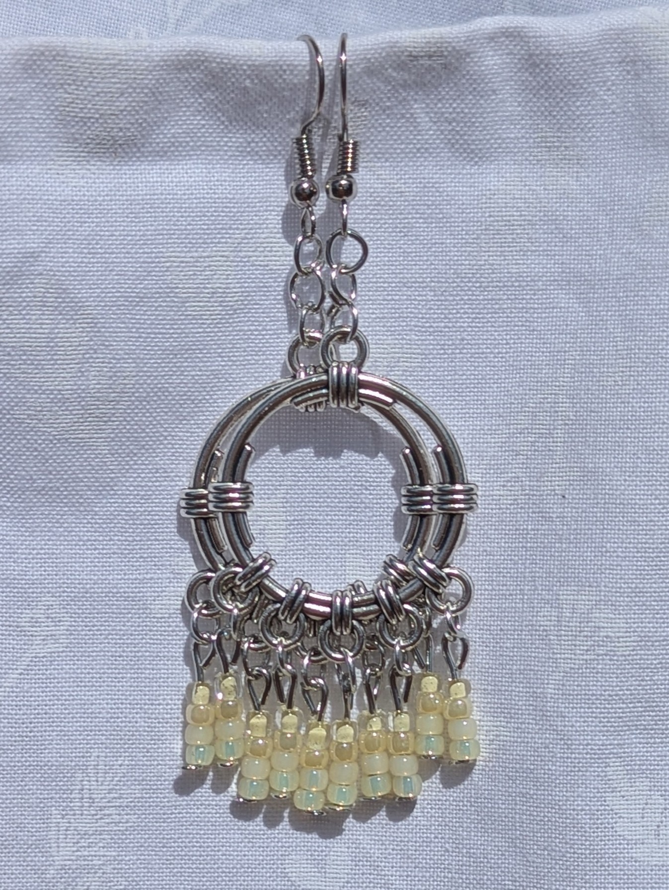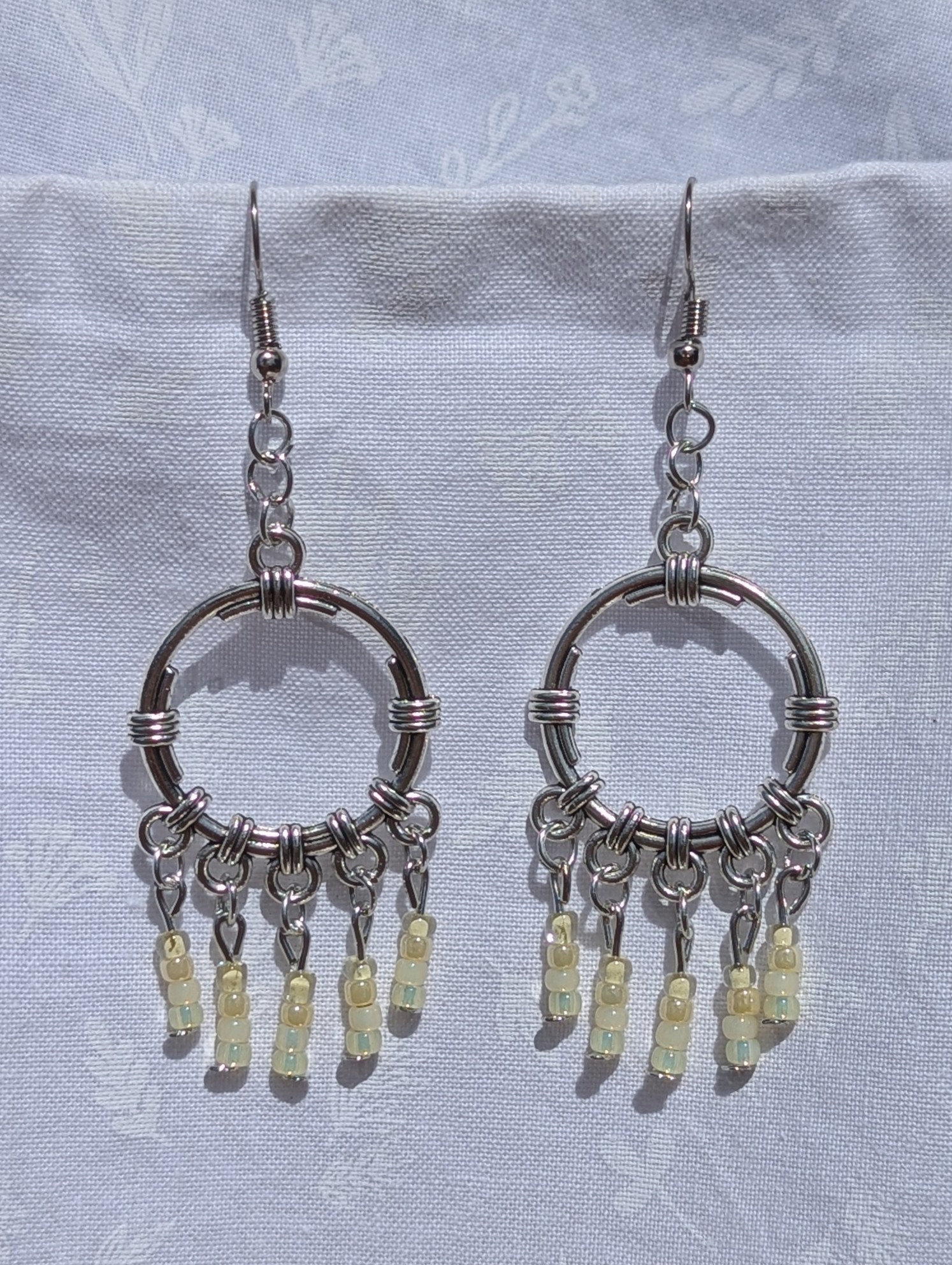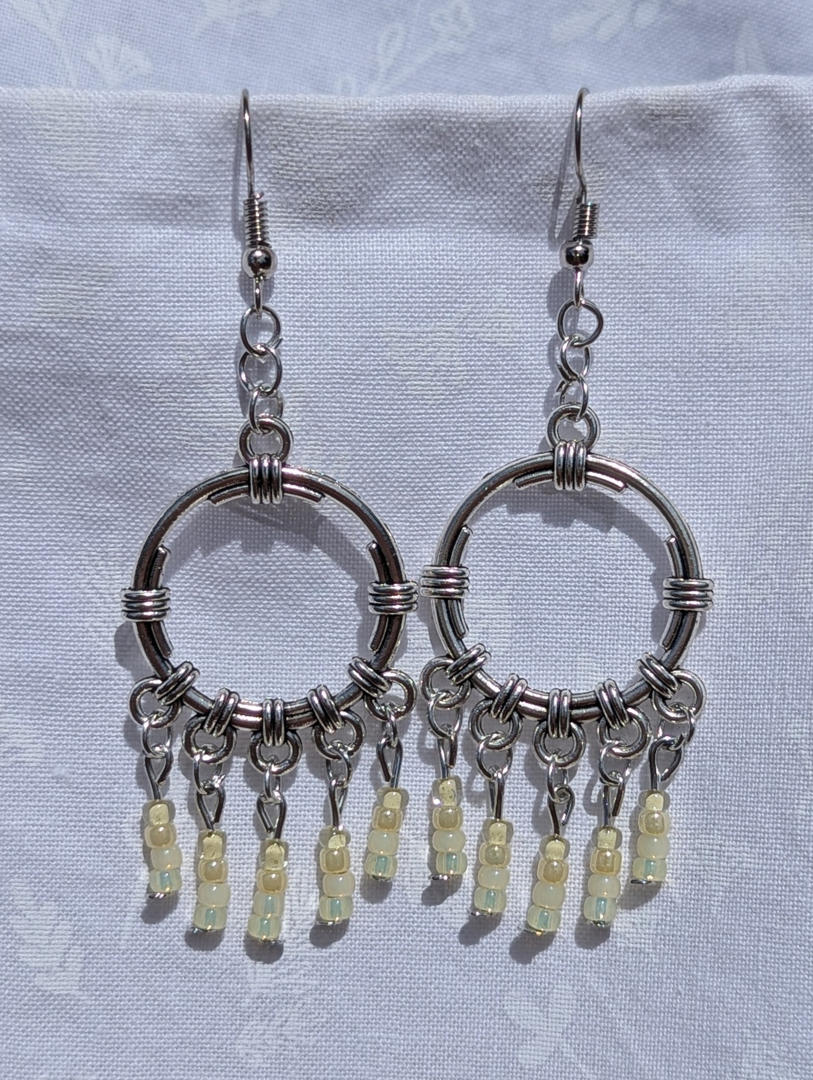 Delicate and delightful, the Lemon Meringue Glow earrings capture the subtle beauty of sunlit mornings and soft citrus tones. Each pair features a sleek silver-colored circular ornament, accented by wire-wrapped details that add a modern industrial flair. Dangling from the circle are 20 luminous glass beads in four nuanced shades: buttery cream, pale honey, translucent champagne, and icy lemon chiffon. These beads sway gently from silver-toned posts and jump rings, all gracefully suspended from matching silver earring hooks. Light, airy, and elegant—perfect for adding a gentle glow to any ensemble.