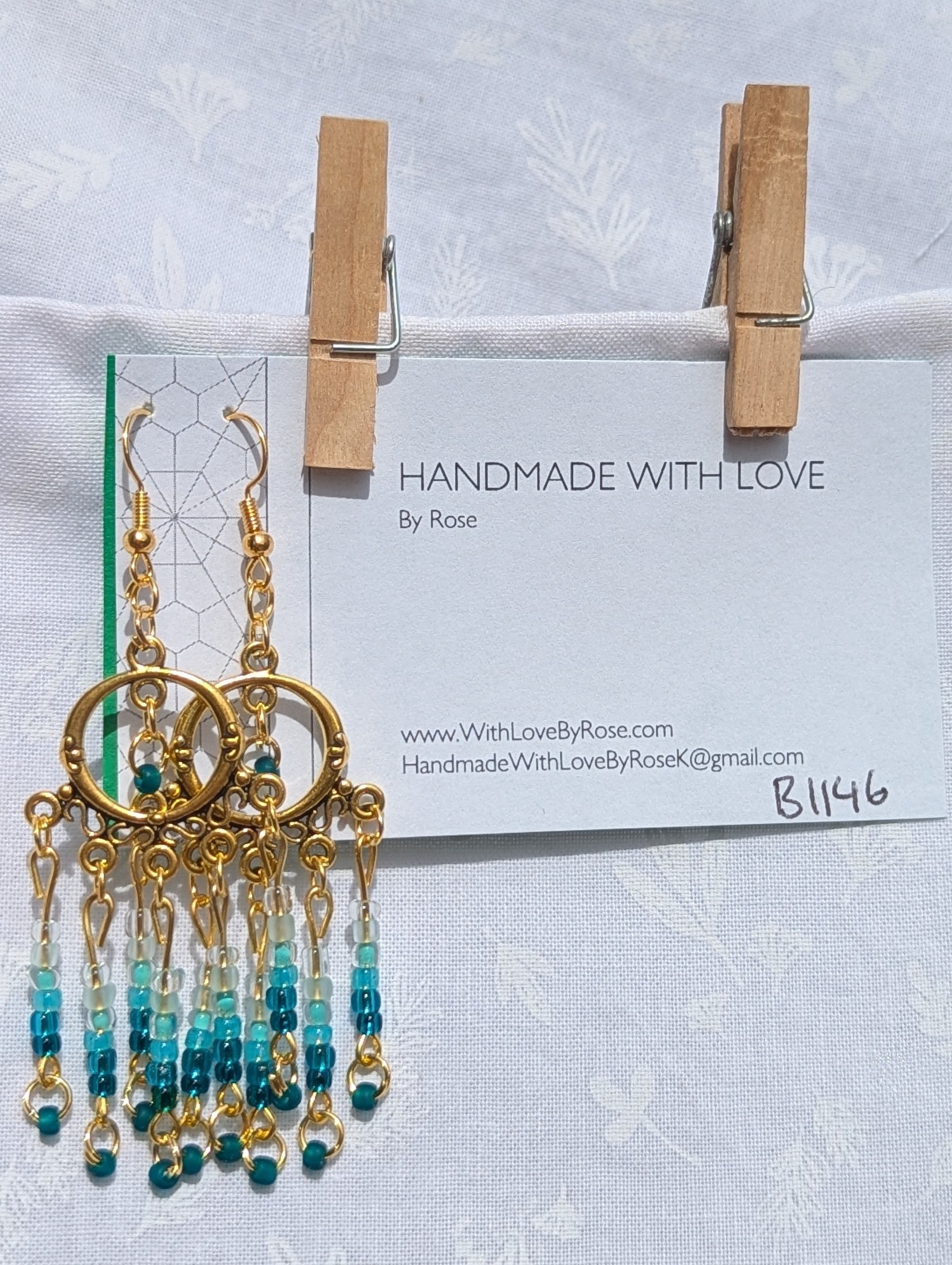 Dive into a spectrum of serenity with the Ocean Depths Chandelier Earrings. Centered around a gold-toned, ornate circular frame, each earring features 36 glass beads arranged in a mesmerizing gradient—from shimmering seafoam teal to shadowy, deep ocean hues. The beads offer a tactile journey through textures: translucent whispers, silver-lined brilliance, iridescent shimmer, frosted elegance, and jewel-toned teal-lined clarity. Suspended from gold-colored posts, jump rings, and earring hooks, these earrings embody the beauty of shifting tides and layered currents—perfect for those drawn to the mystery and depth of the sea.