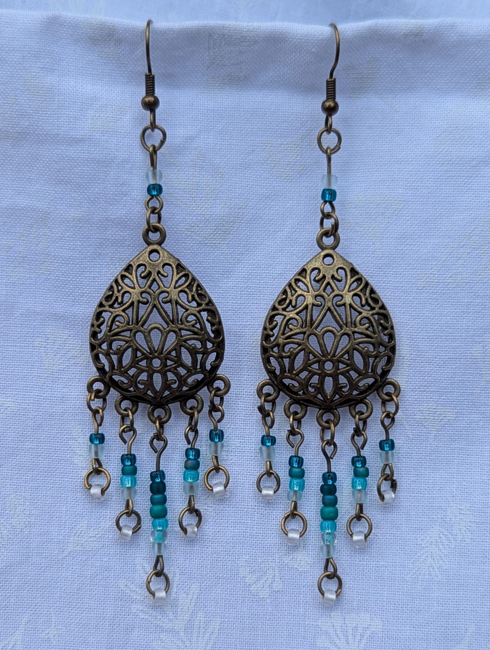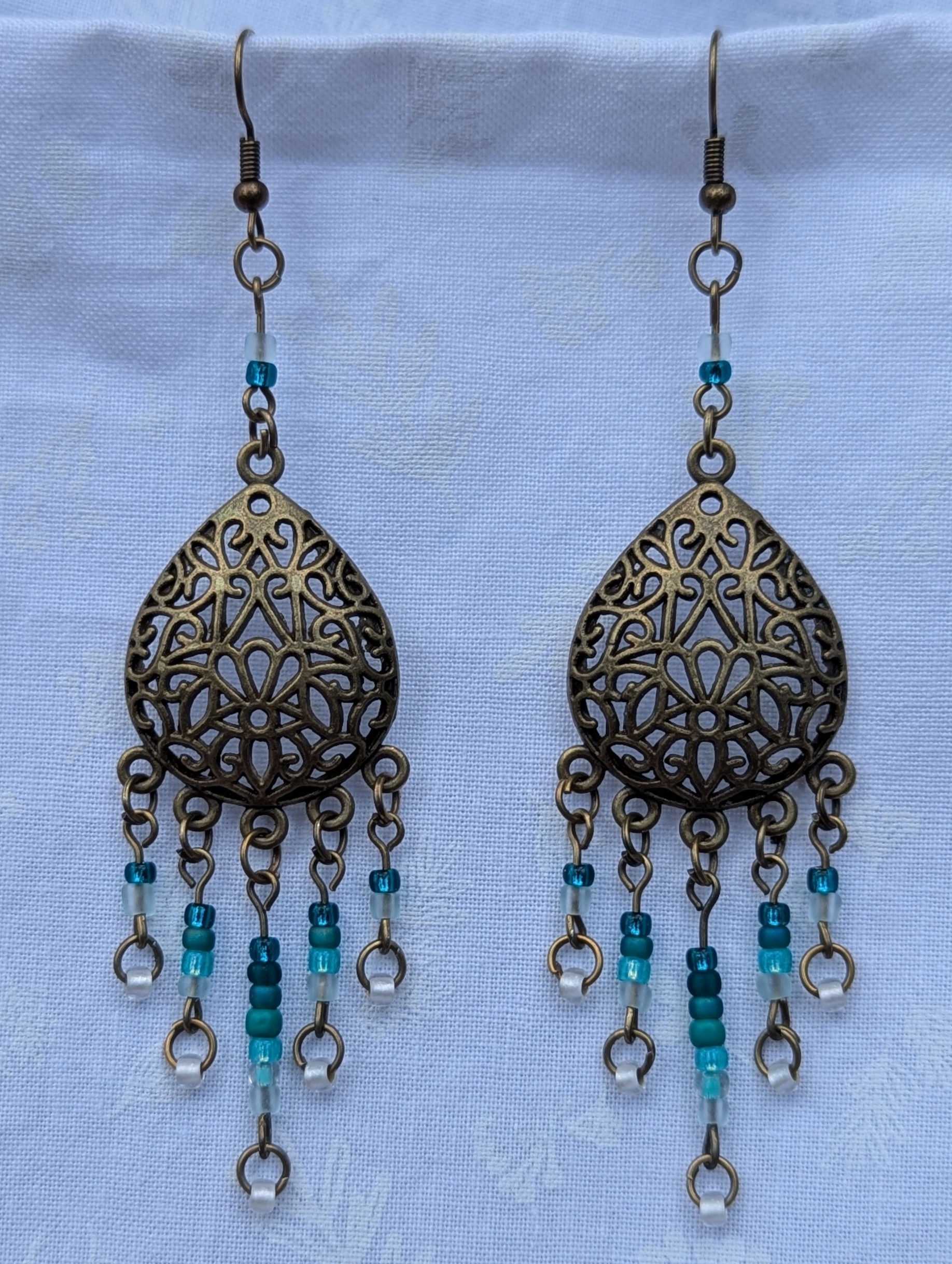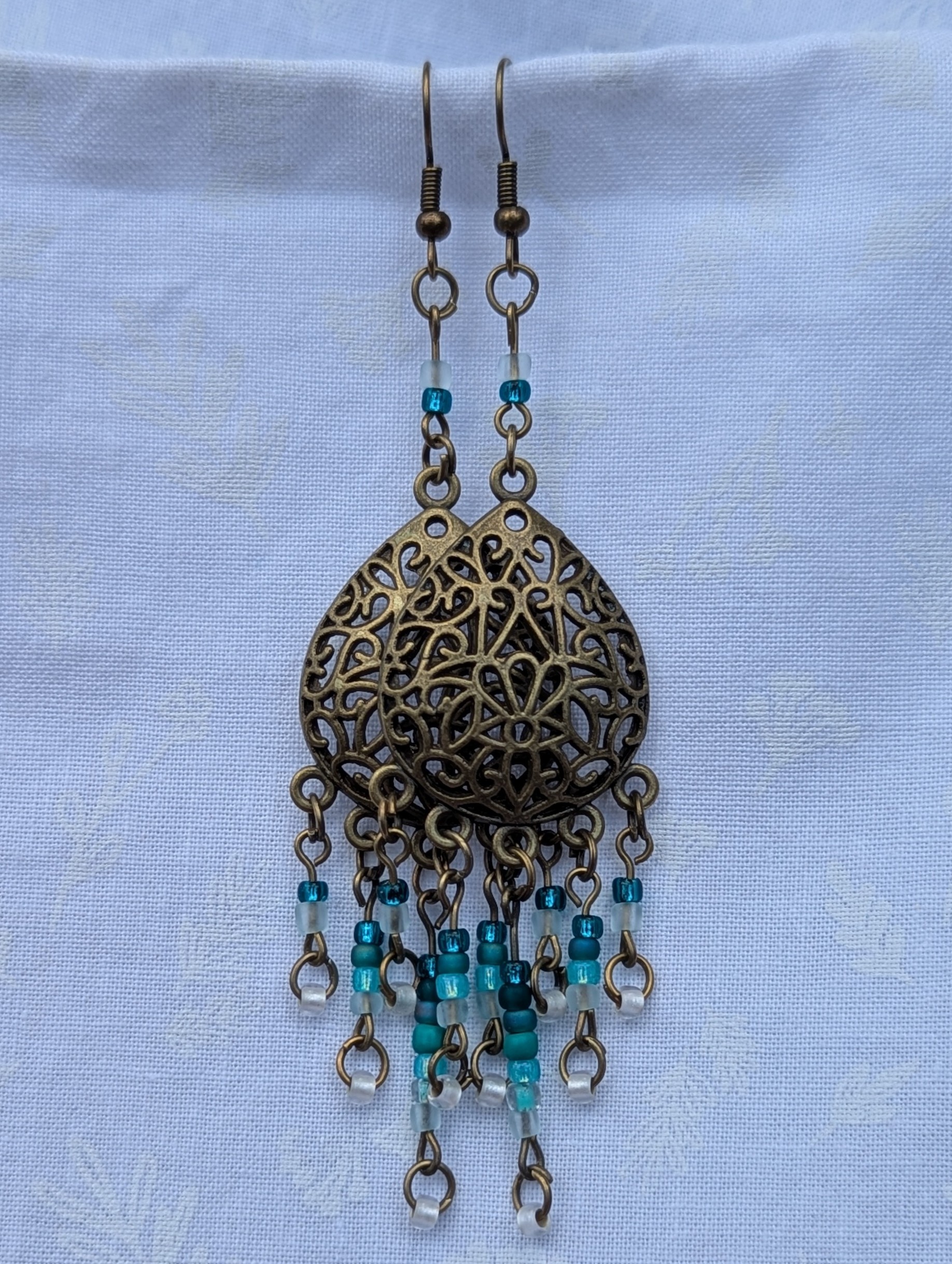 The Ocean Lace earrings feature an intricate teardrop bronze frame with five beaded strands in a striking teal gradient. From moody deep-sea teal to luminous ice blue and frosted white, these ocean-inspired earrings flow with graceful movement and rich texture. A single accent bead adds a hint of sparkle at the top of the chain. The Ocean Lace earrings bring vintage flair to a modern palette. Part of the Mystic Tides Collection.