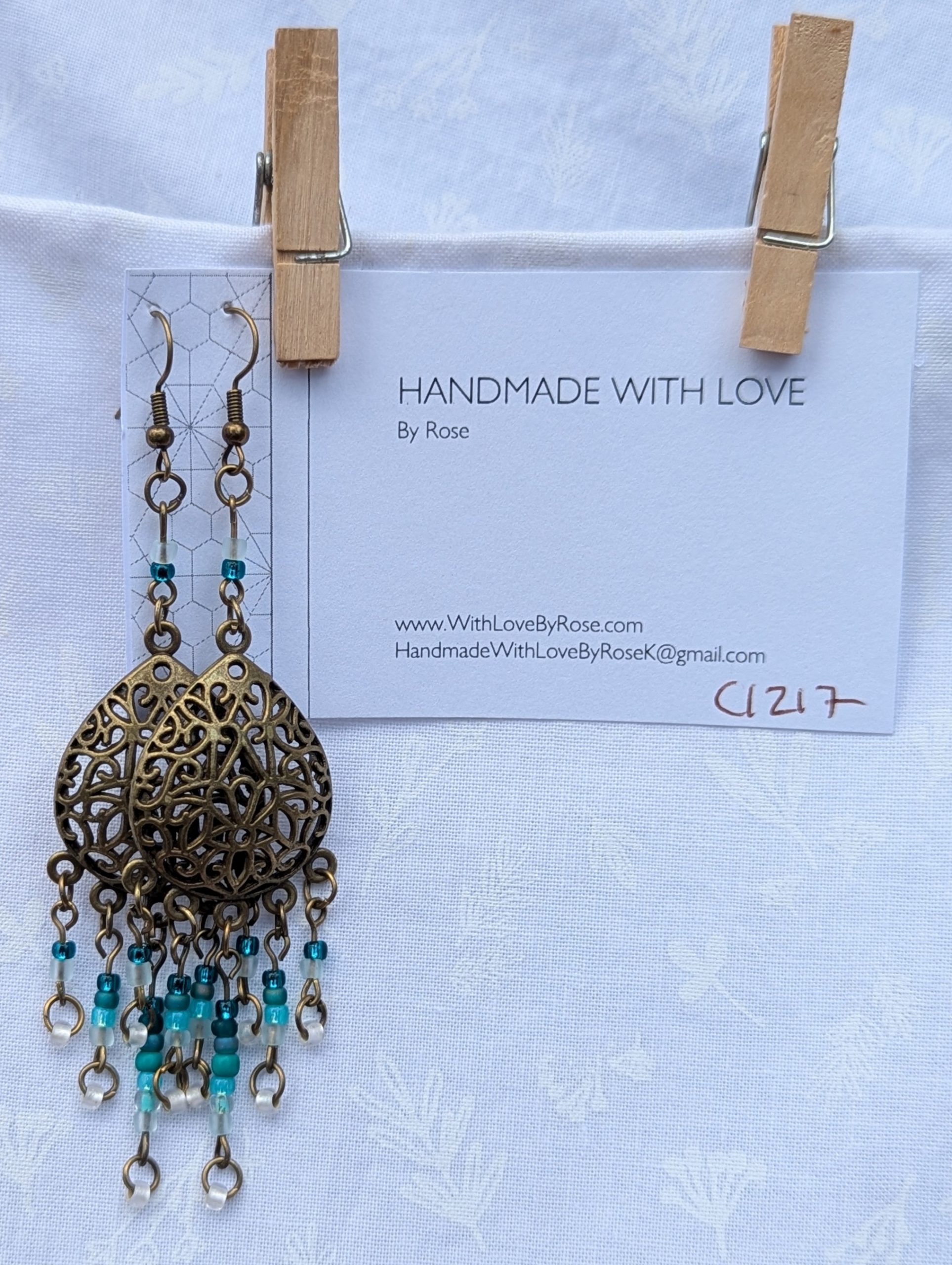 The Mystic Tides Collection is a celebration of oceanic elegance and antique charm. Each pair of earrings features a striking teal gradient made from 8 stunning hues—ranging from deep sea green to frosted white—delicately suspended from ornate bronze-toned Tibetan-style ornaments. These earrings evoke the rhythm and mystery of tides, adding a splash of timeless color to any outfit.