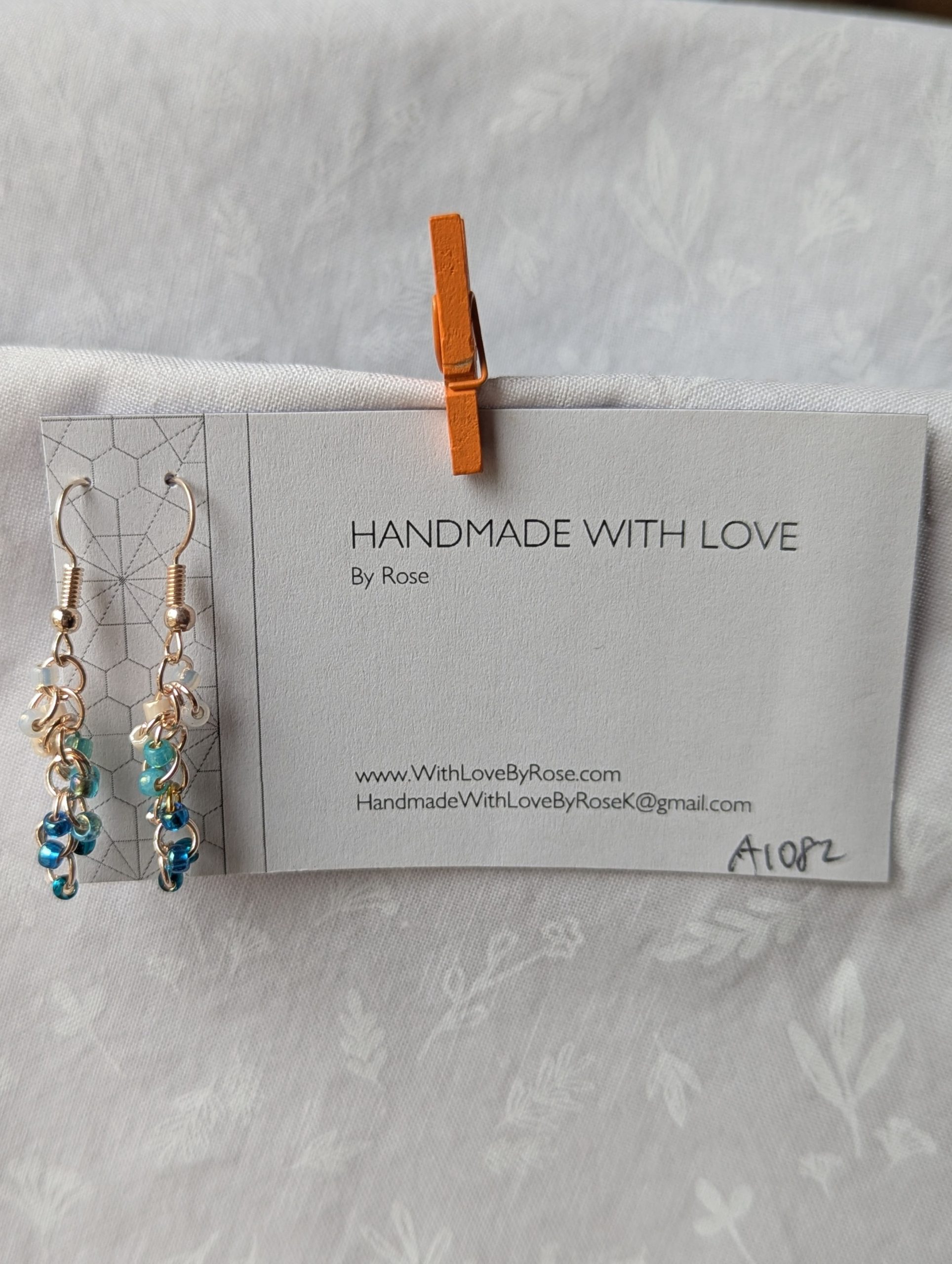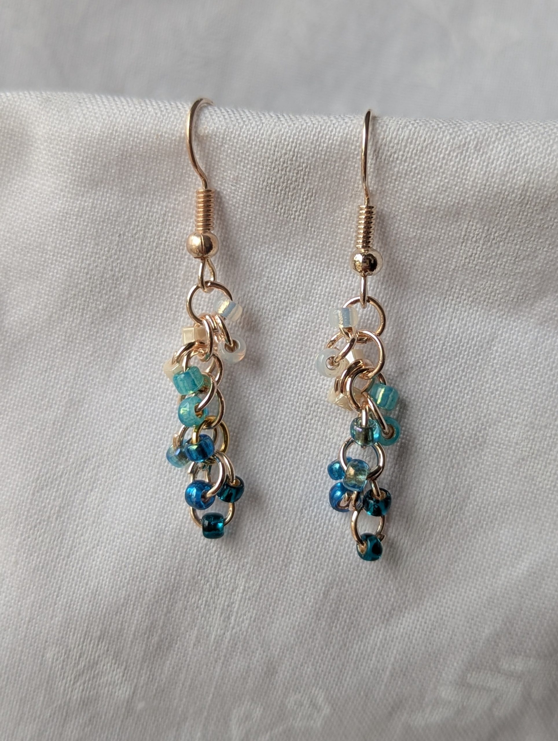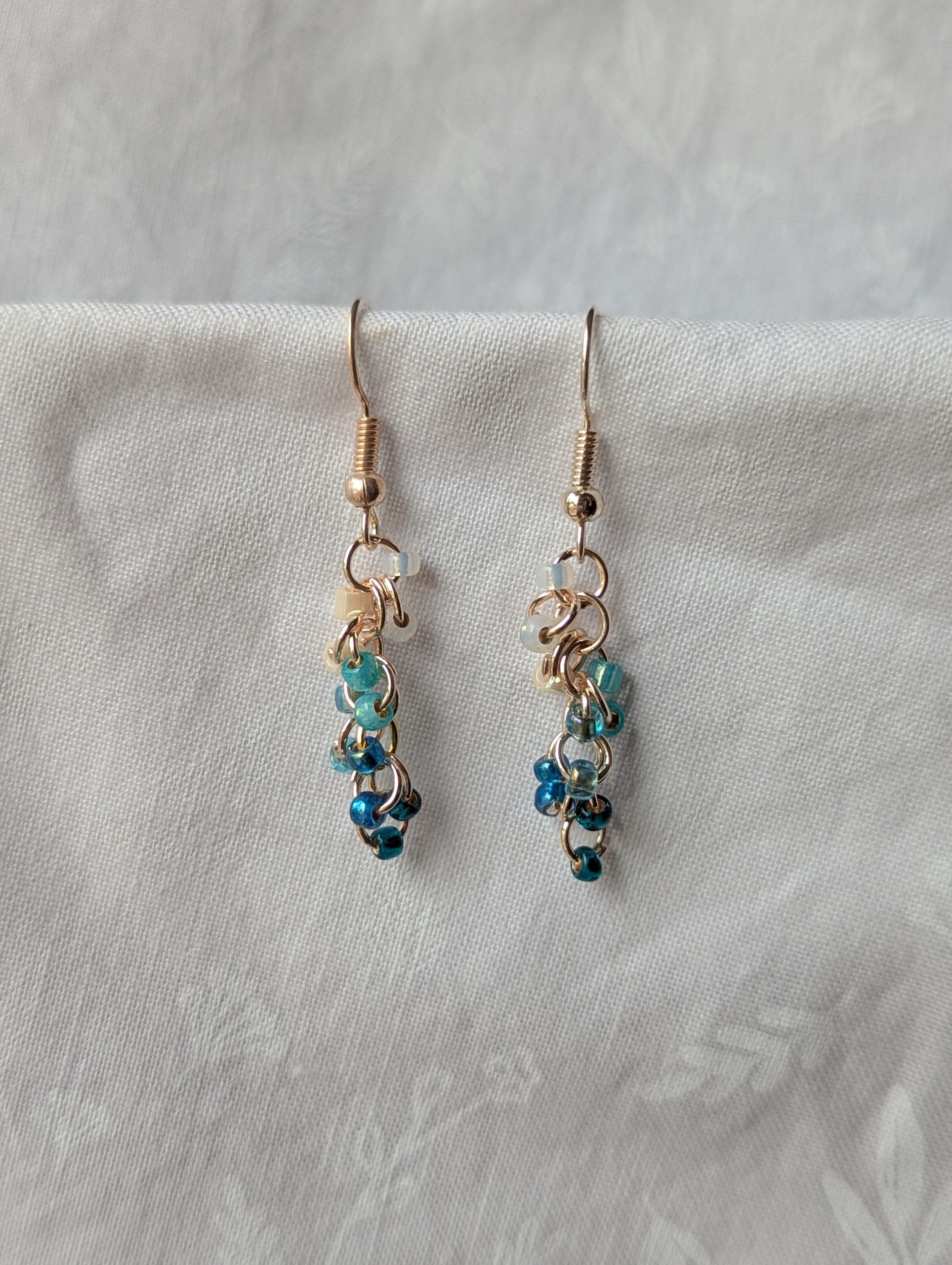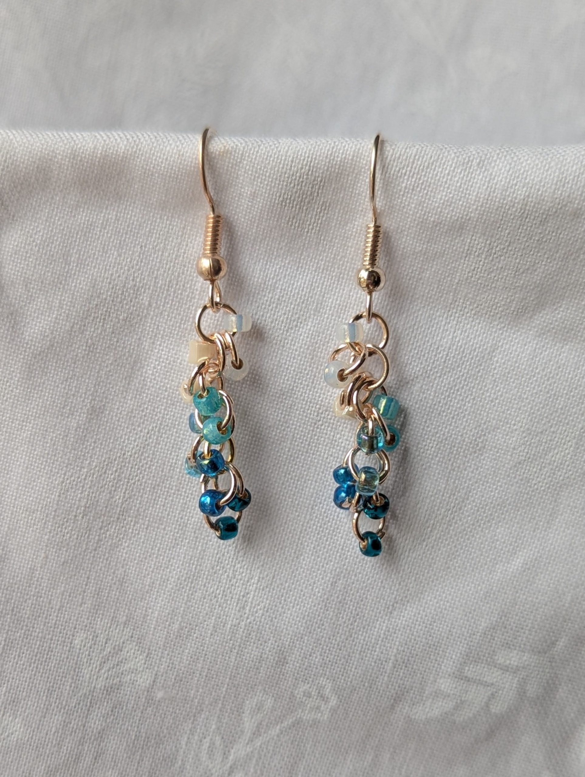 Like waves rolling across a shifting sea, the Ocean Tide Earrings blend cool tones with graceful movement. Featuring 14 beads—two each in clear, matte gray, pearly blue/gray, iridescent blue, metallic blue, matte deep blue, and solid indigo—these earrings evoke the rhythm and depth of the ocean. Each bead is carefully arranged and connected with gold-colored jump rings and matching earring hooks, creating a rich, layered design that flows as effortlessly as the tide.