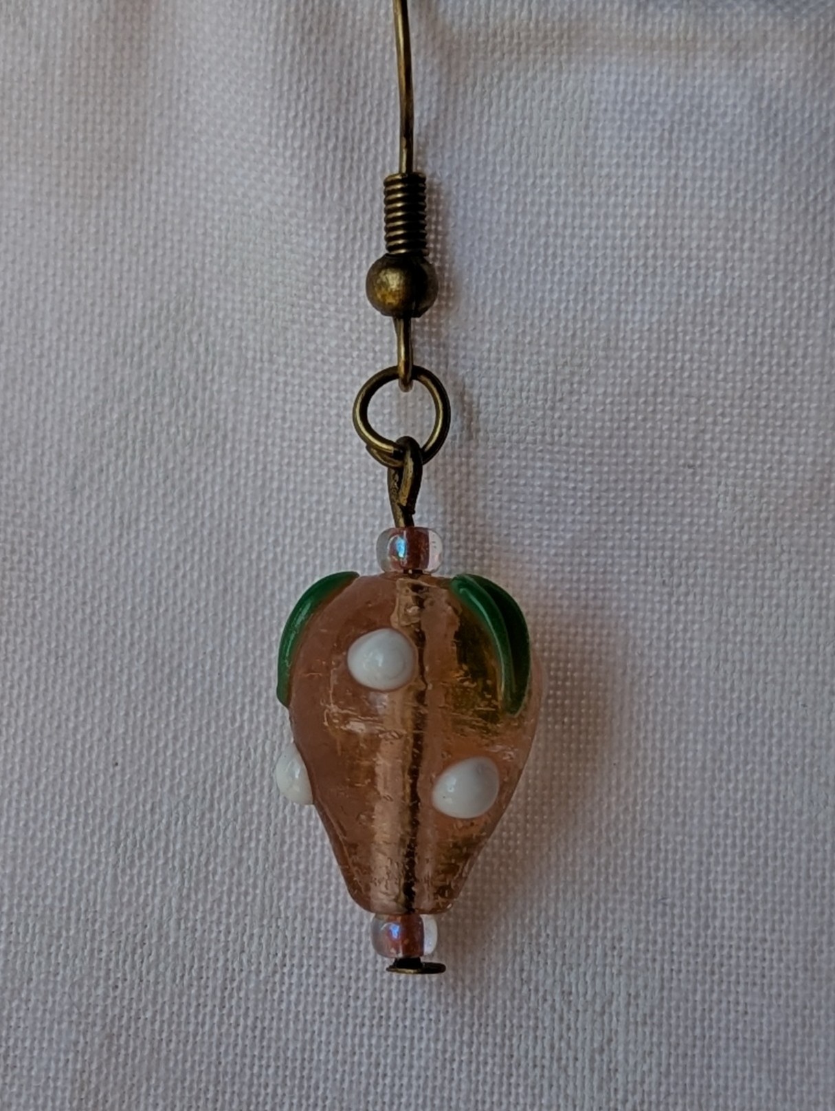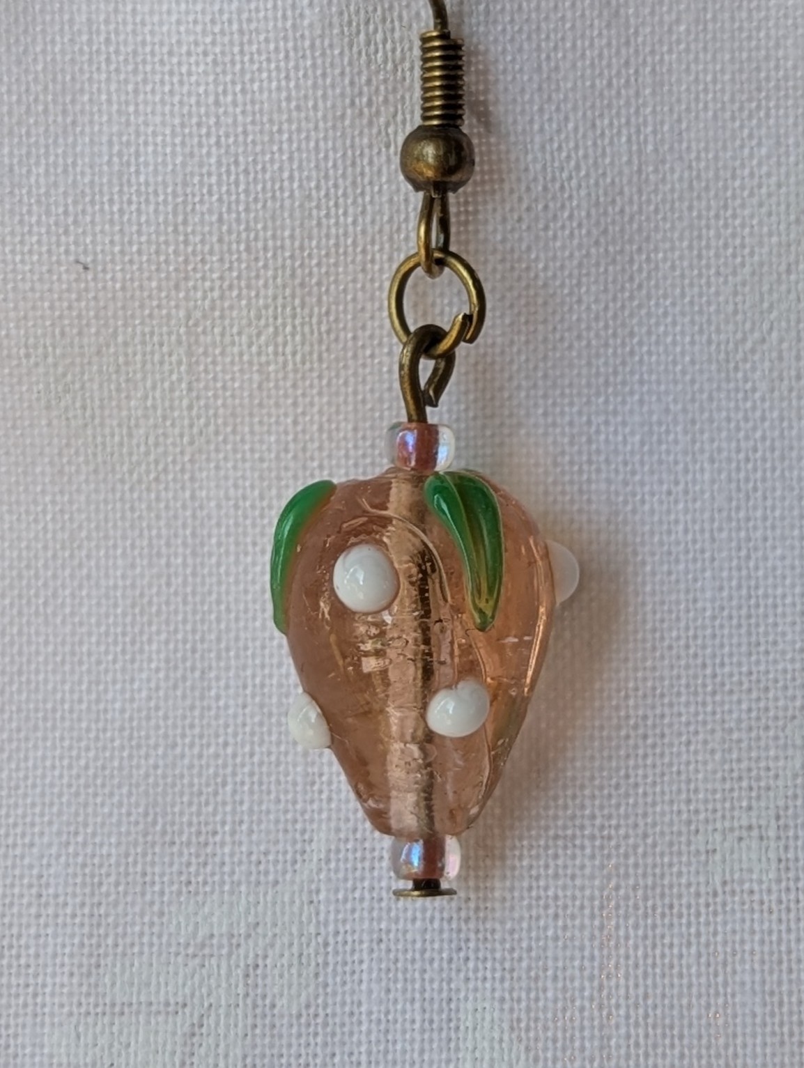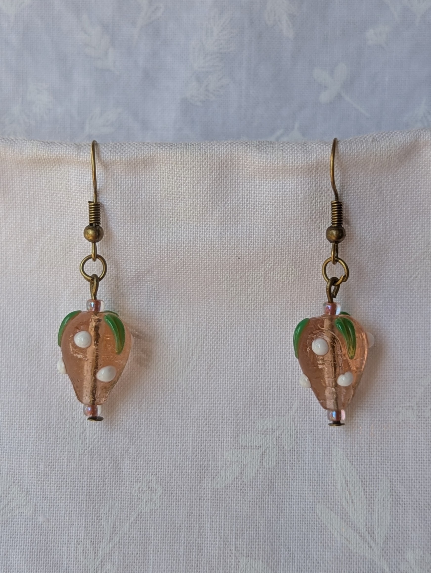 These charming sweet strawberry earrings feature hand-crafted glass beads shaped like pal pink strawberries with glossy green leaves and bright white accents. Each strawberry bead is carefully detailed to capture the sweetness of summer fruit. The earrings are connected with bronze-colored jump rings and hung from matching hooks for a polished finish. Perfect for anyone who loves playful, fruity jewelry, these earrings bring a cheerful pop of summer sweetness to any outfit.