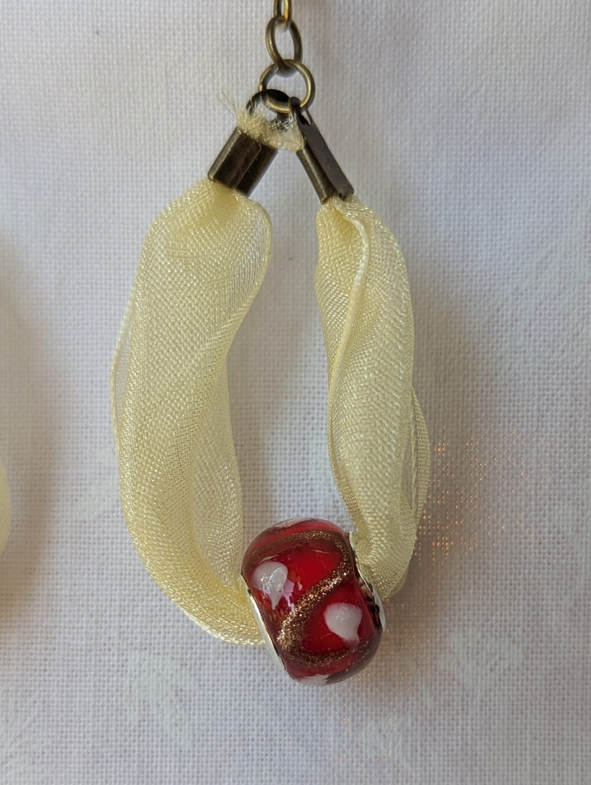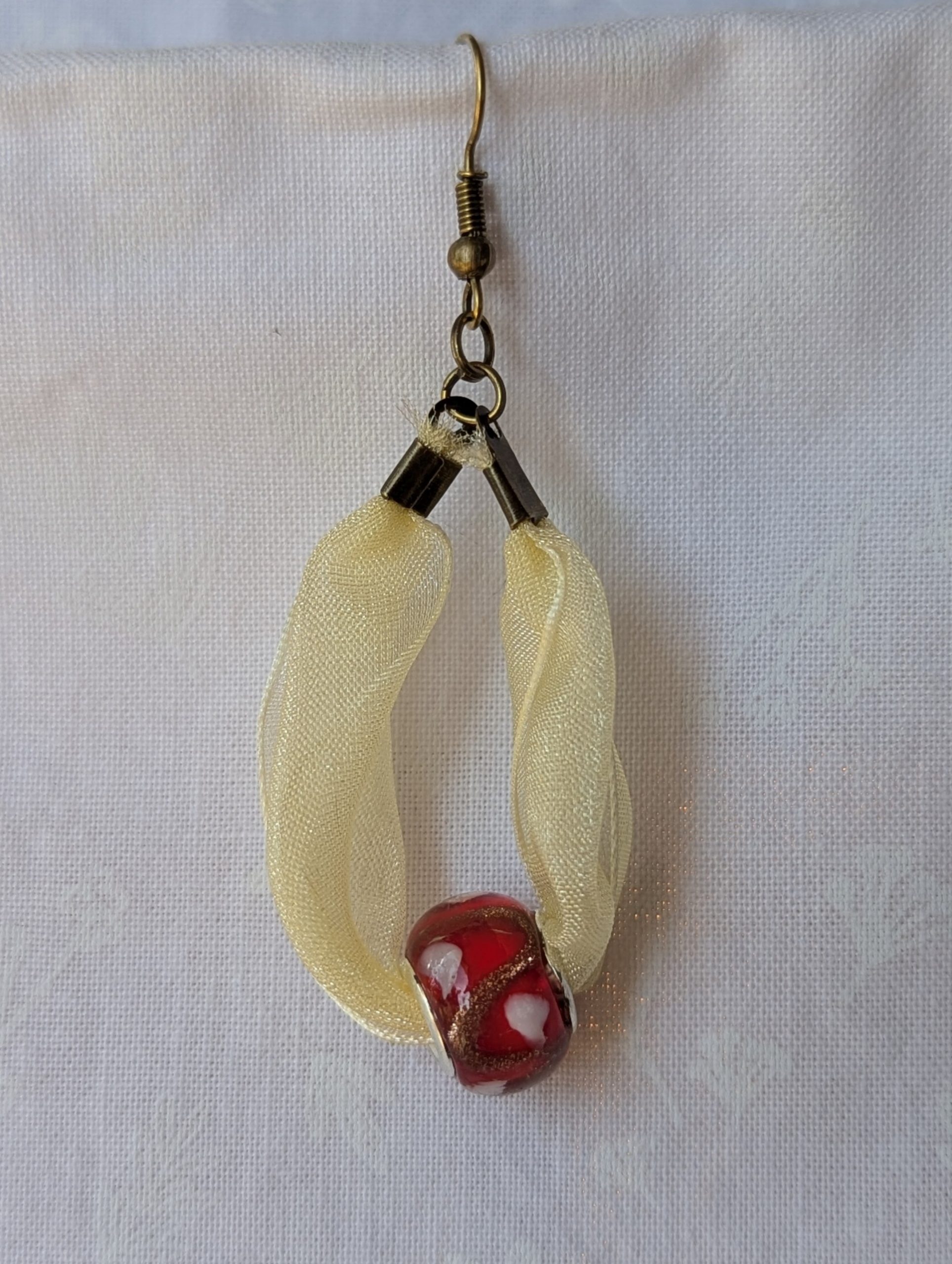 These Pale Yellow Ribbon Earrings feature a unique blend of texture and color, combining the shimmer of glass with the softness of fabric. Each earring showcases a lampwork style red bead detailed with delicate shimmering gold accents. The bead is looped through a play yellow ribbon that drapes naturally, creating an elegant, artistic flow.