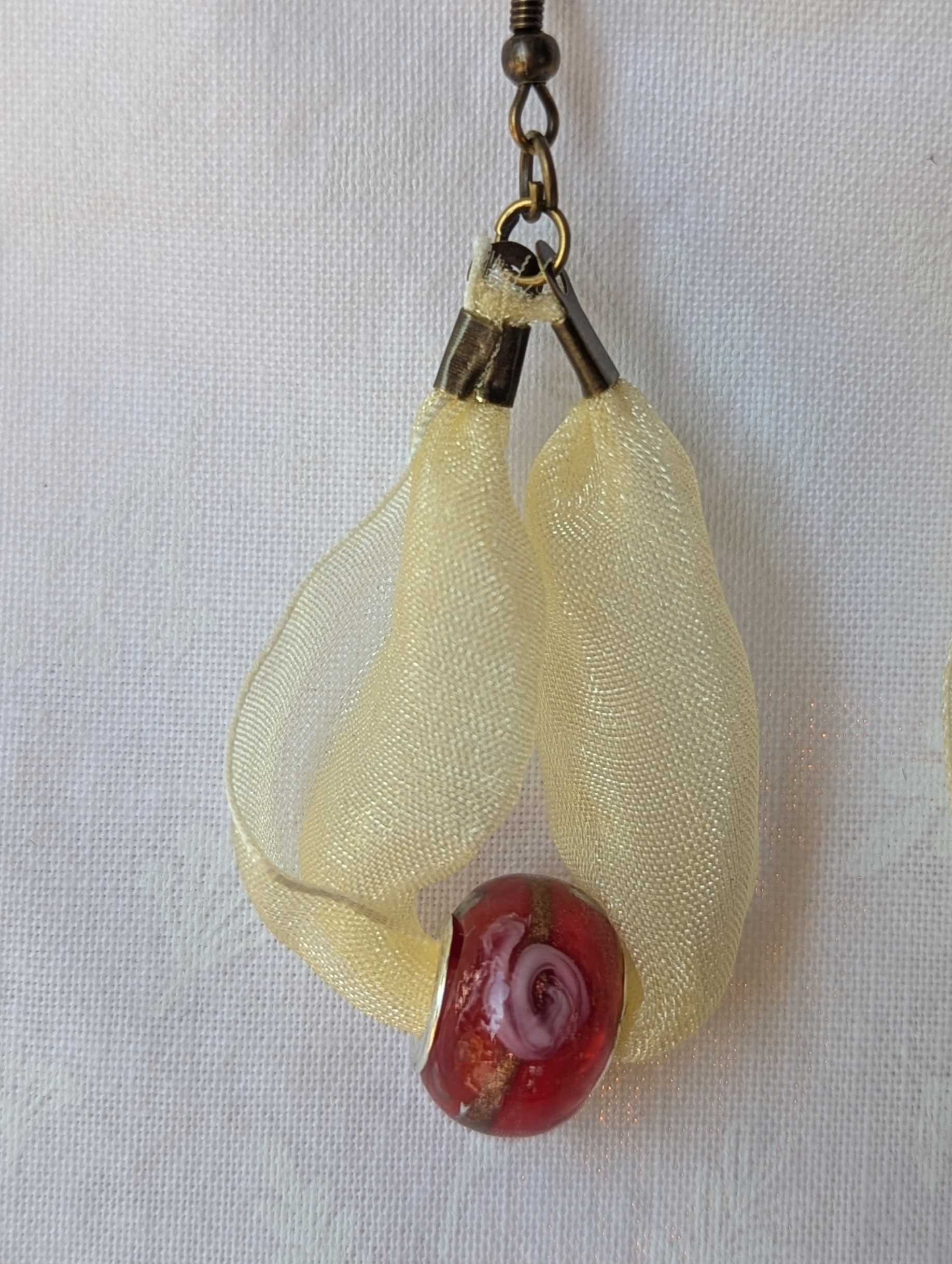 Pale Yellow Ribbon and Red and Gold Glass Bead Earrings