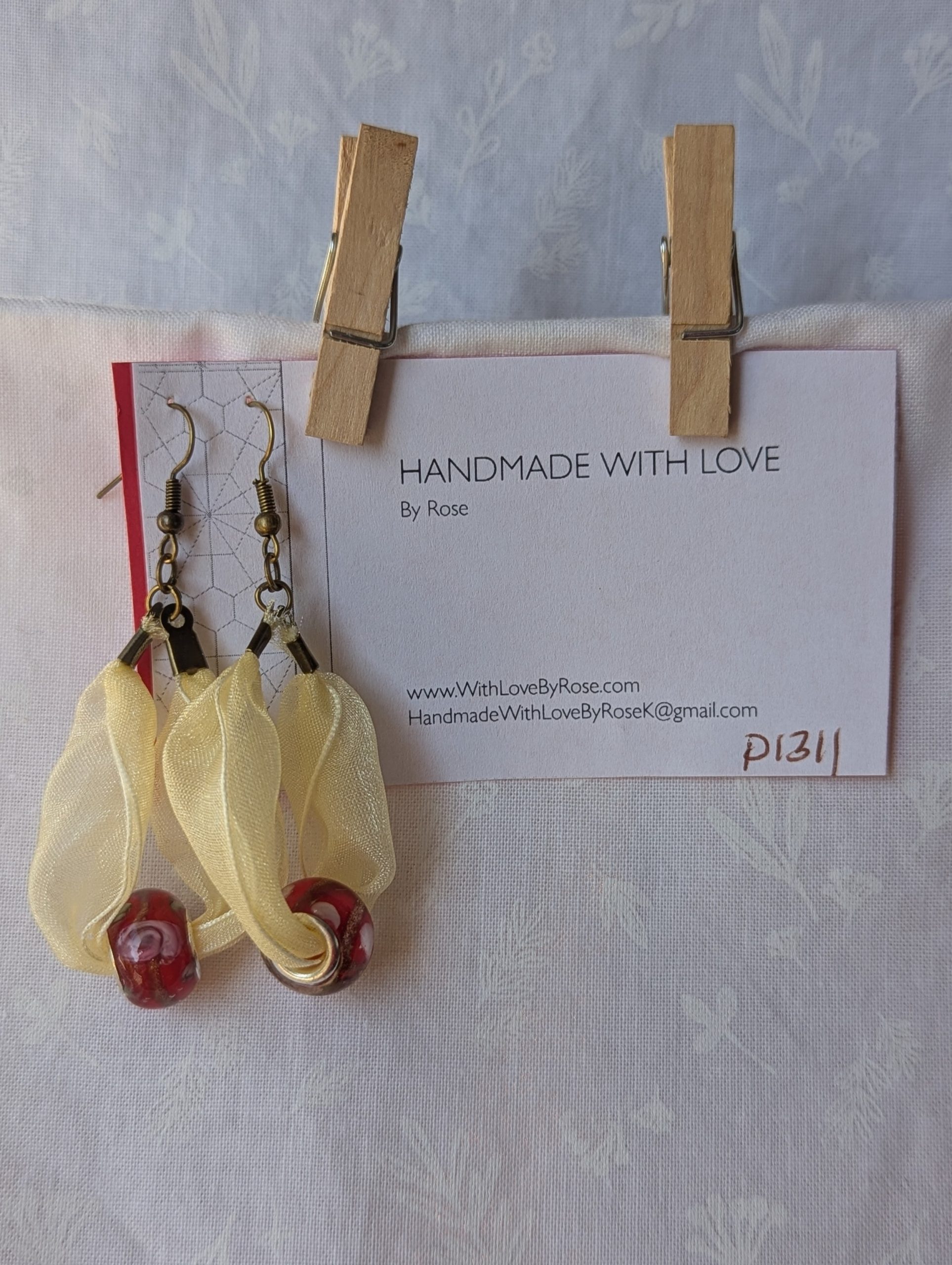 Be the first to review “Pale Yellow Ribbon and Red and Gold Glass Bead Earrings”