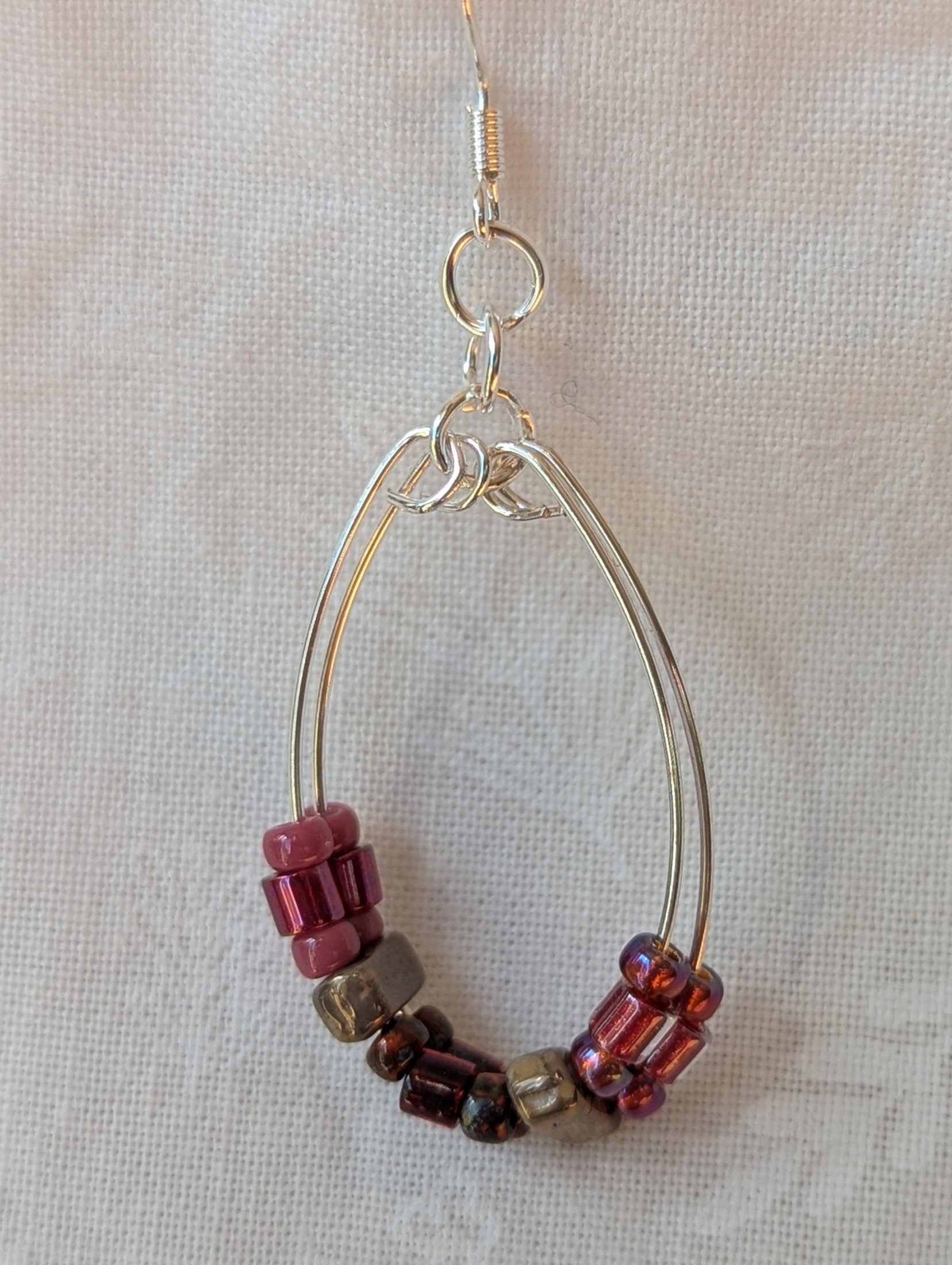 The beads are delicately strung on silver-plated wire, forming a graceful hoop teardrop shape that moves effortlessly with the wearer. Silver-colored jump rings and sterling silver hooks complete the design, adding a polished shimmer that complements the cool, monochrome palette.