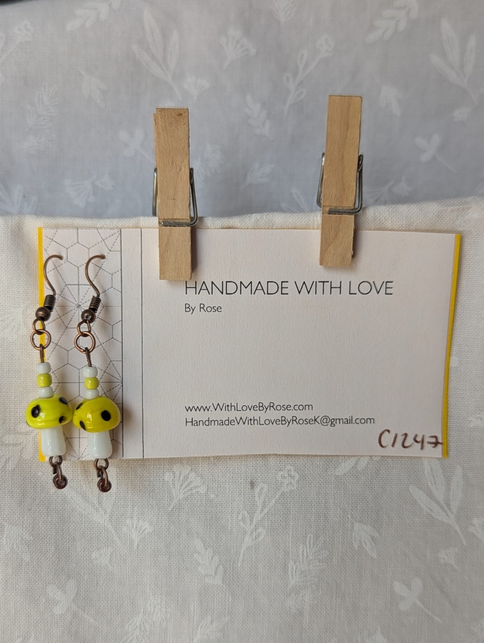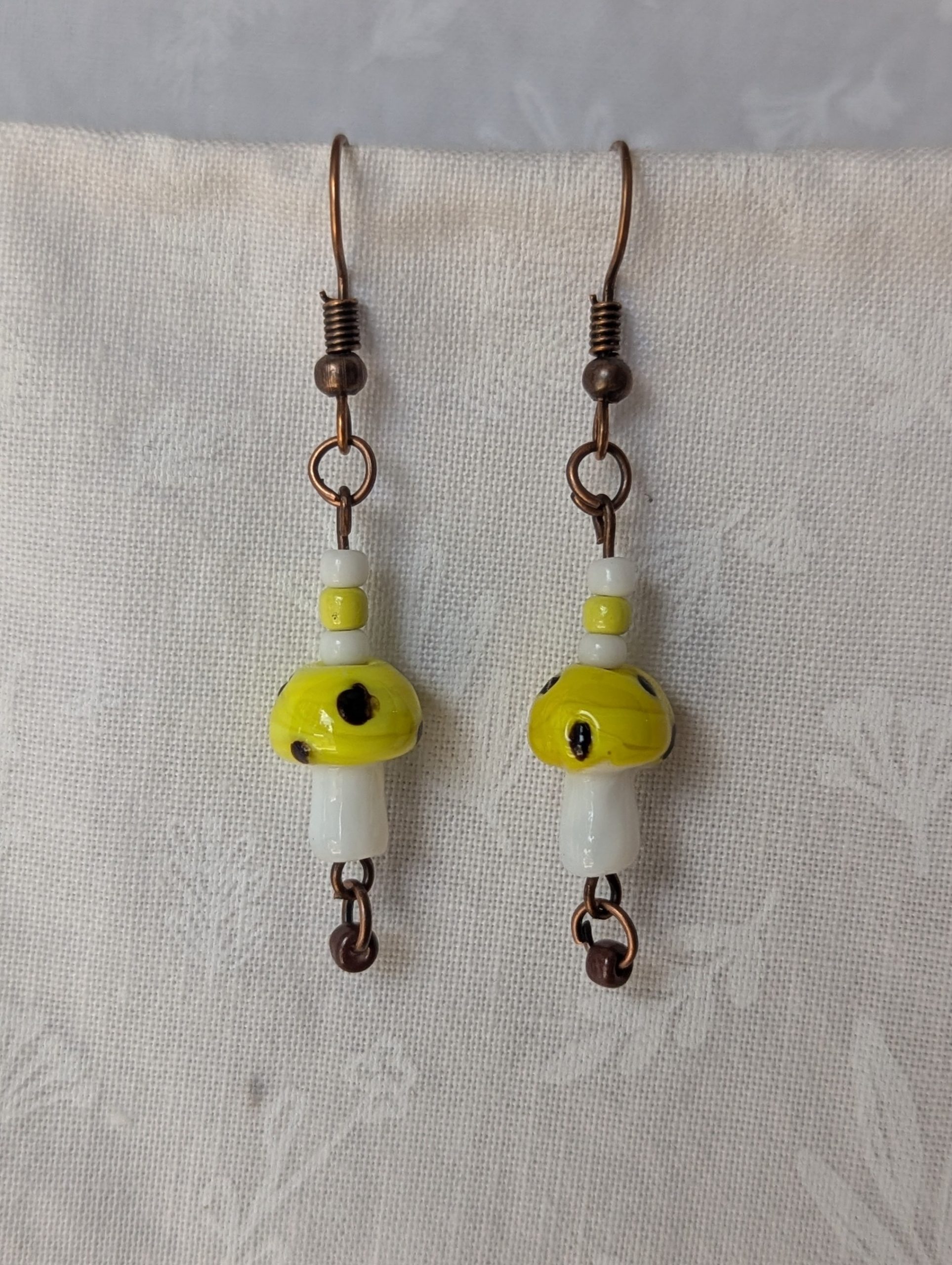 These handcrafted yellow, white, and brown mushroom earrings feature whimsical glass toadstools in ominous yellow, luminous white, and foreboding brown dots. Each mushroom is paired with coordinating glass seed beads—two pearly white, one yellow, and one shimmering brown—for a coordinated finish. Connected with bronze-colored jump rings and hung from matching hooks, these earrings combine playful charm with fearsome elegance. Perfect for adding a touch of quirky sophistication to any outfit.