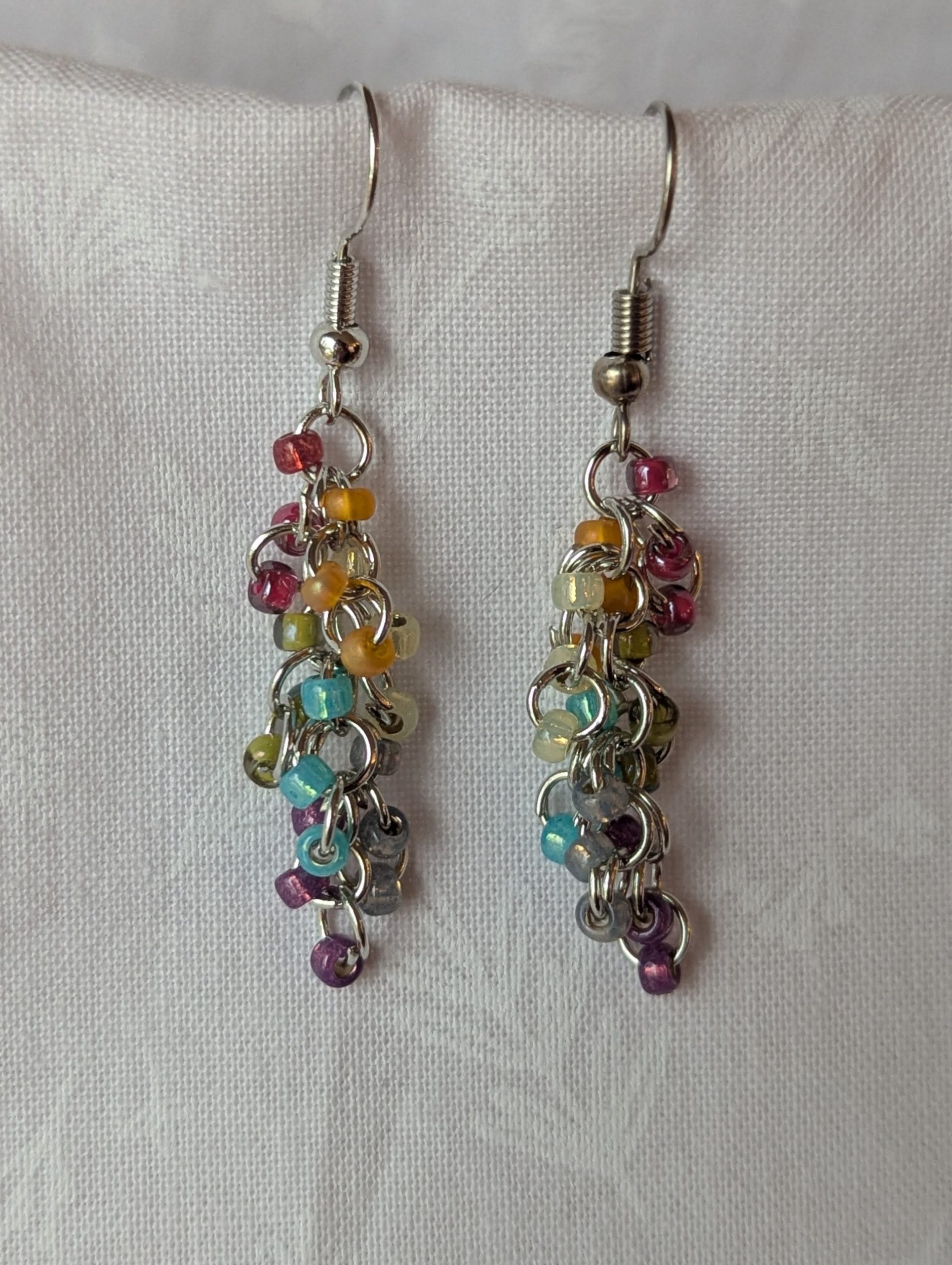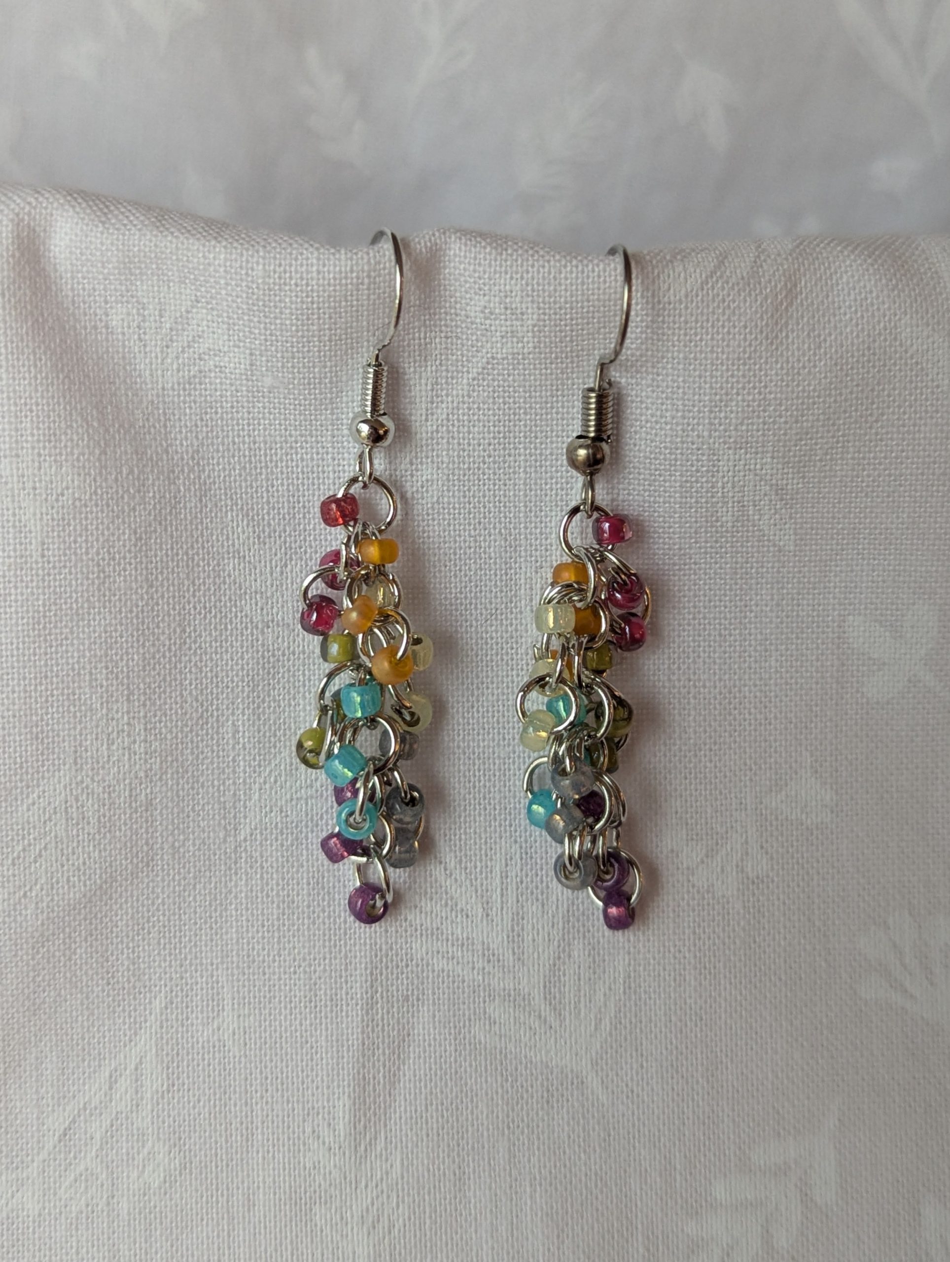 Add a touch of elegance and artistry to your style with these stunning handcrafted chainmail earrings. Carefully designed with intricate detail, each pair features delicate metal rings woven together to create a flowing, eye-catching design. Tiny seed beads and shimmering crystal accents add just the right amount of sparkle. As they dangle and move, they catch the light beautifully, making them a perfect statement piece for any occasion.