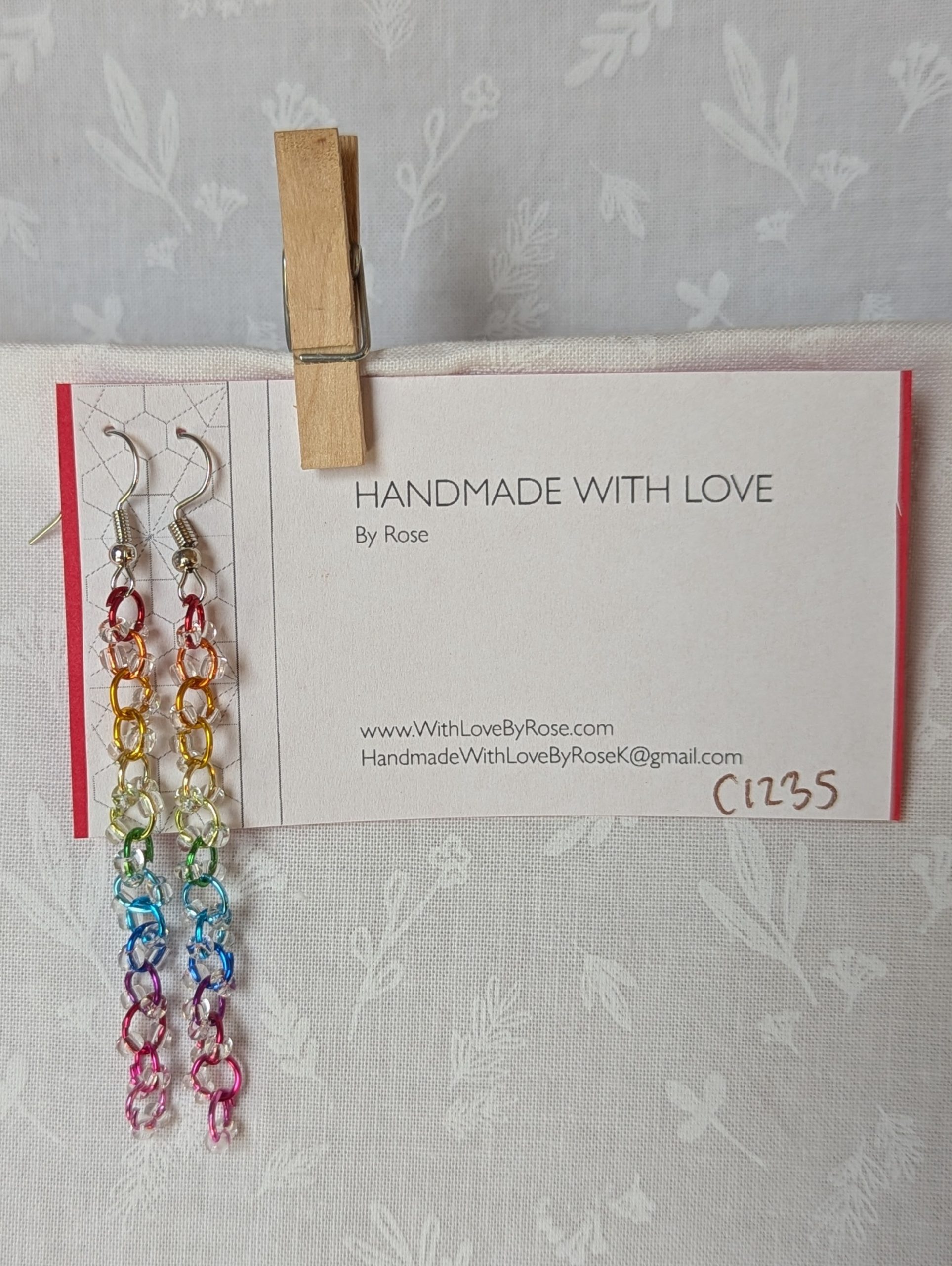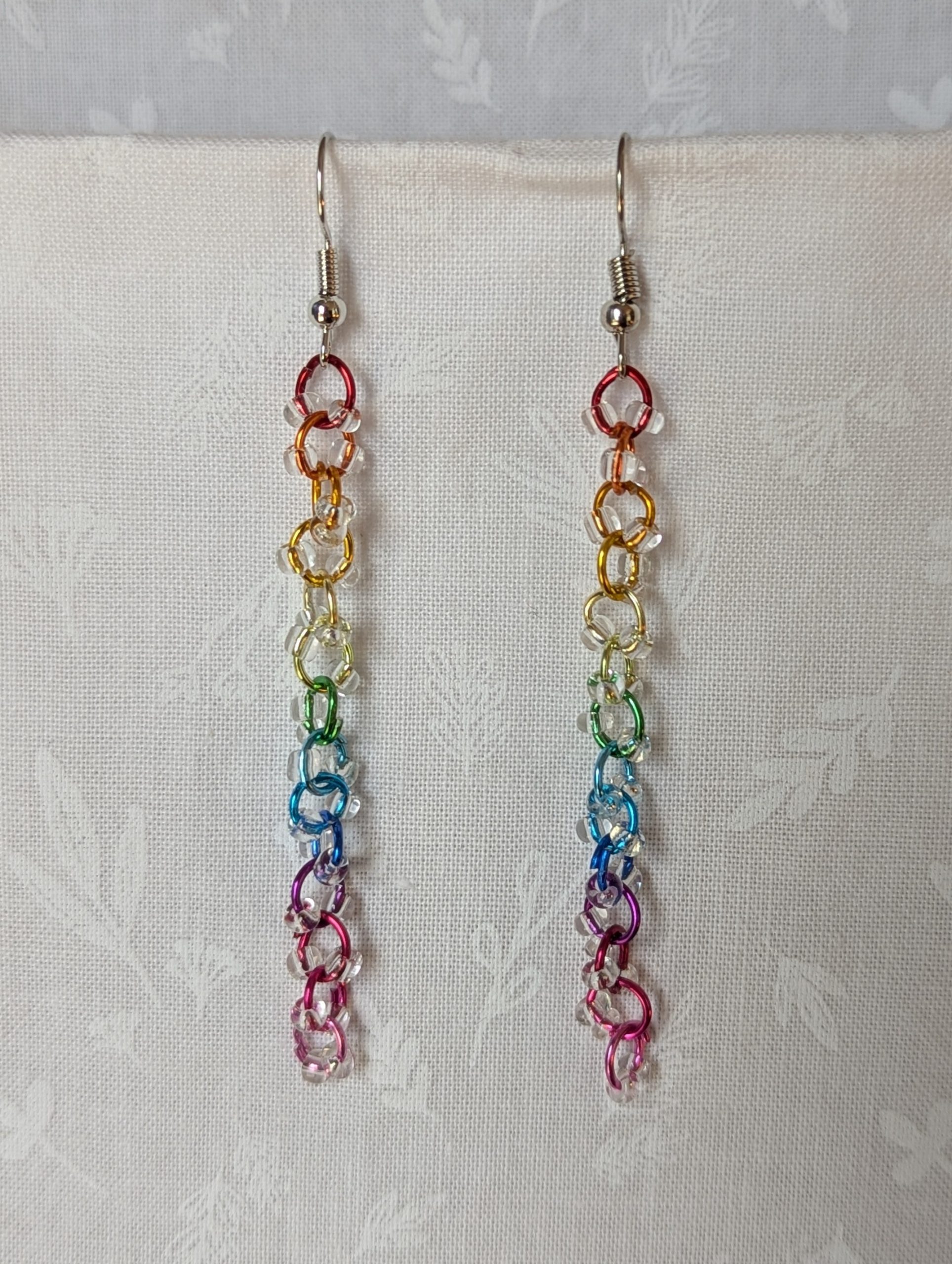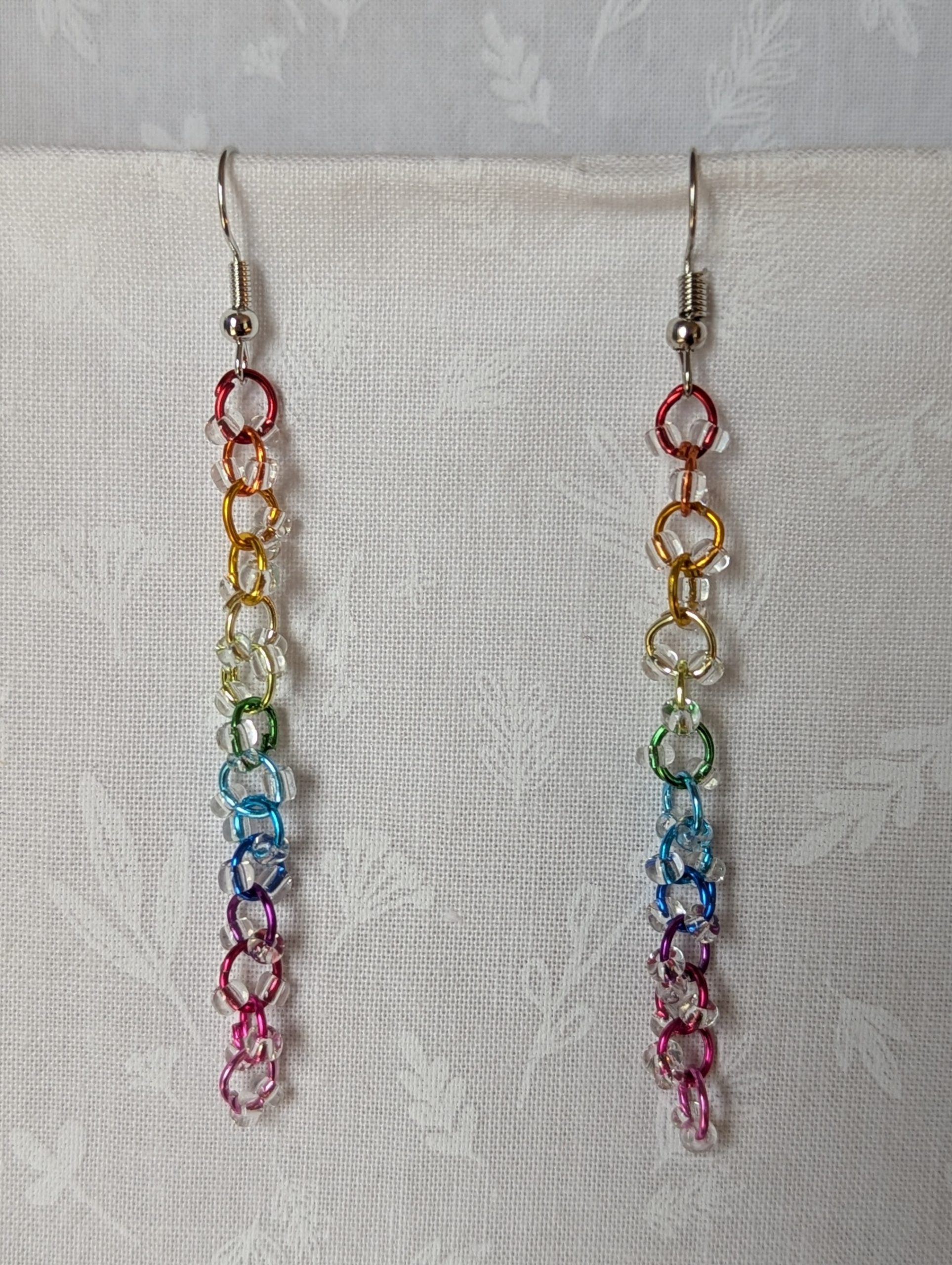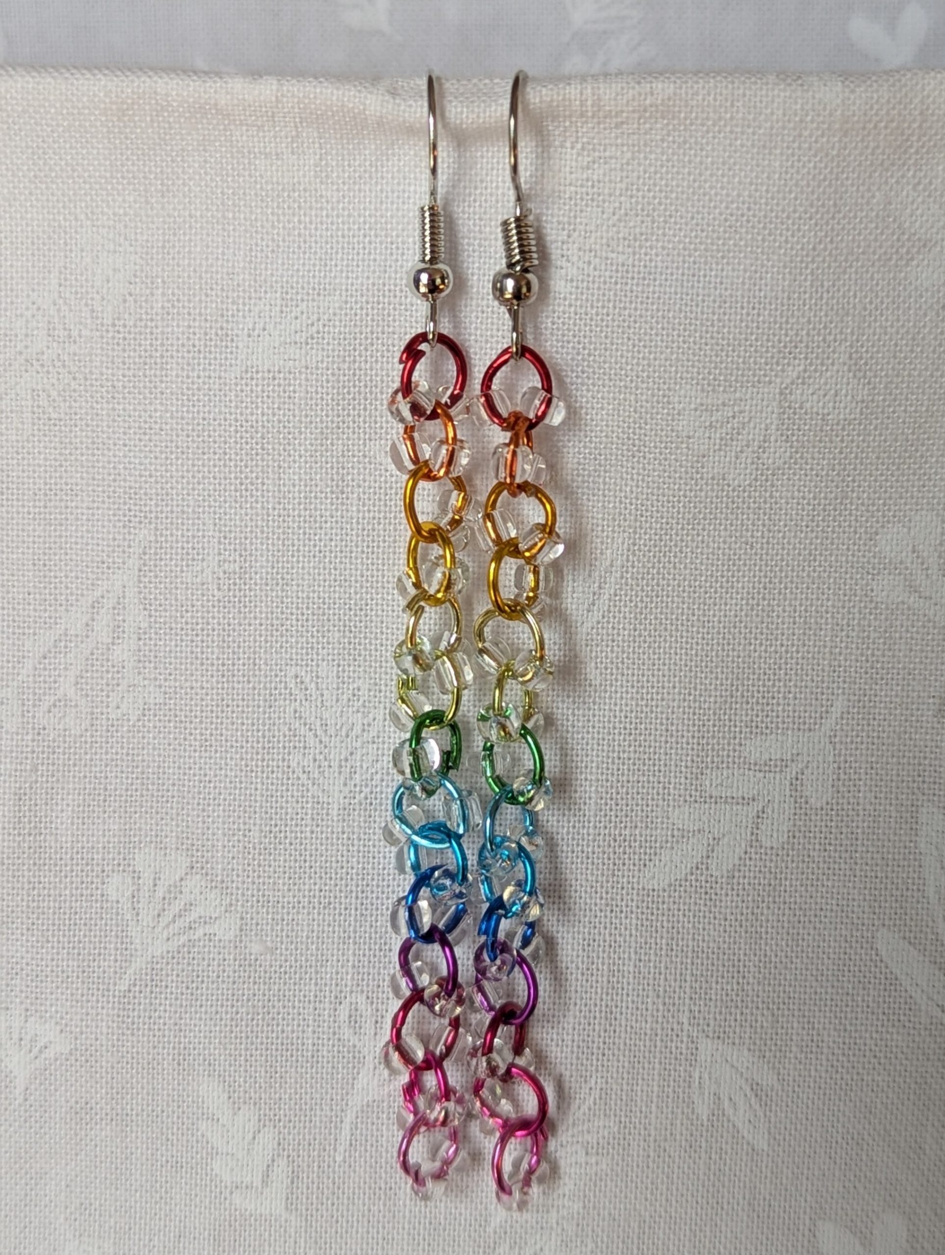 Celebrate color in its purest form with the Prismatic Dewdrop Earrings. These luminous dangles feature 28 glistening clear glass beads, each one sparkling like a tiny dewdrop. They’re delicately strung on a vertical rainbow of anodized aluminum jump rings in 14 vibrant hues—from crimson red and tangerine orange to emerald green, sapphire blue, and vivid fuchsia pink. The earrings are finished with sleek steel-colored hooks, creating a dazzling interplay of shine and shade. Lightweight yet eye-catching, these prismatic dewdrop earrings are perfect for Pride, summer festivals, or simply brightening any day.