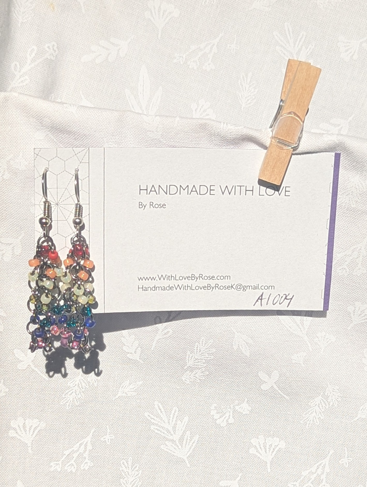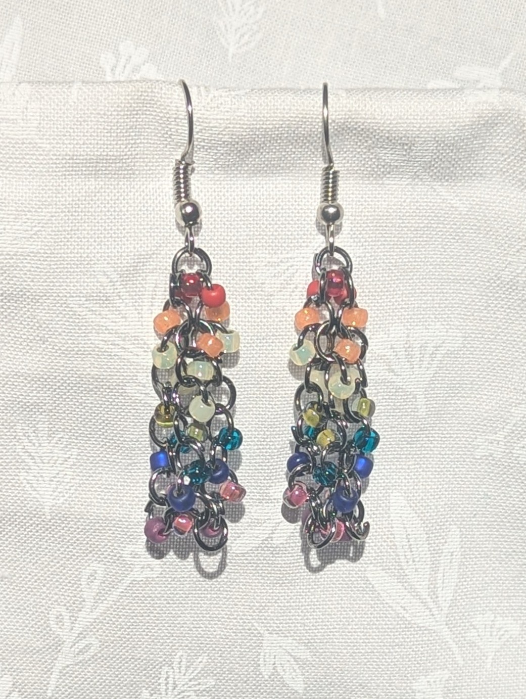 Prismatic Glow Cascade: These vibrant, handcrafted earrings showcase a cascading rainbow of glass seed beads in eleven distinct hues and textures. Each rainbow beaded earring features 27 beads delicately linked with pewter-colored jump rings. The silver-colored hooks ensure a comfortable and stylish fit, making these earrings a perfect statement piece.