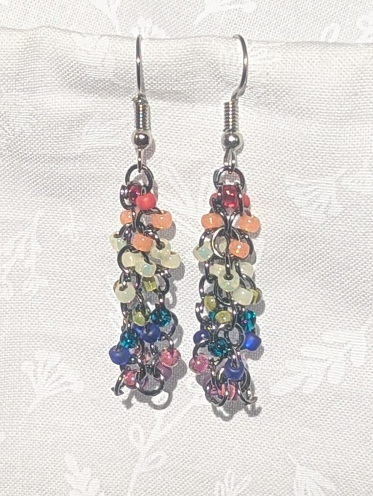 Add a touch of elegance and artistry to your style with these stunning handcrafted chainmail earrings. Carefully designed with intricate detail, each pair features delicate metal rings woven together to create a flowing, eye-catching design. Tiny seed beads and shimmering crystal accents add just the right amount of sparkle. As they dangle and move, they catch the light beautifully, making them a perfect statement piece for any occasion.