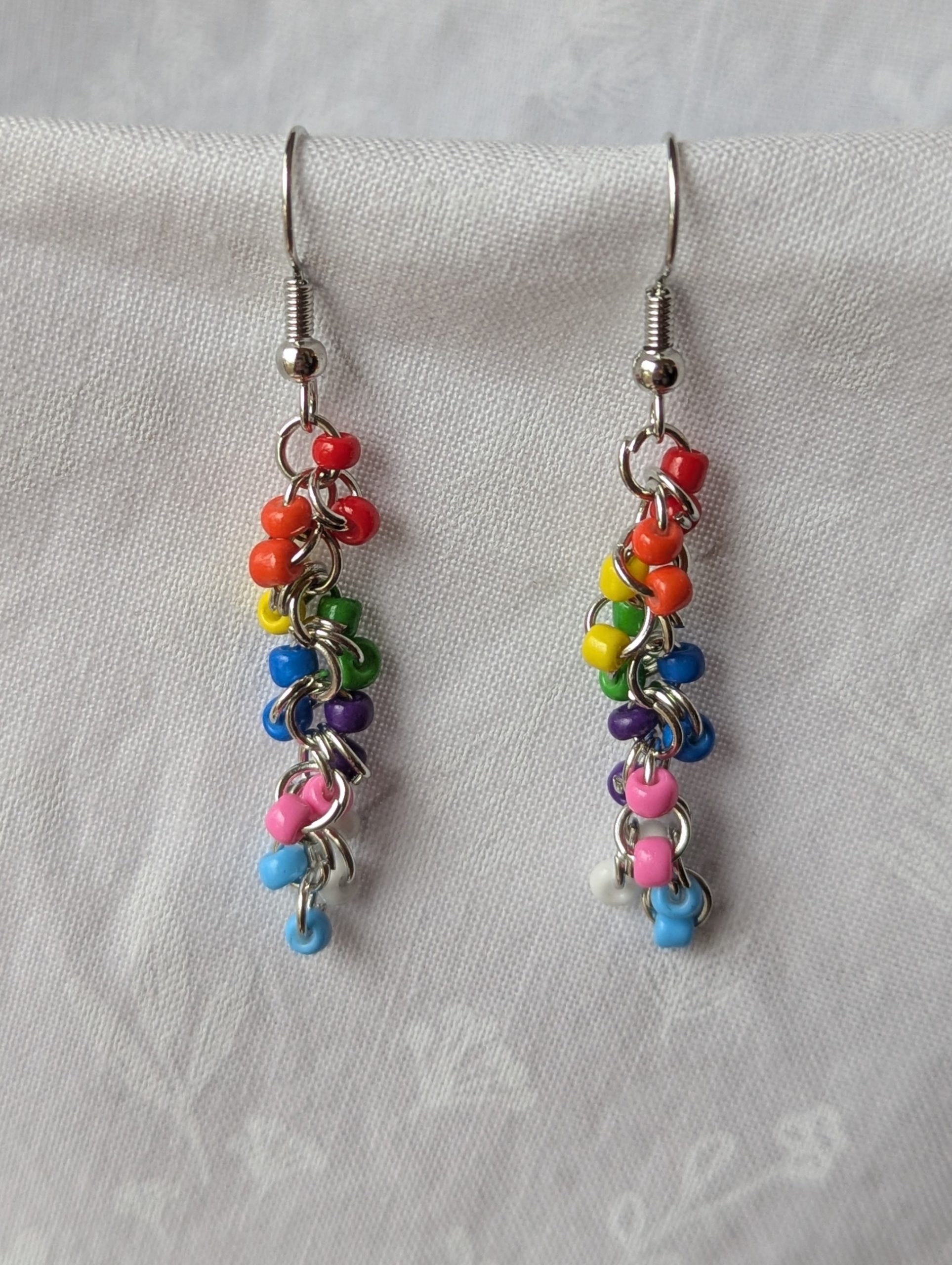 The Prismatic Pride Drops celebrate color and inclusivity with a stunning gradient of nine vibrant hues. Featuring a harmonious blend of the classic rainbow and trans flag colors, each earring showcases 18 carefully arranged glass seed beads—two of each shade—dangling gracefully from steel-colored jump rings. The sleek silver-toned earring hooks complete the design, offering a lightweight and eye-catching accessory that shines with meaning and style.