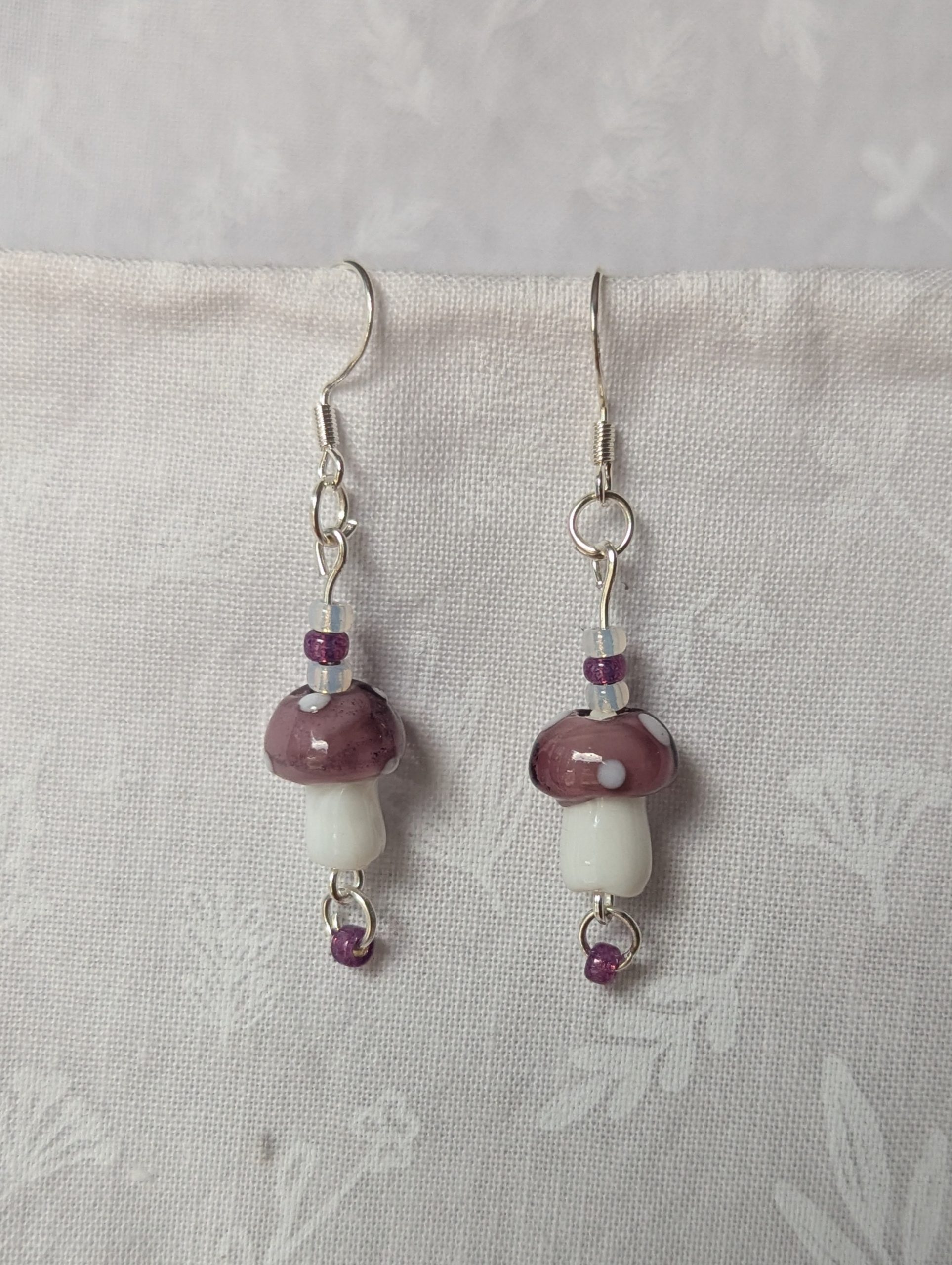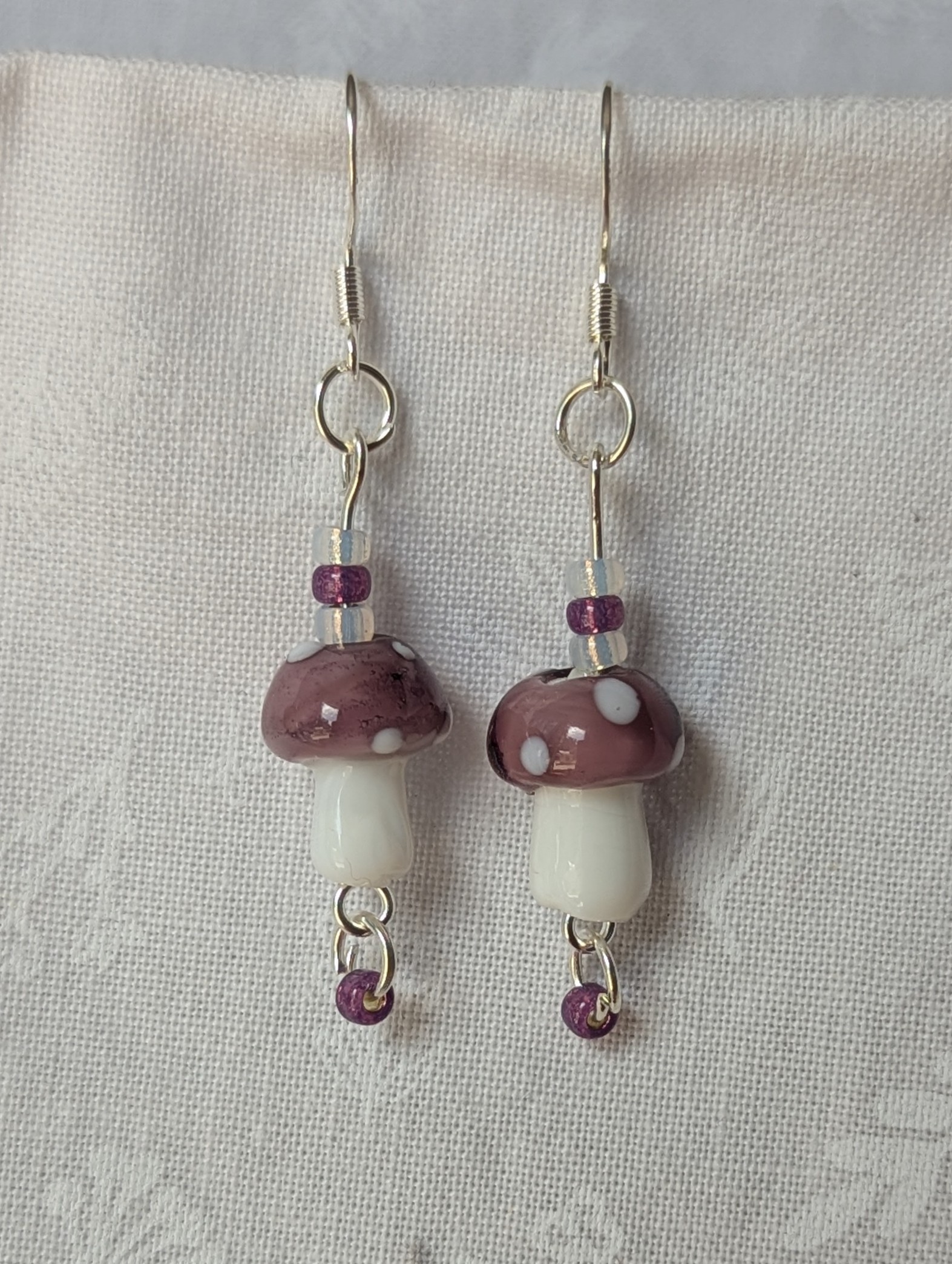 These handcrafted purple mushroom earrings feature whimsical glass toadstools in glossy purple and luminous white. Each mushroom is paired with coordinating glass seed beads—two pearly white and two frosted purple—for a balanced monotone finish. Connected with silver-colored jump rings and hung from sterling silver hooks, these earrings combine playful charm with bold elegance. Perfect for adding a touch of quirky sophistication to any outfit.