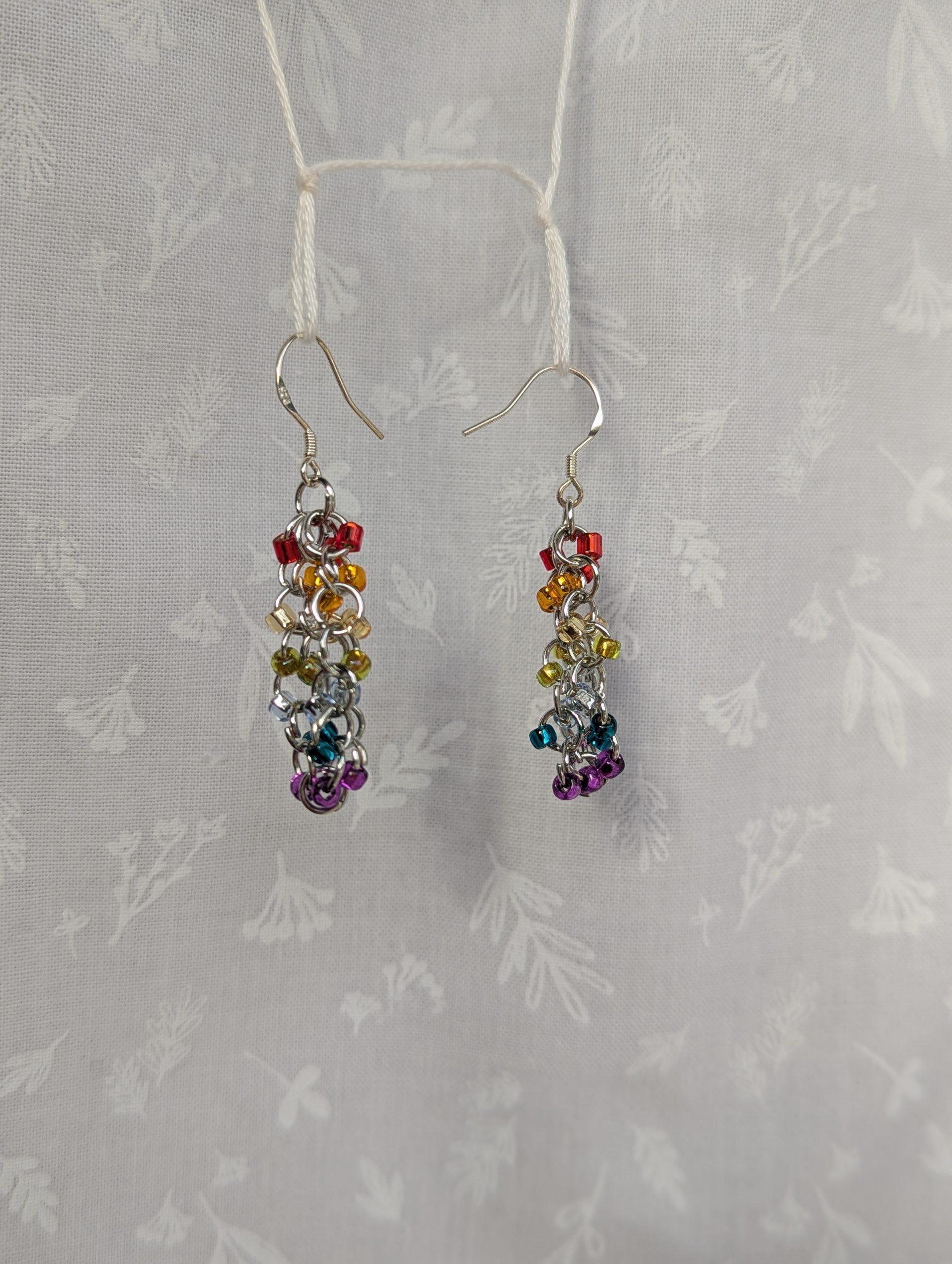 The Radiant Rainbow Earrings showcase a stunning spectrum of colors, featuring red, orange, yellow, green, light blue, teal, and purple glass seed beads. Each earring holds 21 beads, with three of each color, arranged in a cascading design using nickel-colored jump rings. The silver-lined beads catch the light, adding a soft shimmer to the vibrant hues. Finished with sterling silver hooks, these earrings offer a stylish, hypoallergenic accessory that complements a variety of looks, from casual to elegant.
