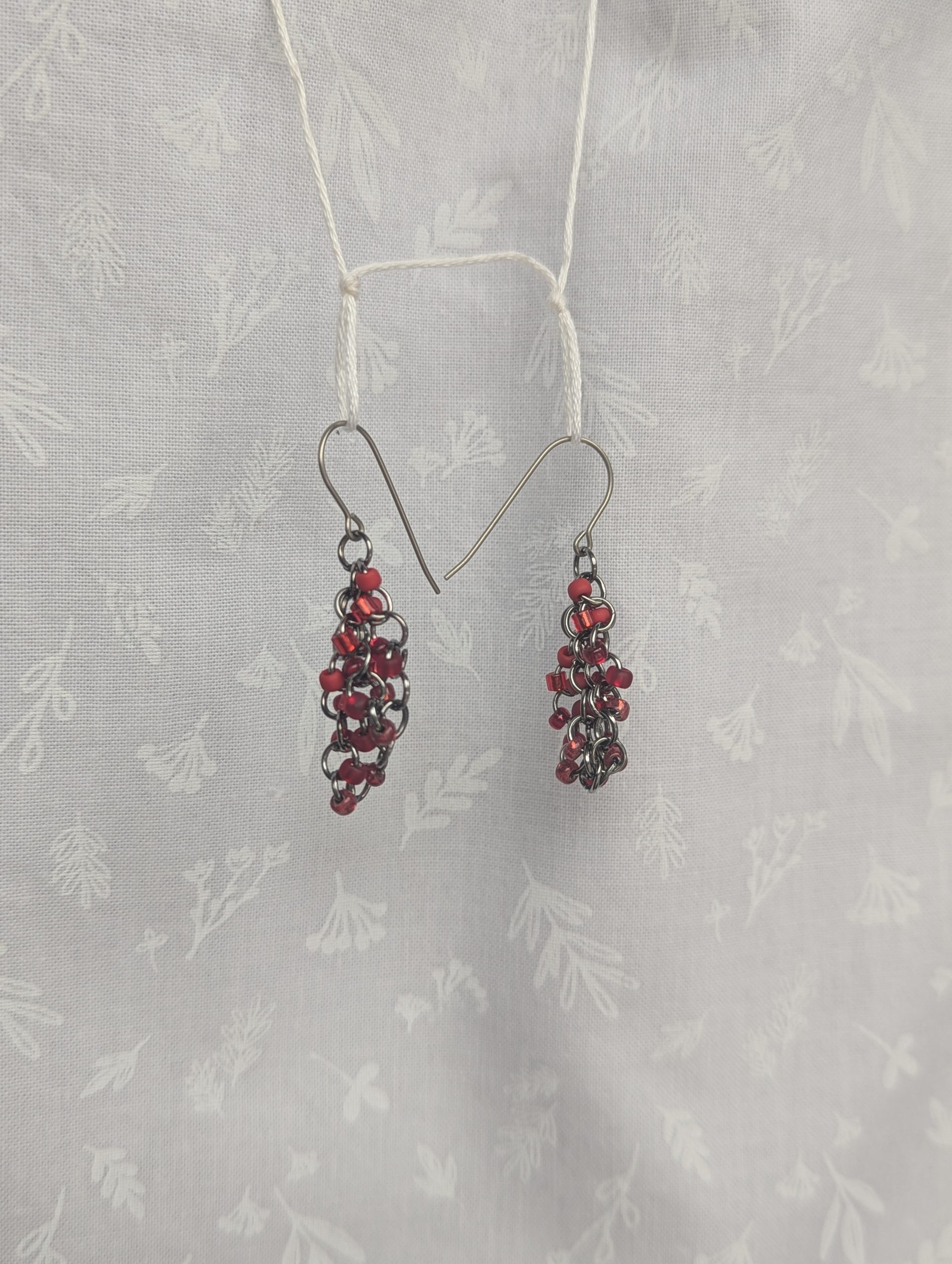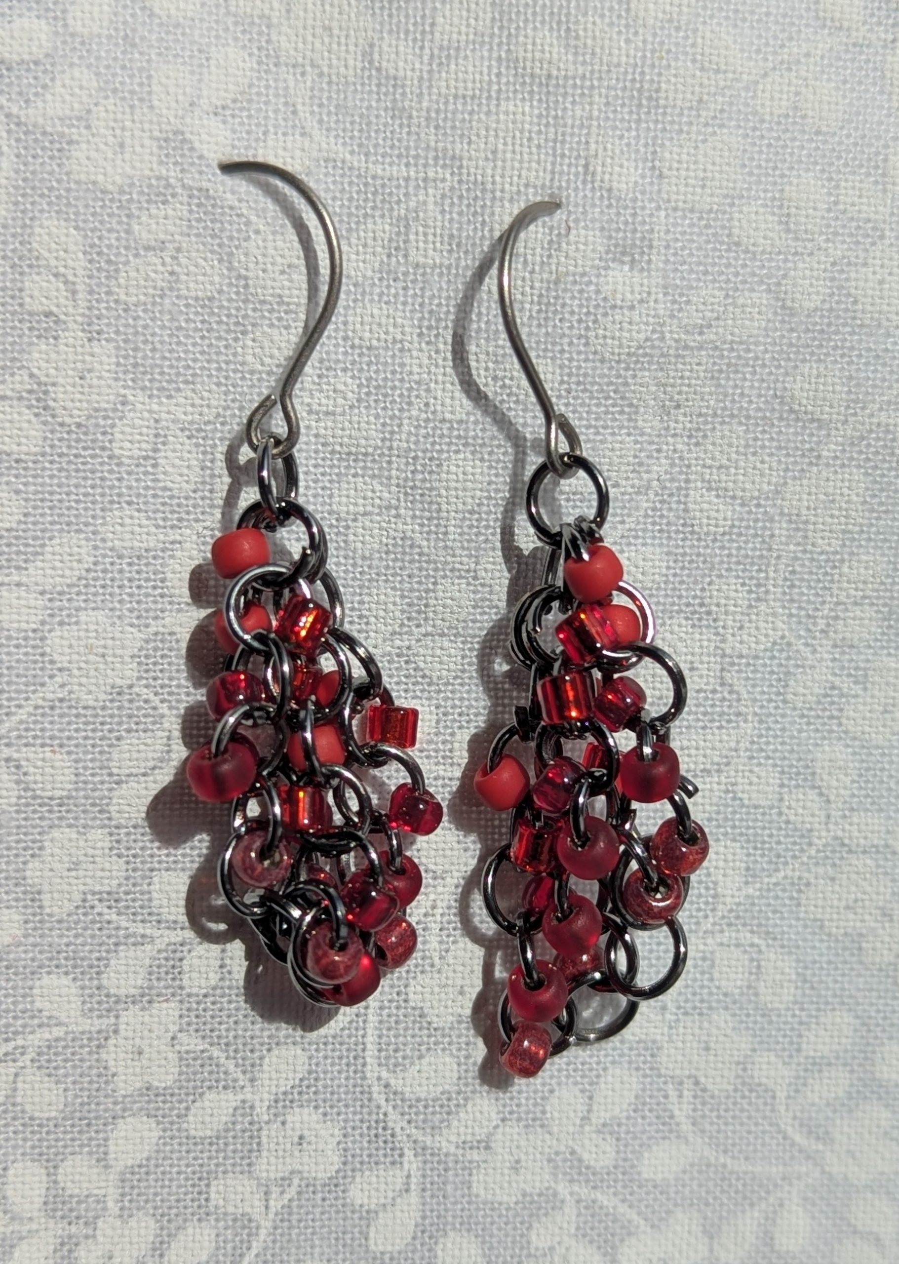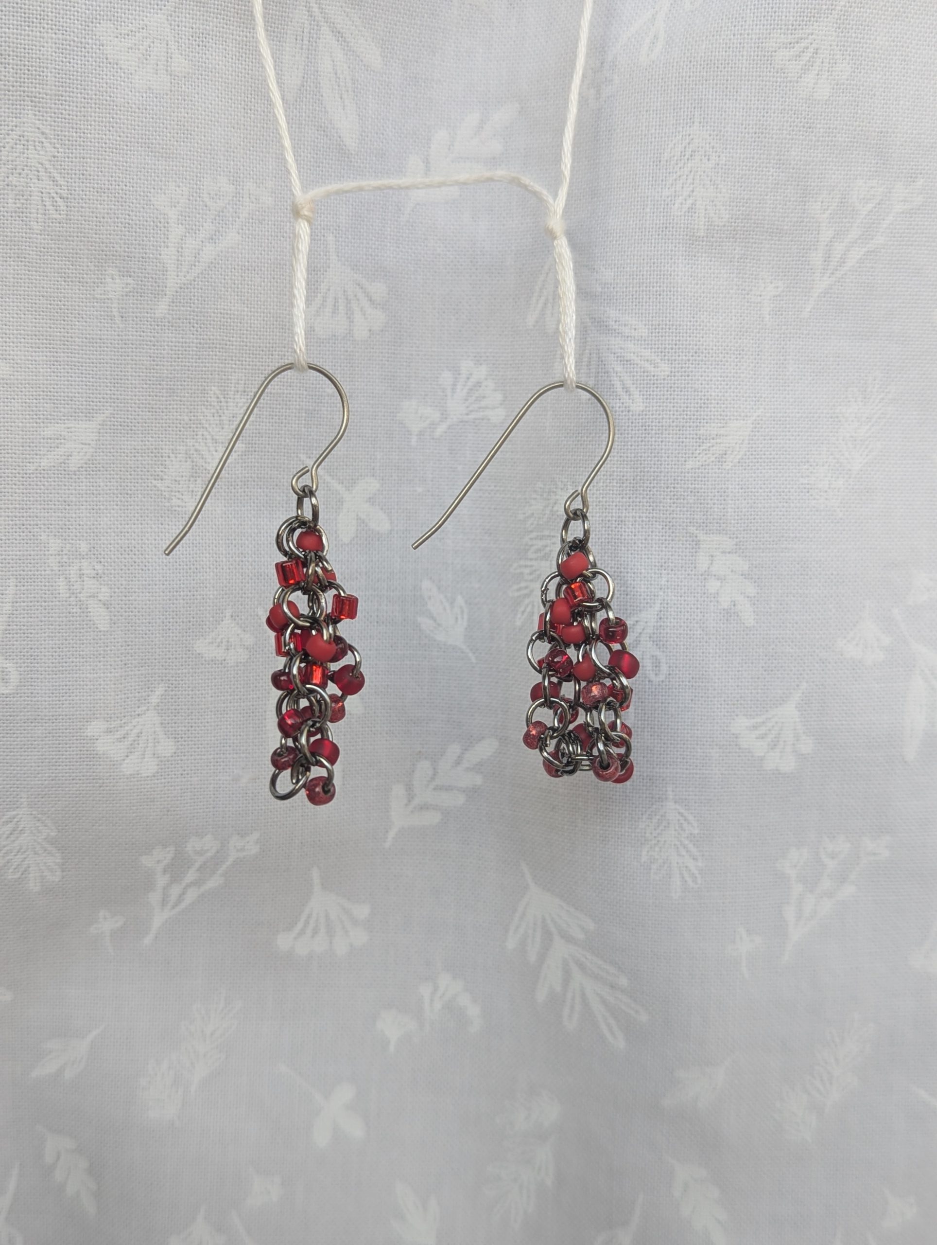 These handcrafted red beaded earrings feature a cascading design with four different shades of red, each with a unique texture. The 16 glass seed beads per earring are carefully arranged on bronze-colored jump rings, creating a dynamic and eye-catching effect. The beads include a mix of matte, glossy, and translucent finishes for added depth. The earrings are suspended from hypoallergenic titanium hooks, ensuring comfort for sensitive ears. Their bold yet elegant design makes them a versatile accessory, perfect for adding a touch of vibrant charm to any outfit.