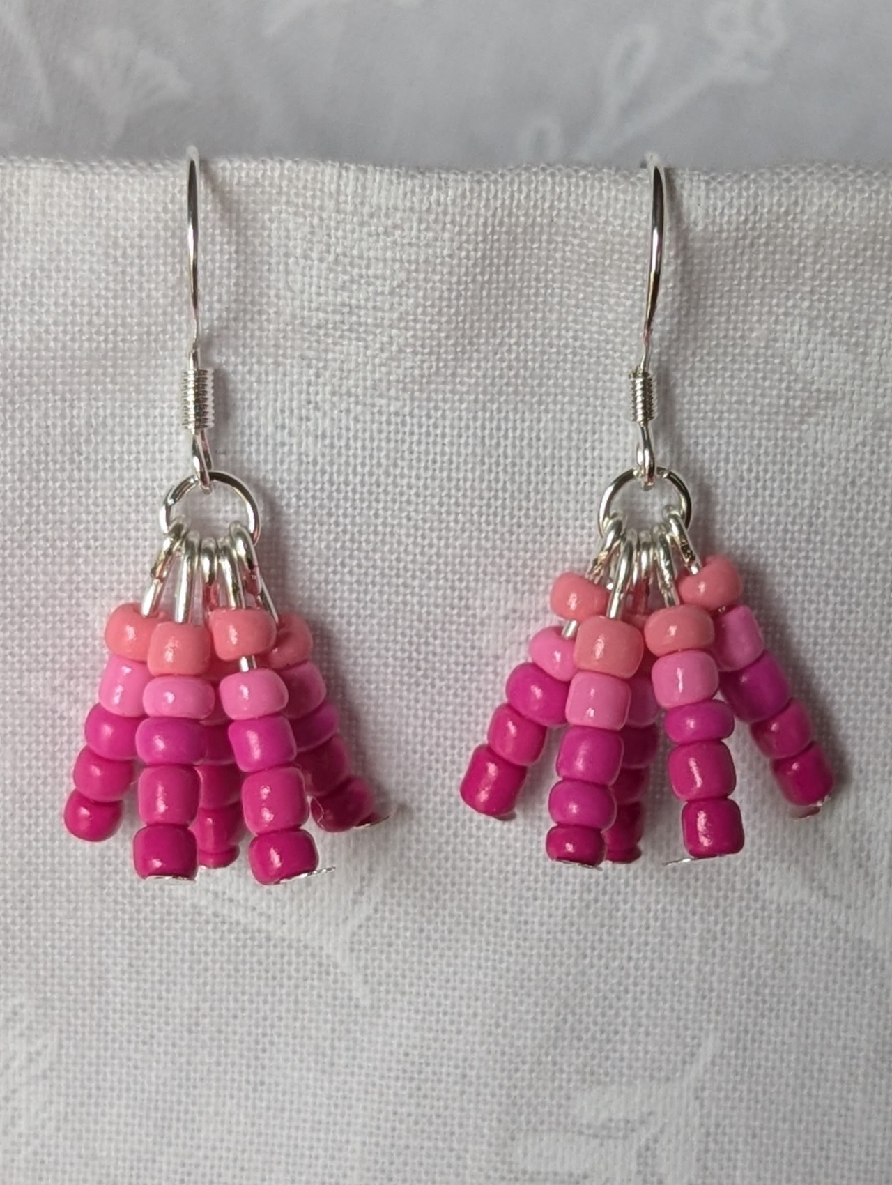 Add a touch of romance with Rosy Bloom pink gradient earrings. These earrings feature 25 delicate beads in five luscious pink tones: blush rose, petal pink, bubblegum, hot pink, and fuchsia. Arranged in gradient strands from silver-colored posts, these pink gradient earrings are connected with silver jump rings and hooks. These pink gradient earrings make a graceful, feminine statement.