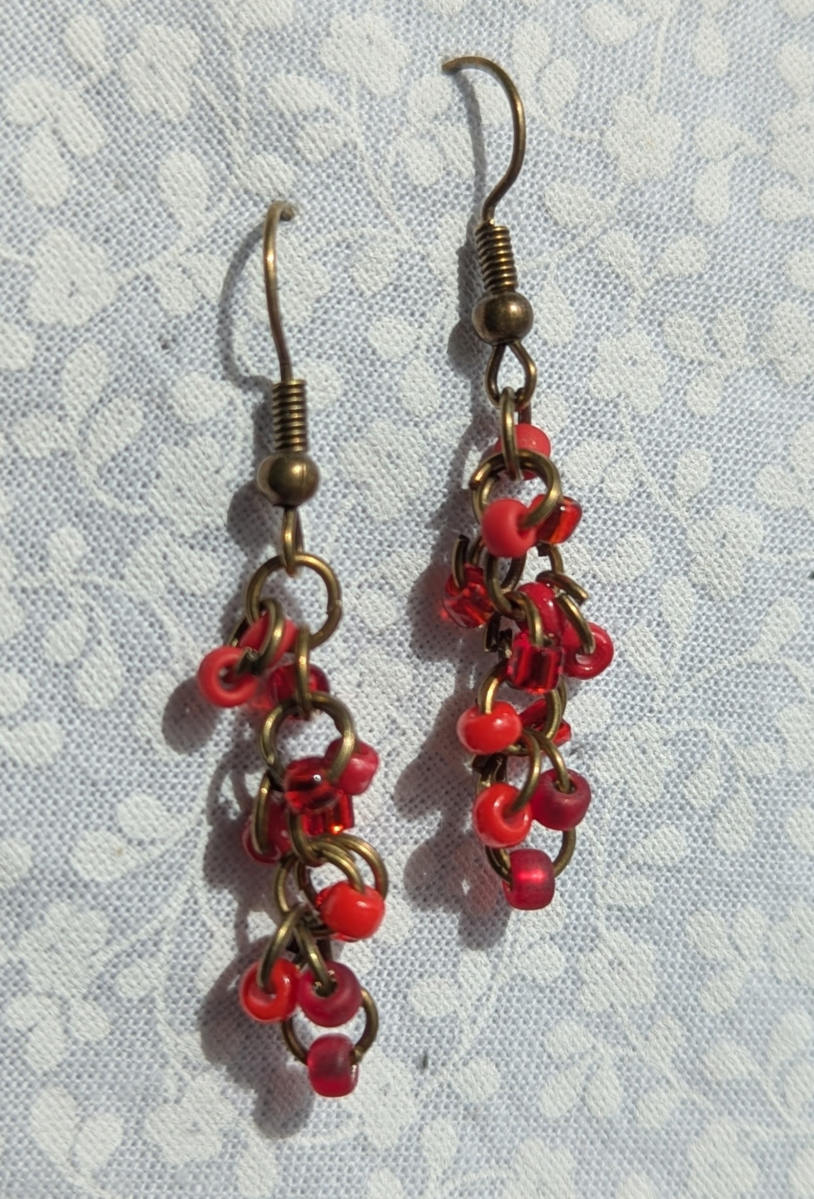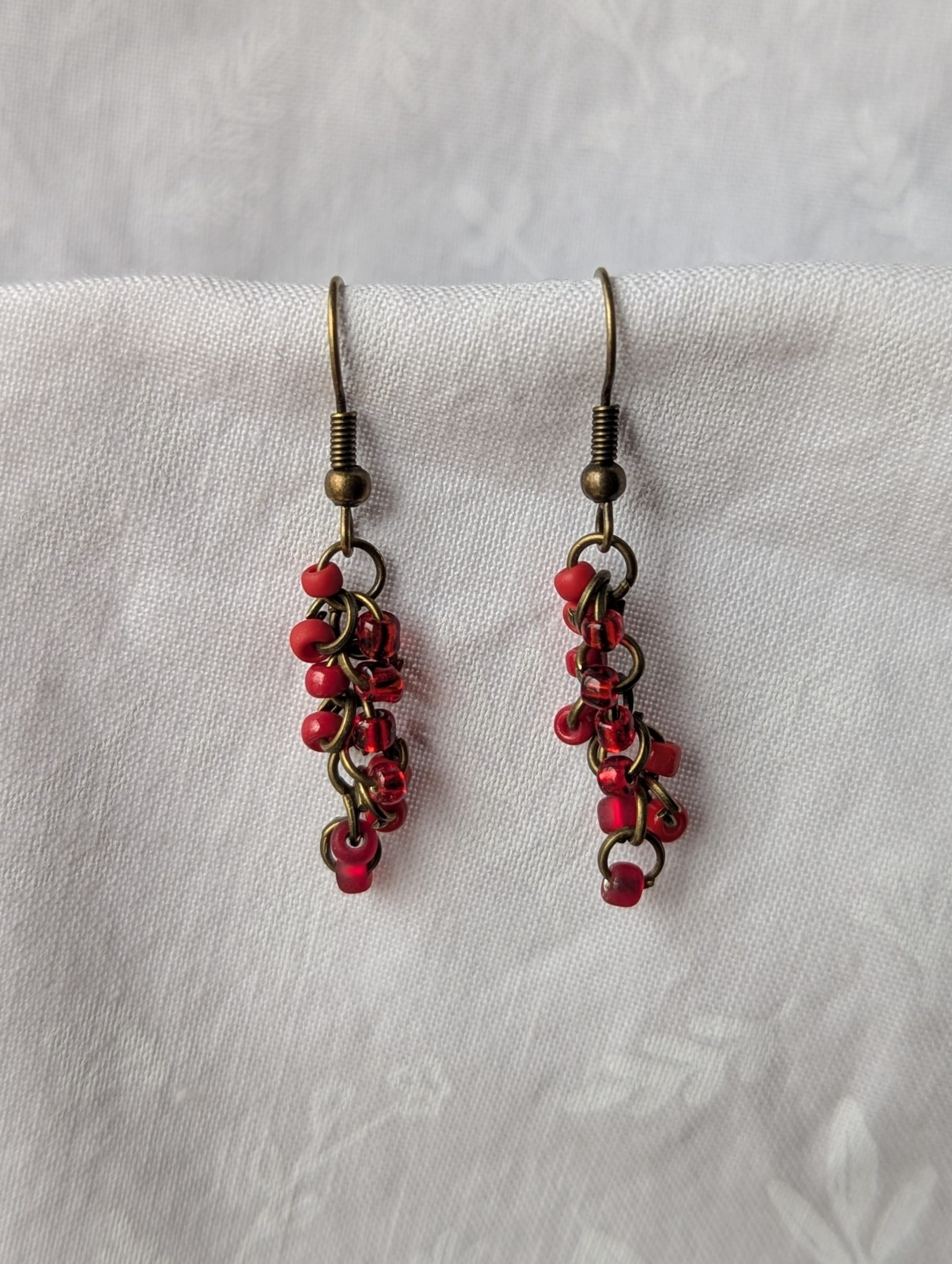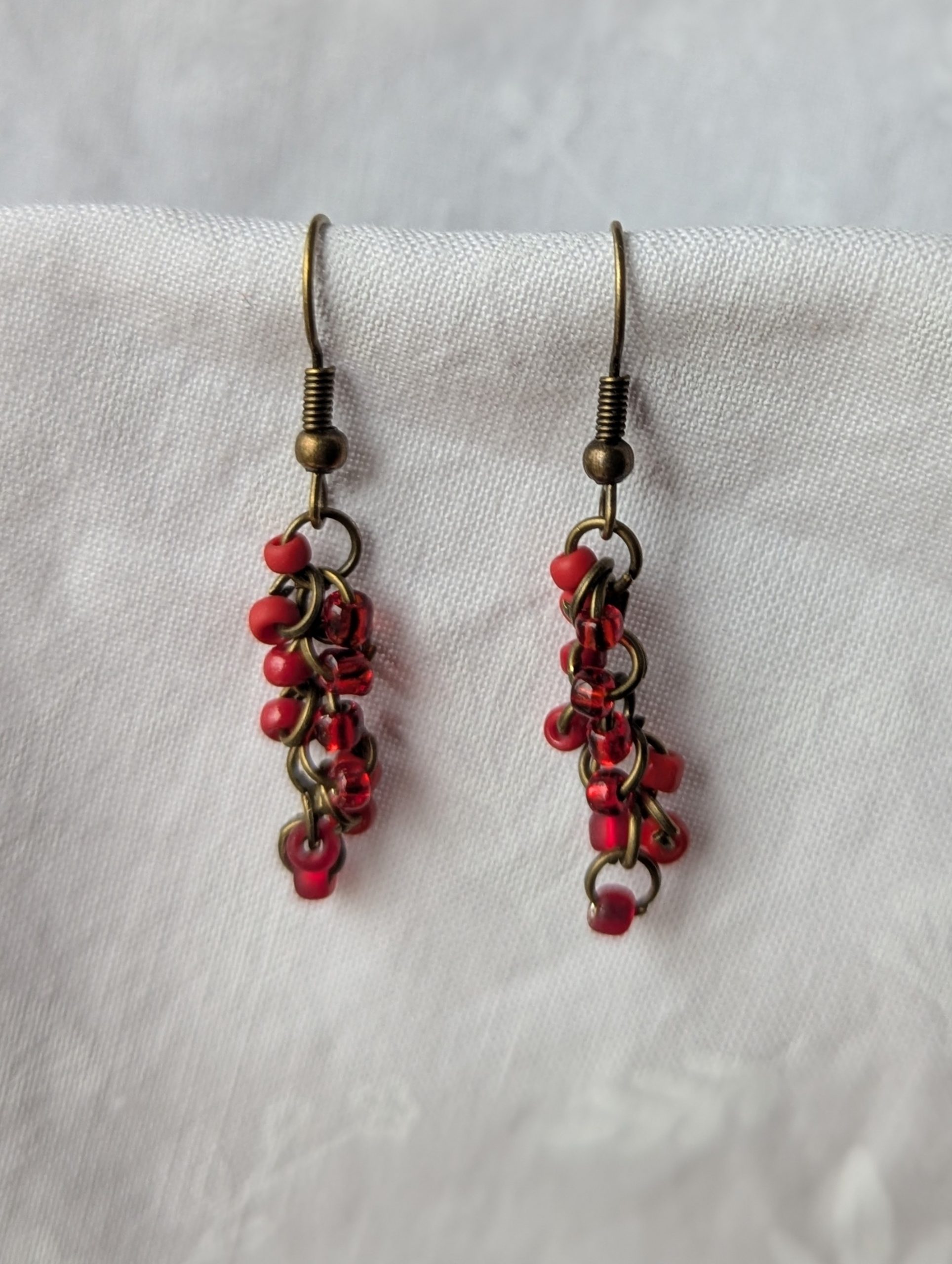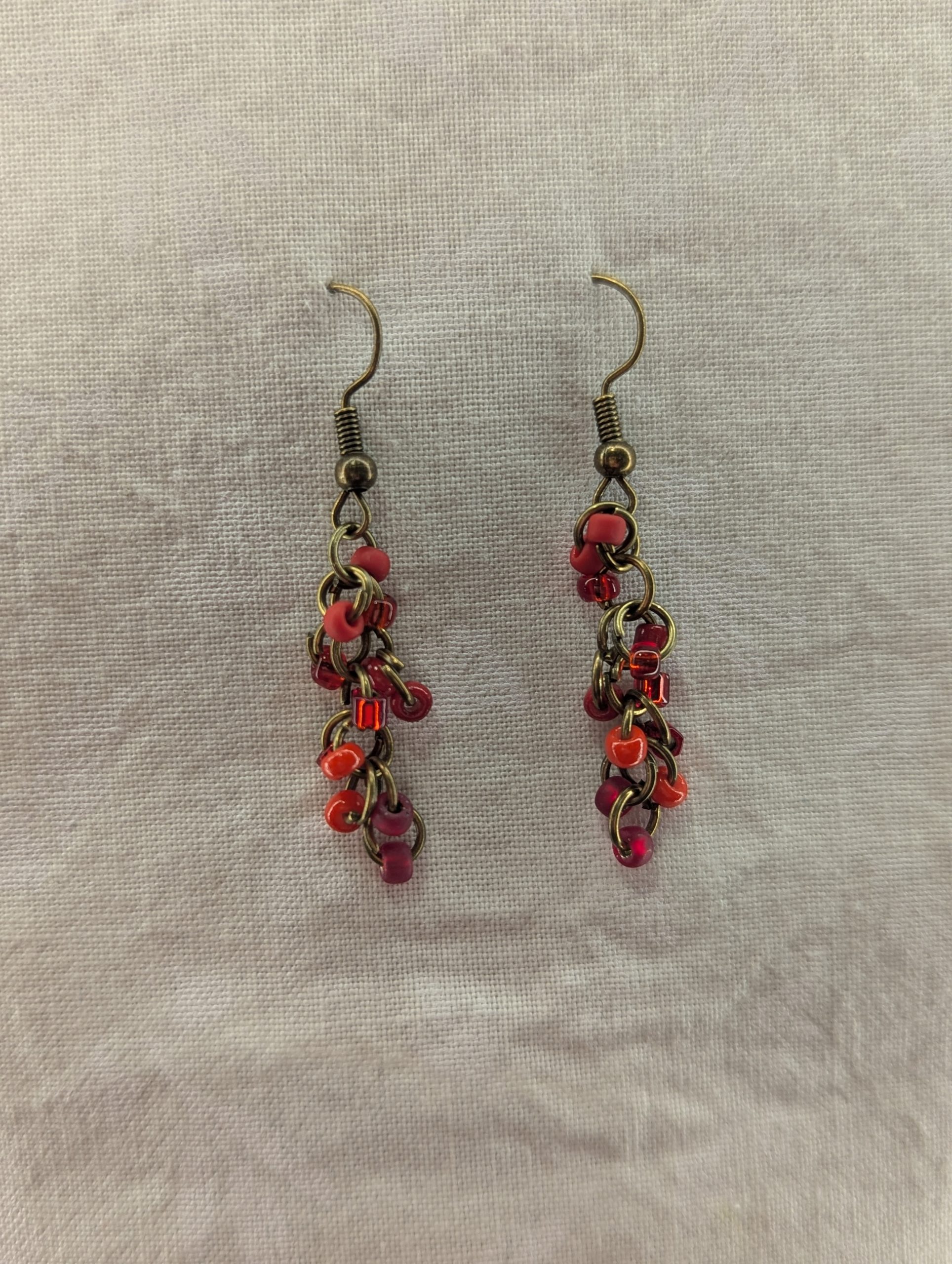 Scarlet Elegance Drops: red earrings featuring 6 different hues of red with various textures. Total of 12 beads per earring with 2 beads per color. Materials: glass seed beads, bronze colored earring hooks, and bronze colored jump rings.