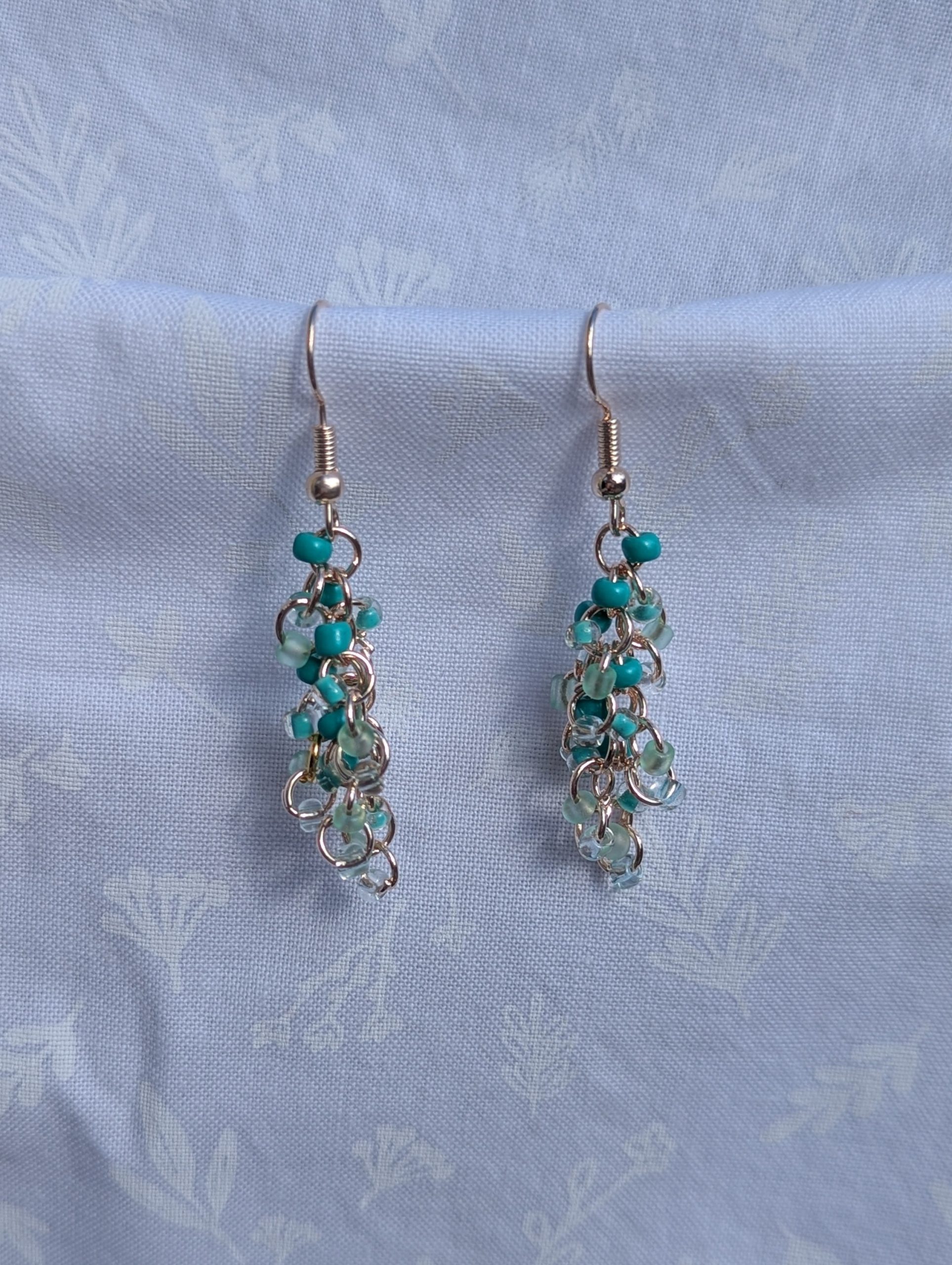 Add a touch of elegance and artistry to your style with these stunning handcrafted chainmail earrings. Carefully designed with intricate detail, each pair features delicate metal rings woven together to create a flowing, eye-catching design. Tiny seed beads and shimmering crystal accents add just the right amount of sparkle. As they dangle and move, they catch the light beautifully, making them a perfect statement piece for any occasion.