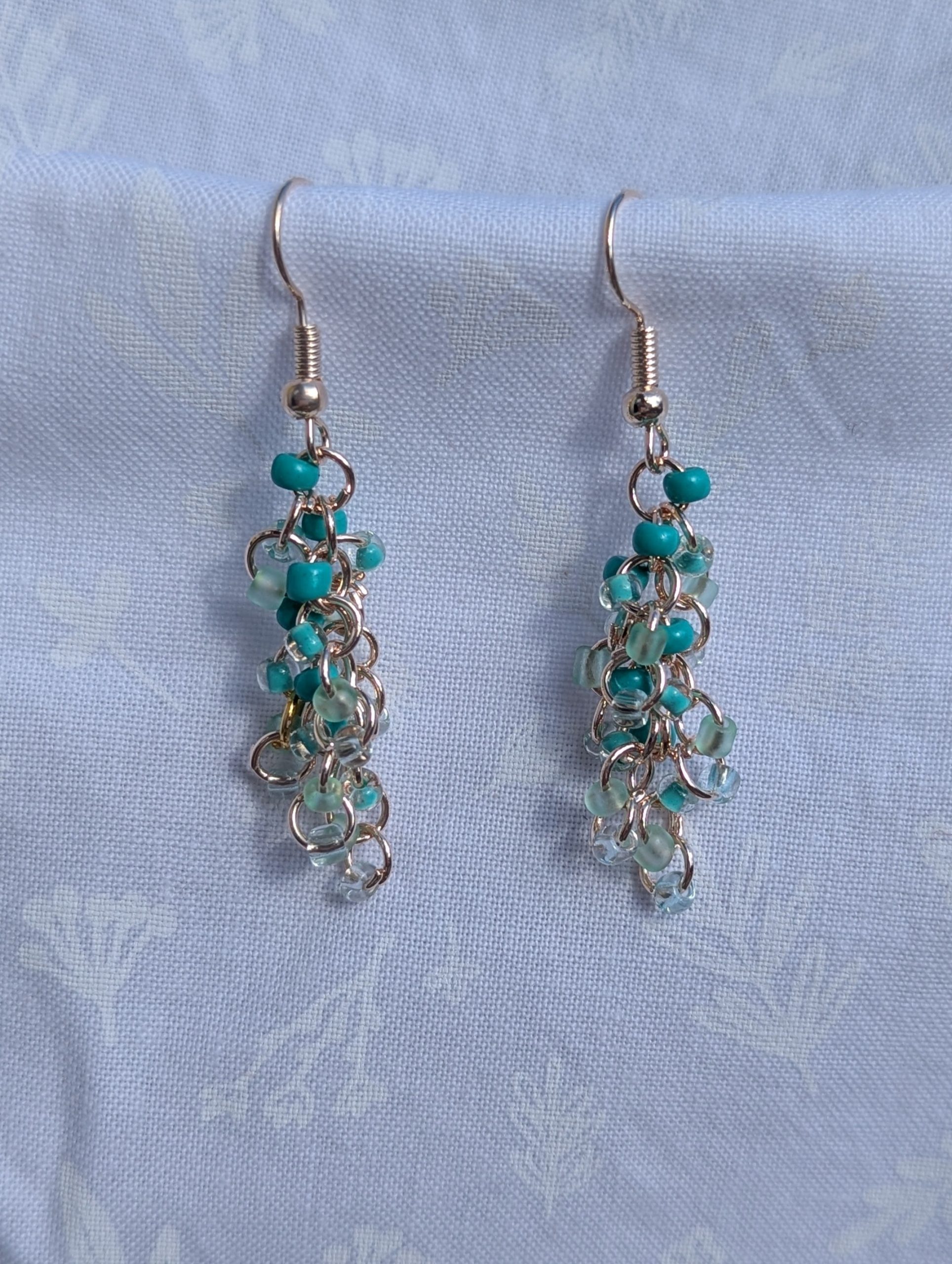 These cool seafoam green handmade earrings feature a stunning blend of seafoam green and teal glass seed beads of various hues each with a variety of texture. A total of 18 beads per earring—six beads per hue—cascade gracefully, creating a vibrant and eye-catching effect. The rose-gold-colored jump rings and matching earring hooks provide a sleek, polished finish that complements elegant color palette. Perfect for adding a touch of seafoam green energy to any outfit, these earrings are a must-have for color lovers.