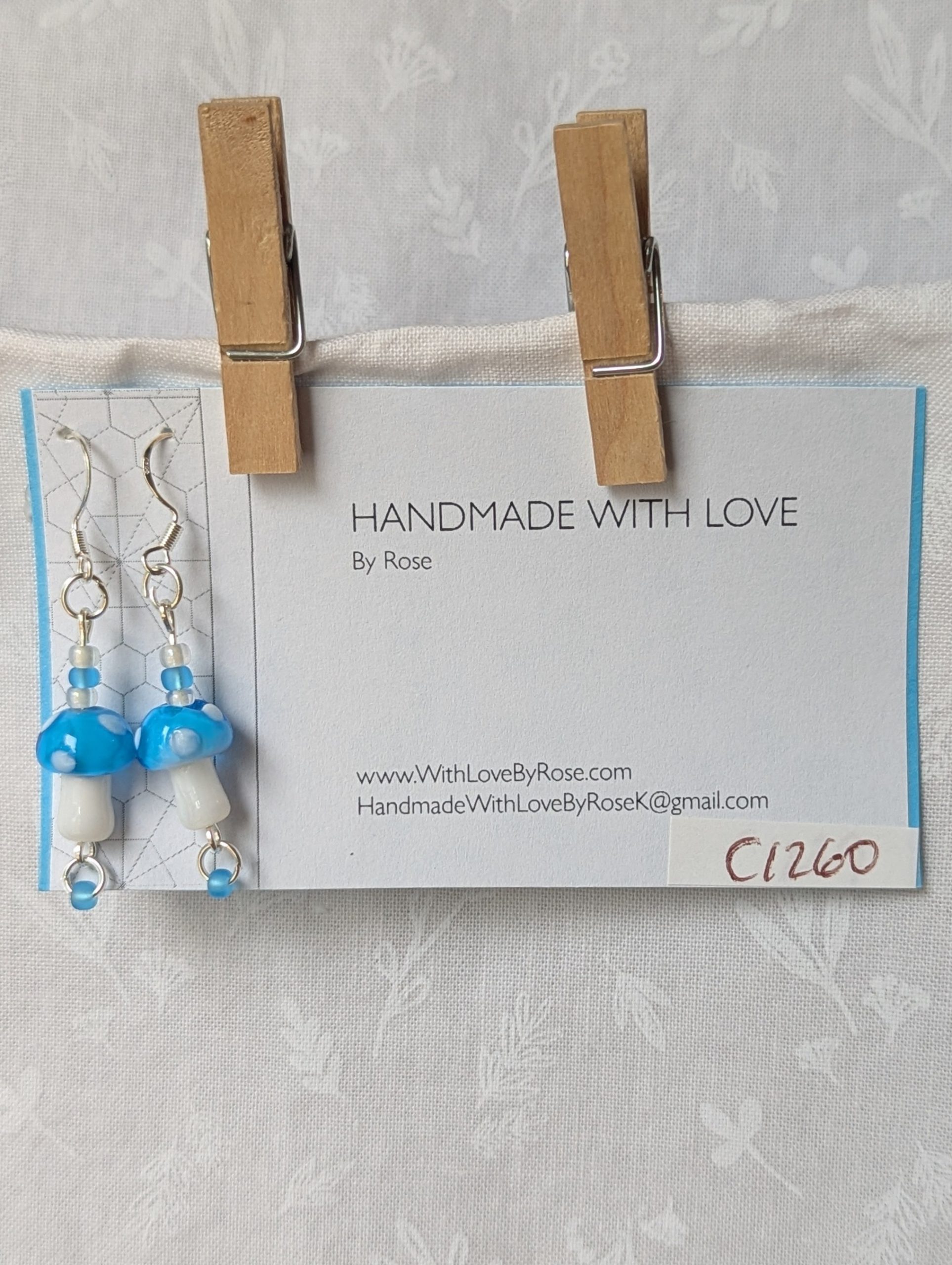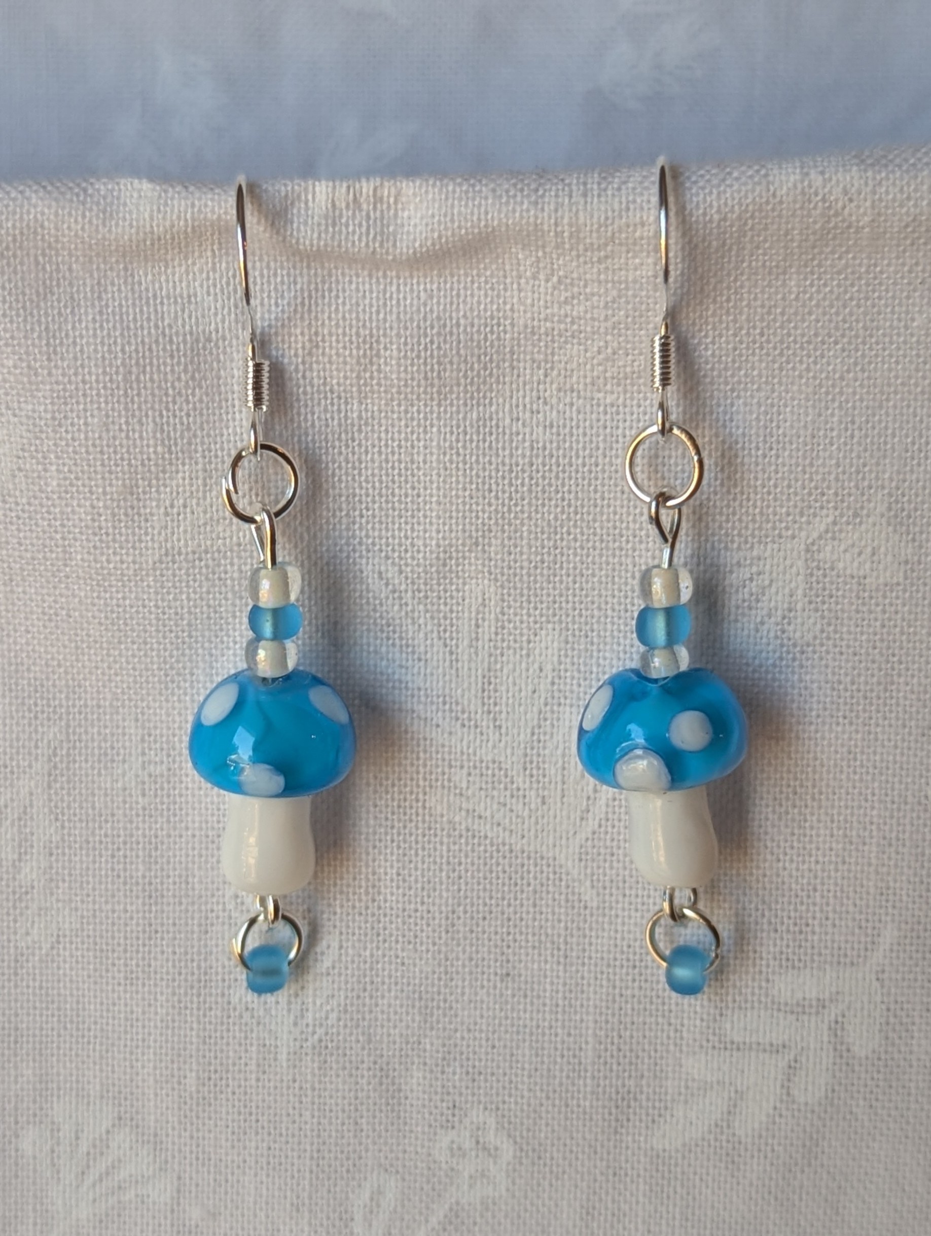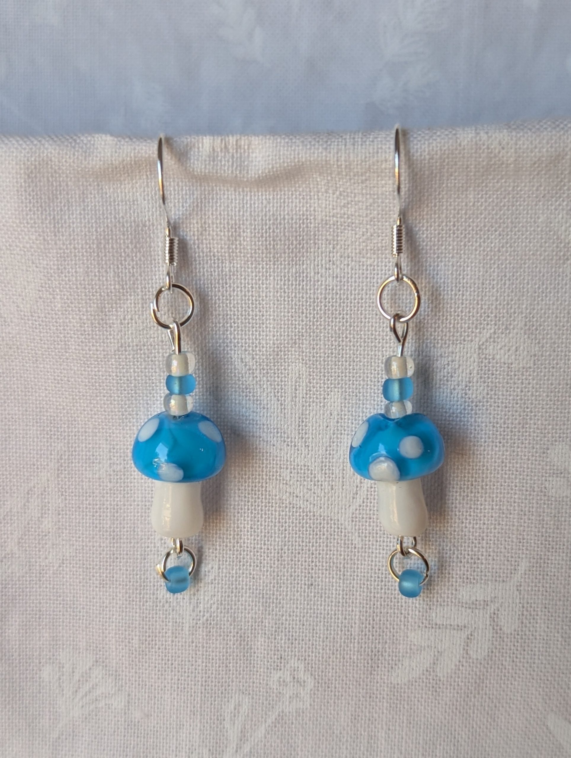 These handcrafted sky-blue mushroom earrings feature whimsical glass toadstools in glossy sky-blue and luminous white. Each mushroom is paired with coordinating glass seed beads—two pearly white and two frosted sky blue—for a balanced monotone finish. Connected with silver-colored jump rings and hung from sterling silver hooks, these earrings combine playful charm with bold elegance. Perfect for adding a touch of quirky sophistication to any outfit.