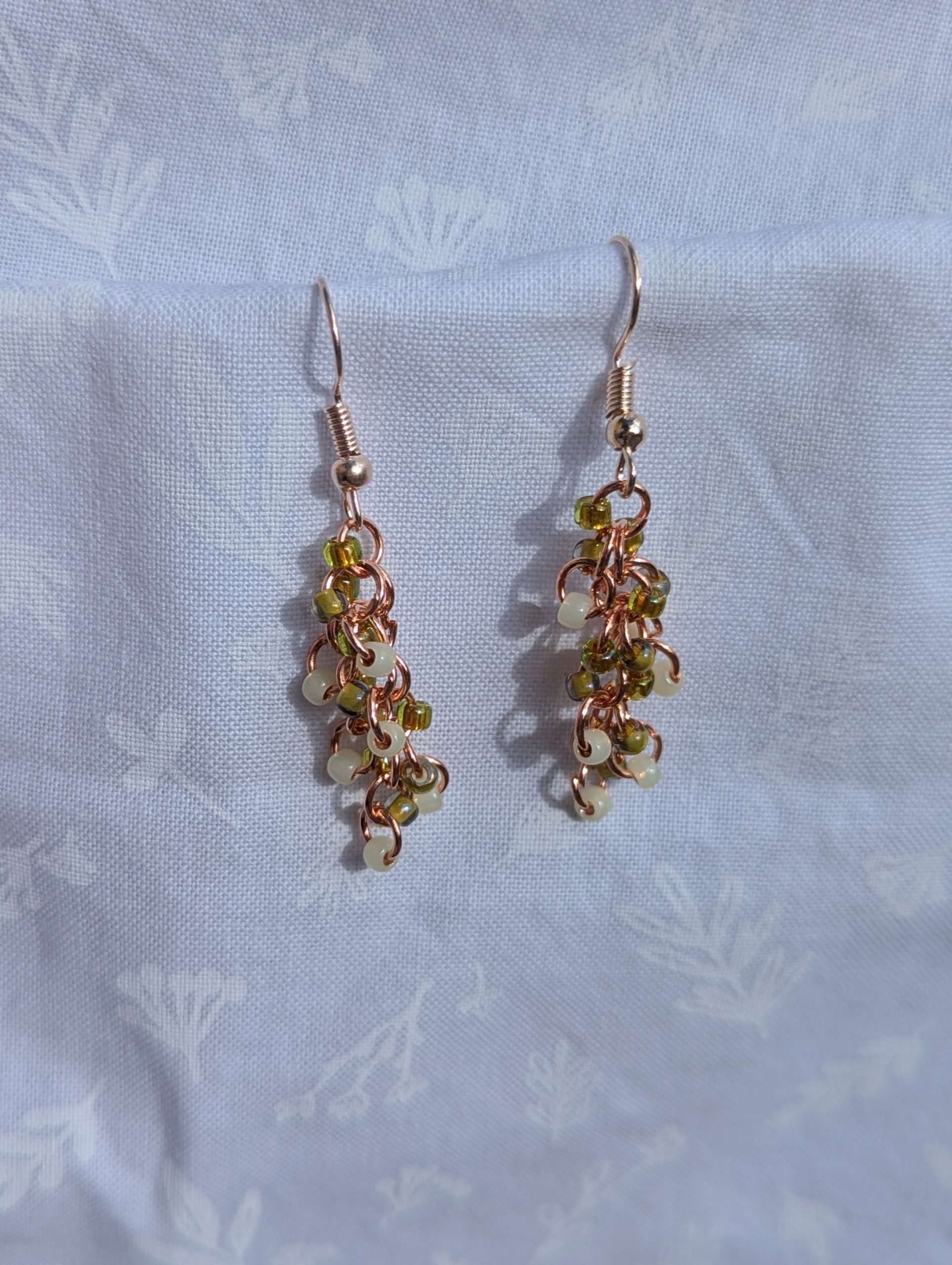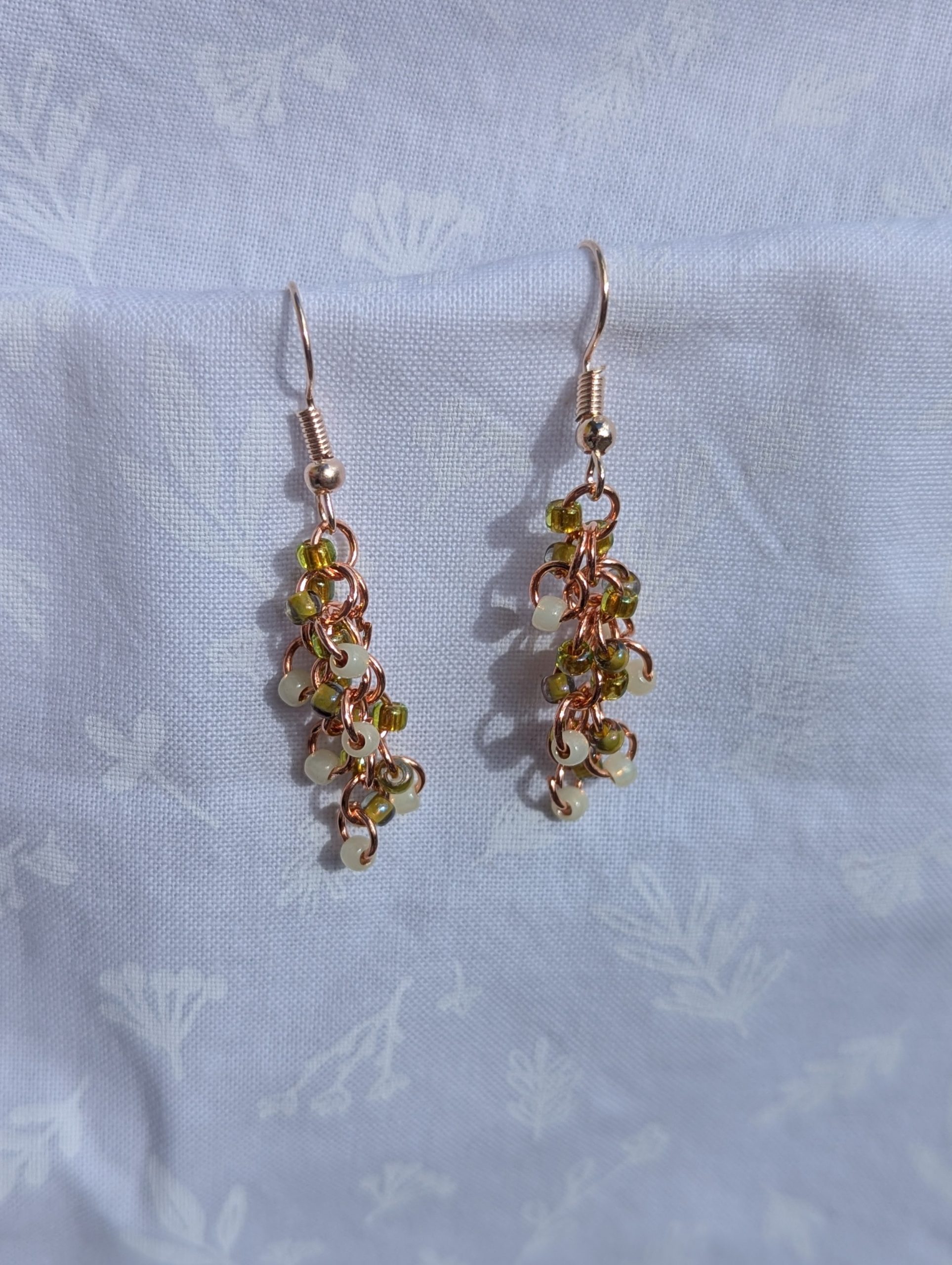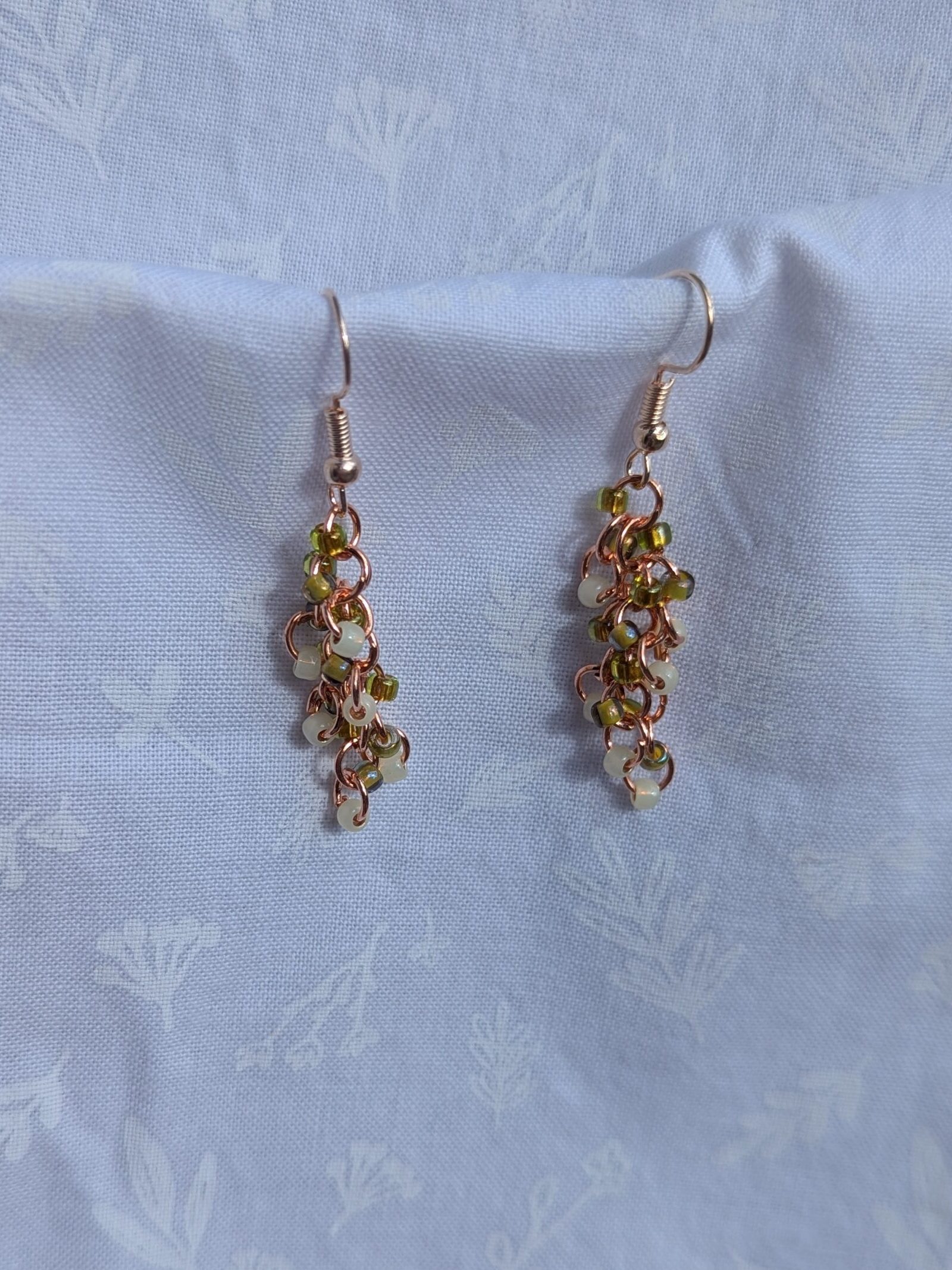 These vibrant Spring Meadow Earrings feature a stunning blend of grass green, pale yellow, and cream glass seed beads with a variety of textures. A total of 18 beads per earring—six beads per color—cascade gracefully, creating a vibrant and eye-catching effect. The rose-gold-colored jump rings and matching earring hooks provide a sleek, polished finish that complements elegant color palette. Perfect for adding a touch of meadow and floral energy to any outfit, these earrings are a must-have for color lovers.