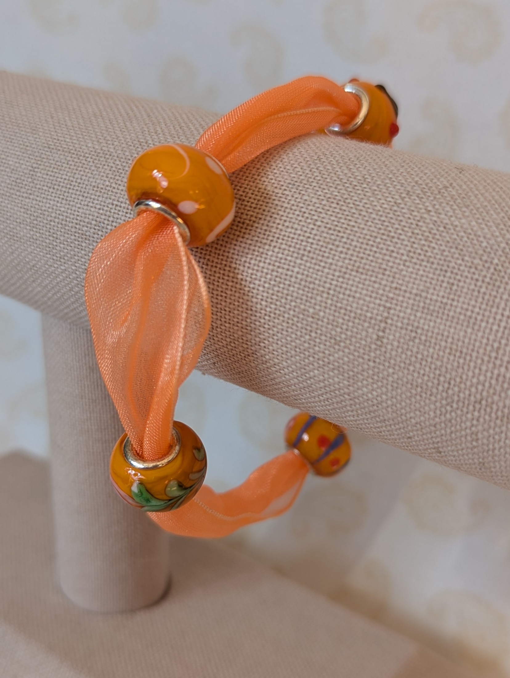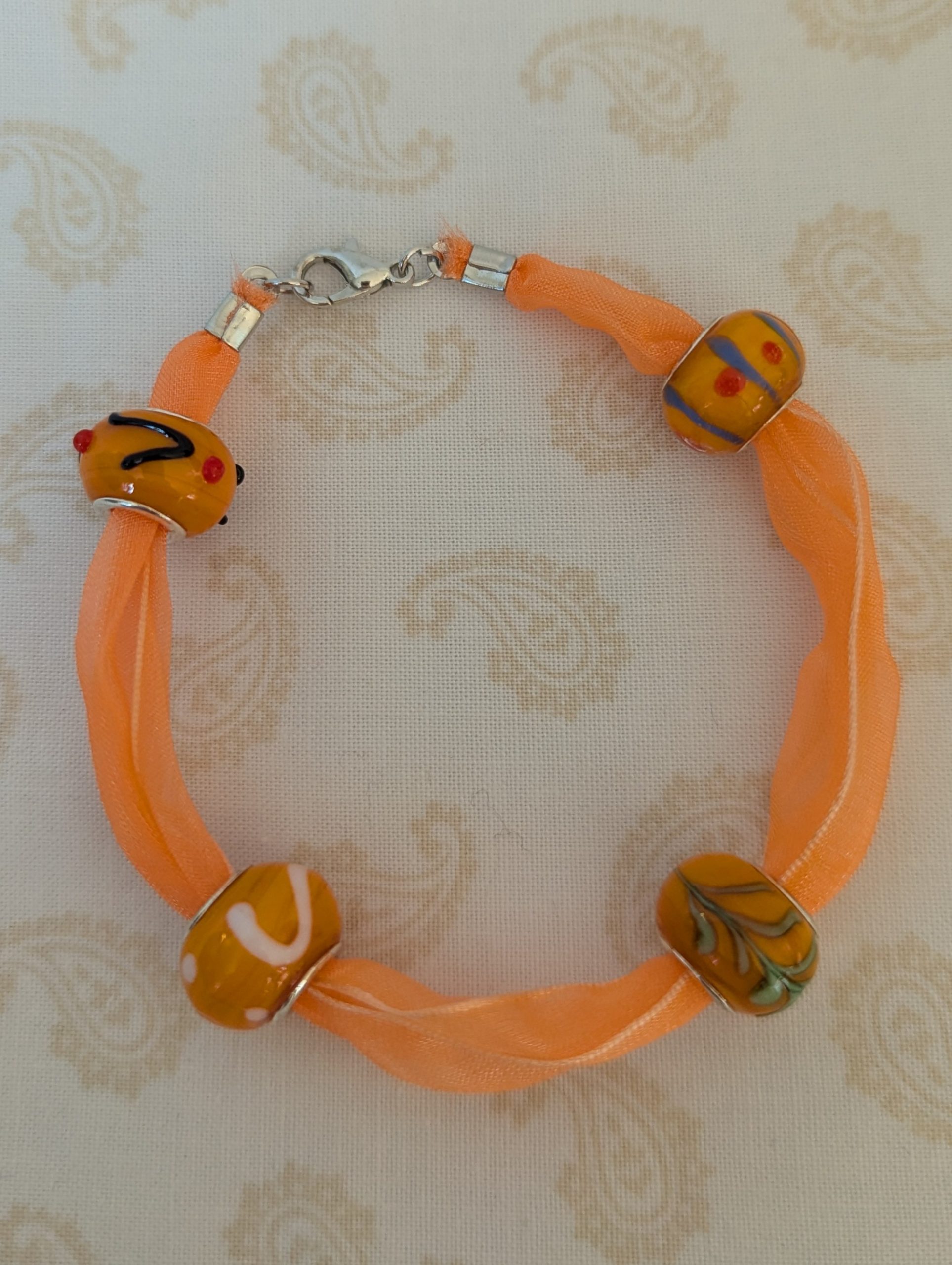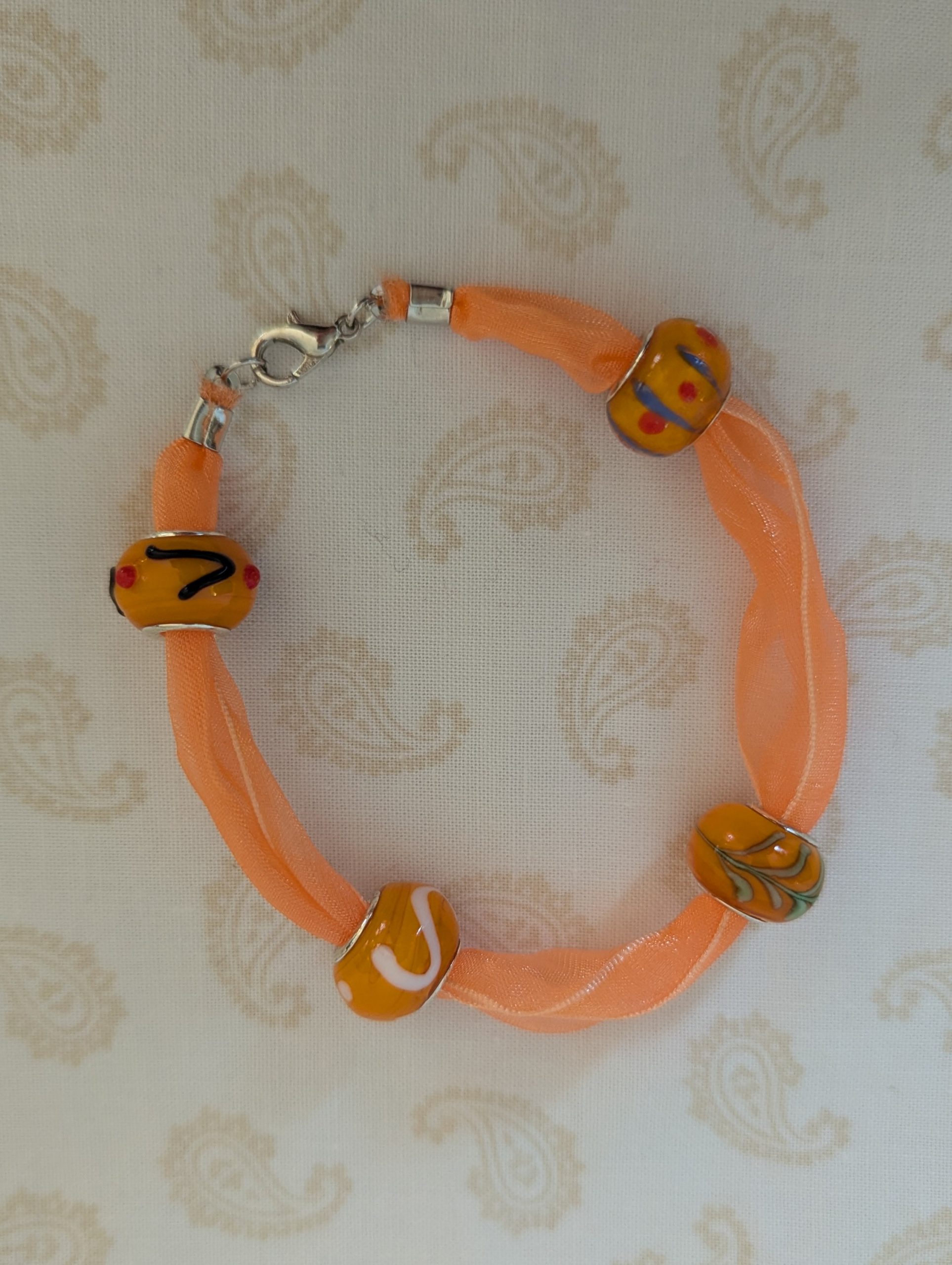 The Sunlit Citrus Orange Ribbon Bracelet is a joyful blend of texture, color, and handcrafted charm. This bracelet features a flowing orange ribbon that wraps softly around the wrist, creating a lightweight and comfortable fit with gentle movement. Four lampwork-style glass beads take center stage, glowing in warm citrus tones. Each bead displays unique surface details, including swirls, dots, and layered accents in honeyed amber, tangerine, and hints of coral and gold. The glossy beads contrast beautifully with the sheer ribbon, adding depth and visual interest. Finished with a silver-colored lobster clasp, the Sunlit Citrus Orange Ribbon Bracelet offers secure…