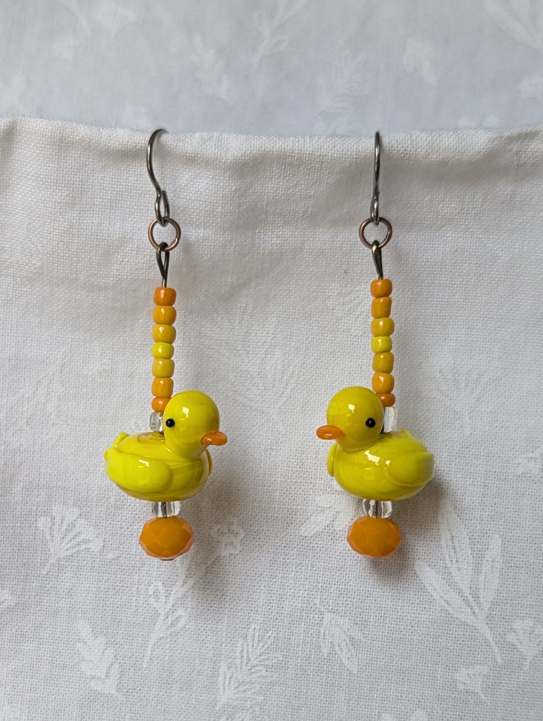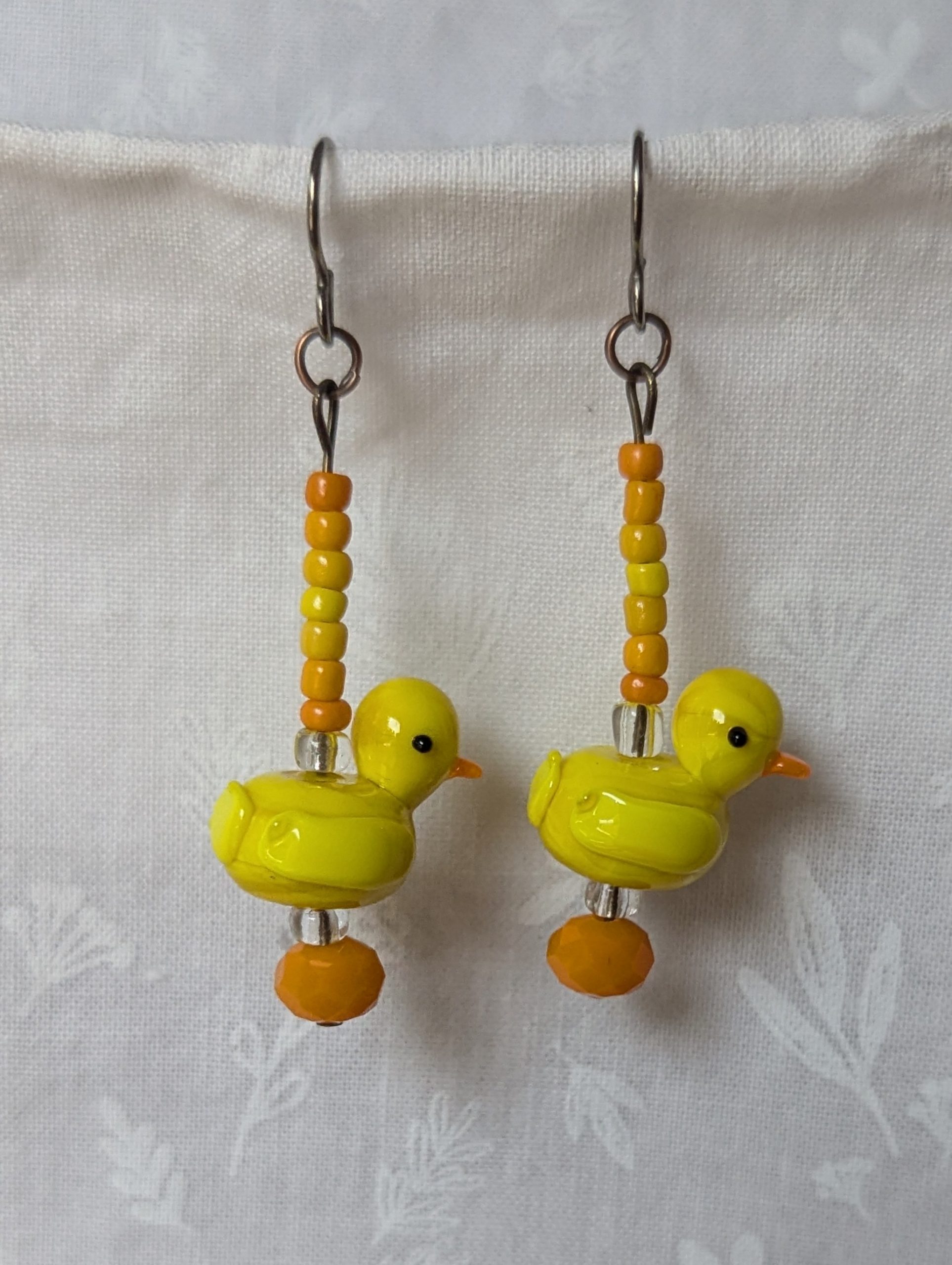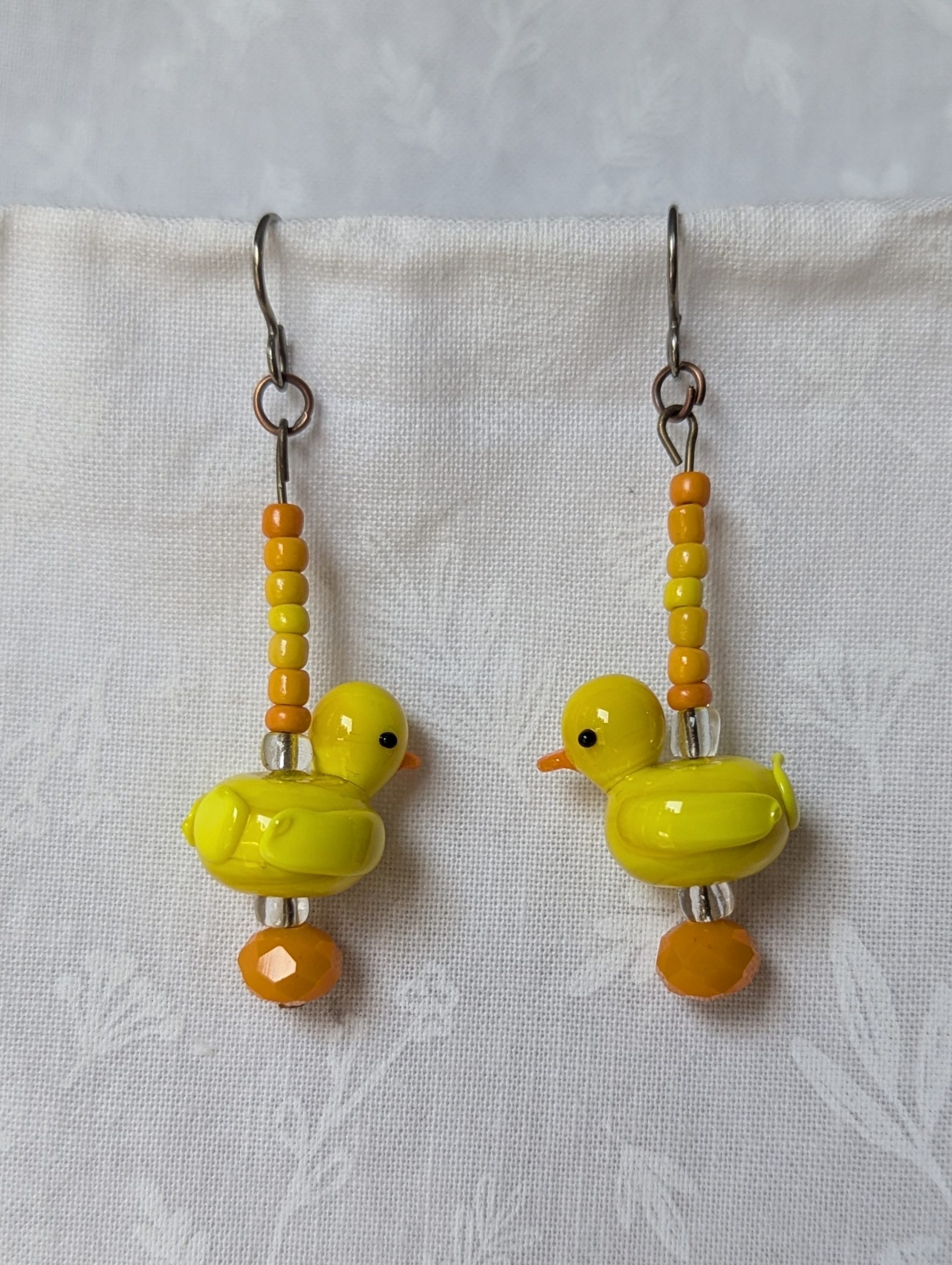 These playful handmade duck earrings bring a touch of sunshine to your style. Each pair features a yellow glass duck accented with warm orange and golden-yellow seed beads. A faceted Czech orange bead and two sparkling clear beads add depth and shimmer, while bronze-colored jump rings and titanium hooks ensure durability and comfort. Perfect for adding cheerful charm to any outfit.