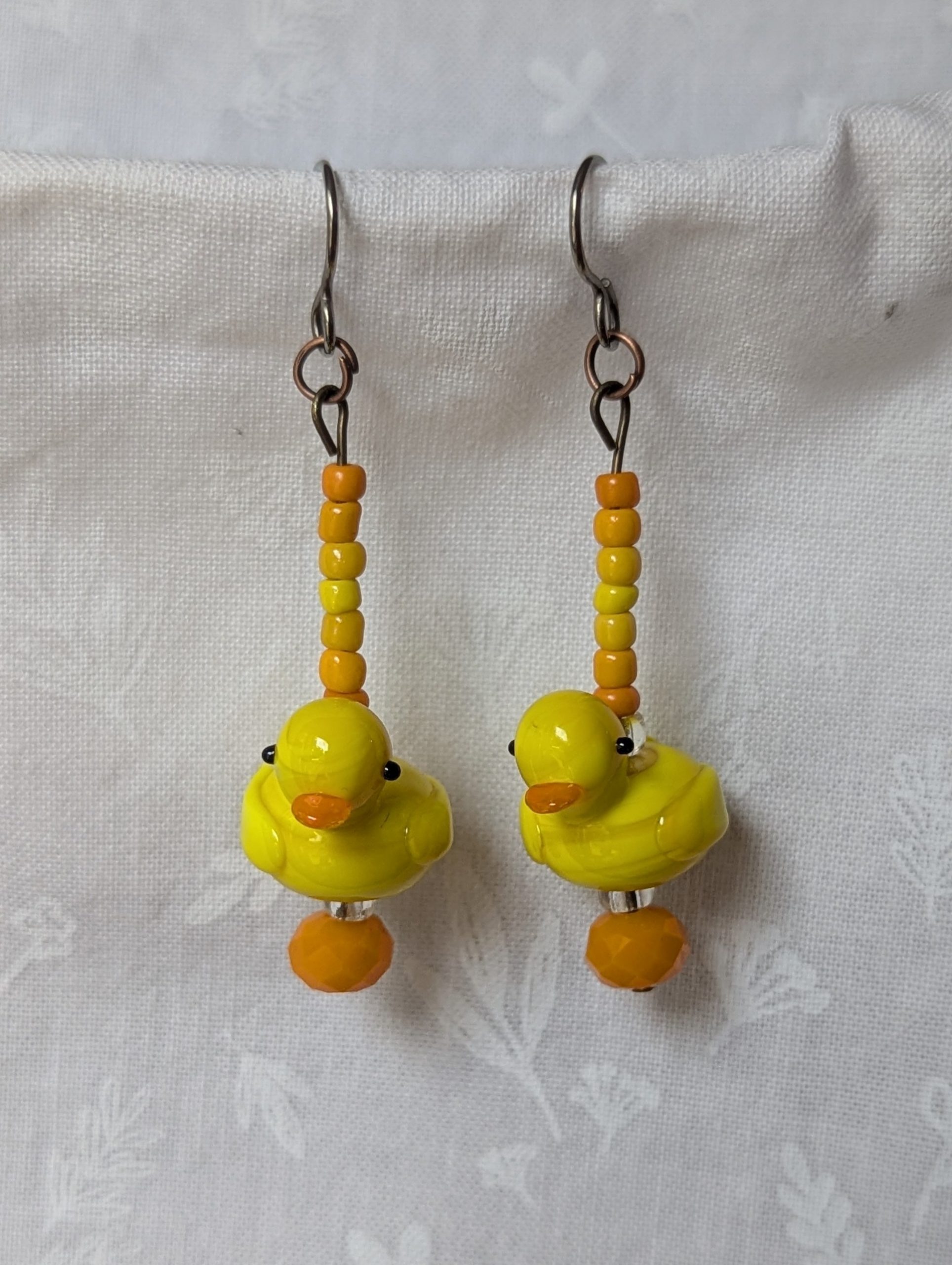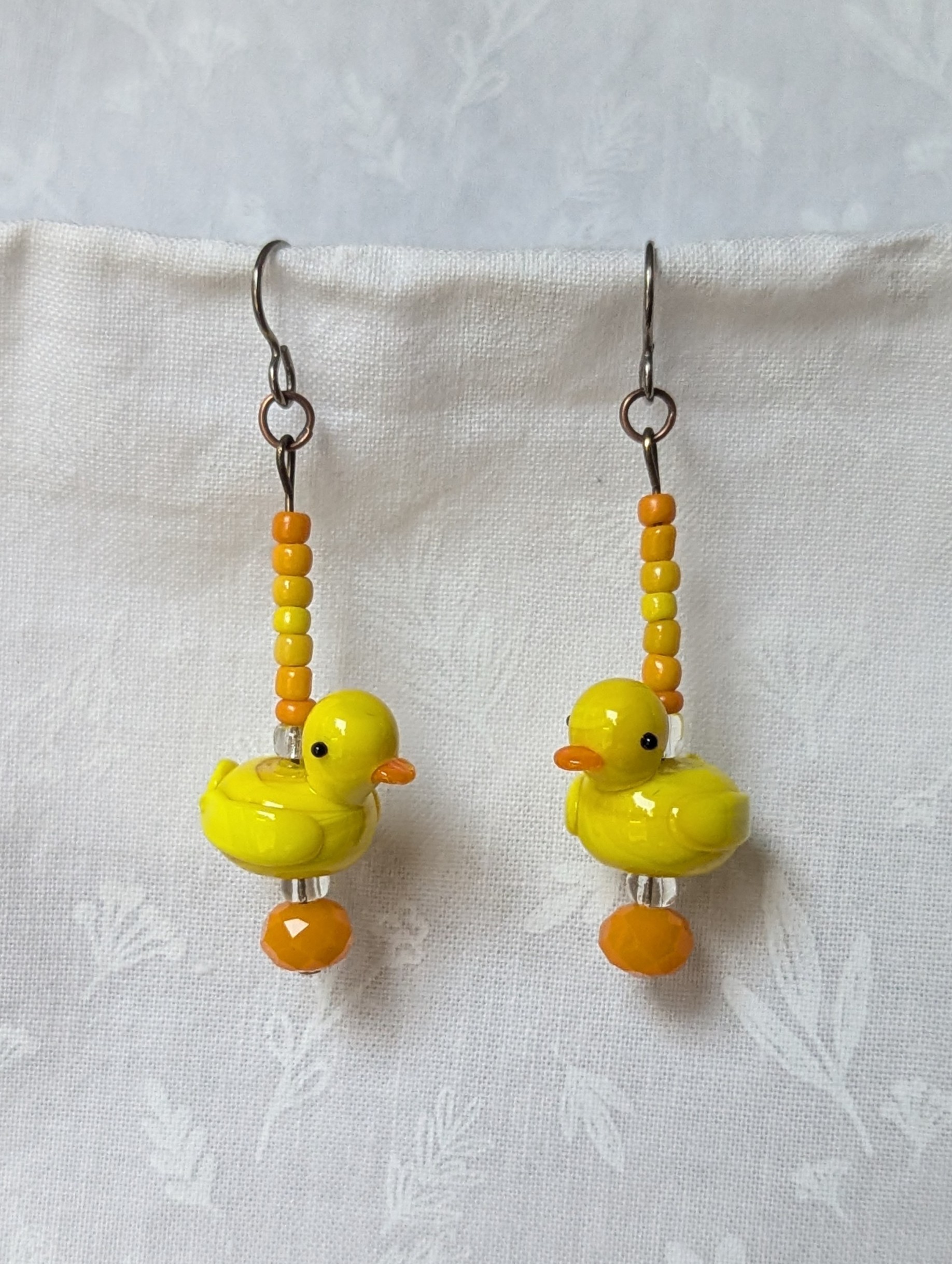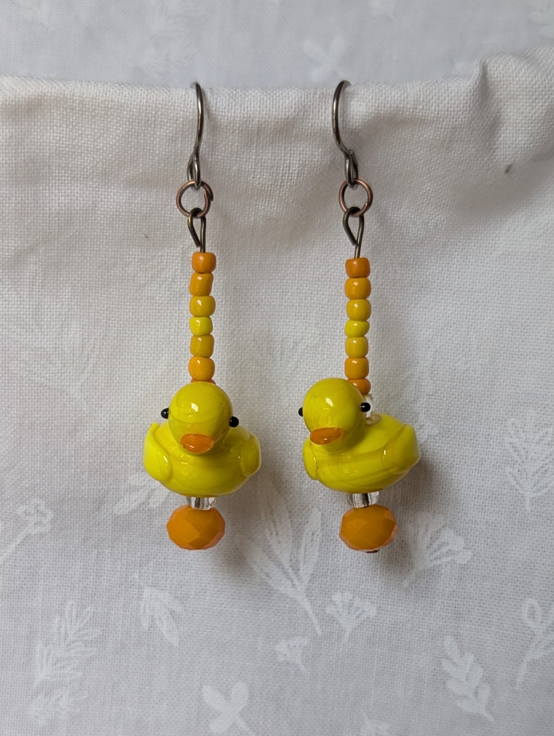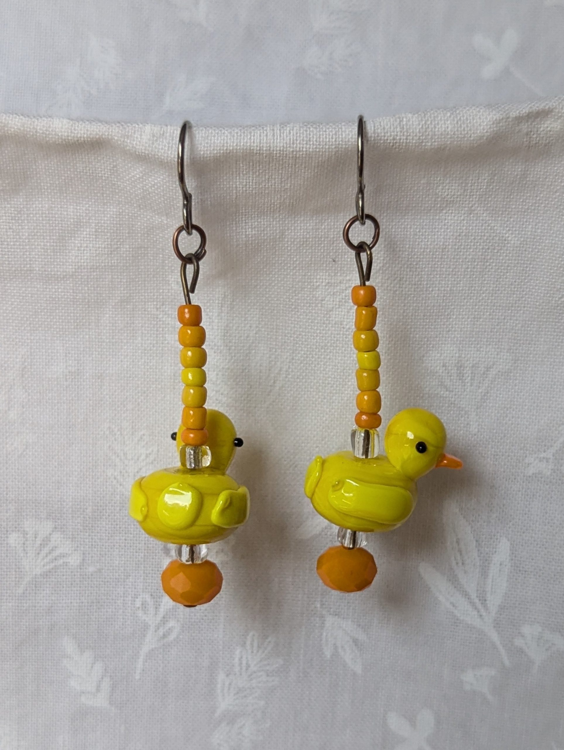 These playful handmade duck earrings bring a touch of sunshine to your style. Each pair features a yellow glass duck accented with warm orange and golden-yellow seed beads. A faceted Czech orange bead and two sparkling clear beads add depth and shimmer, while bronze-colored jump rings and titanium hooks ensure durability and comfort. Perfect for adding cheerful charm to any outfit.