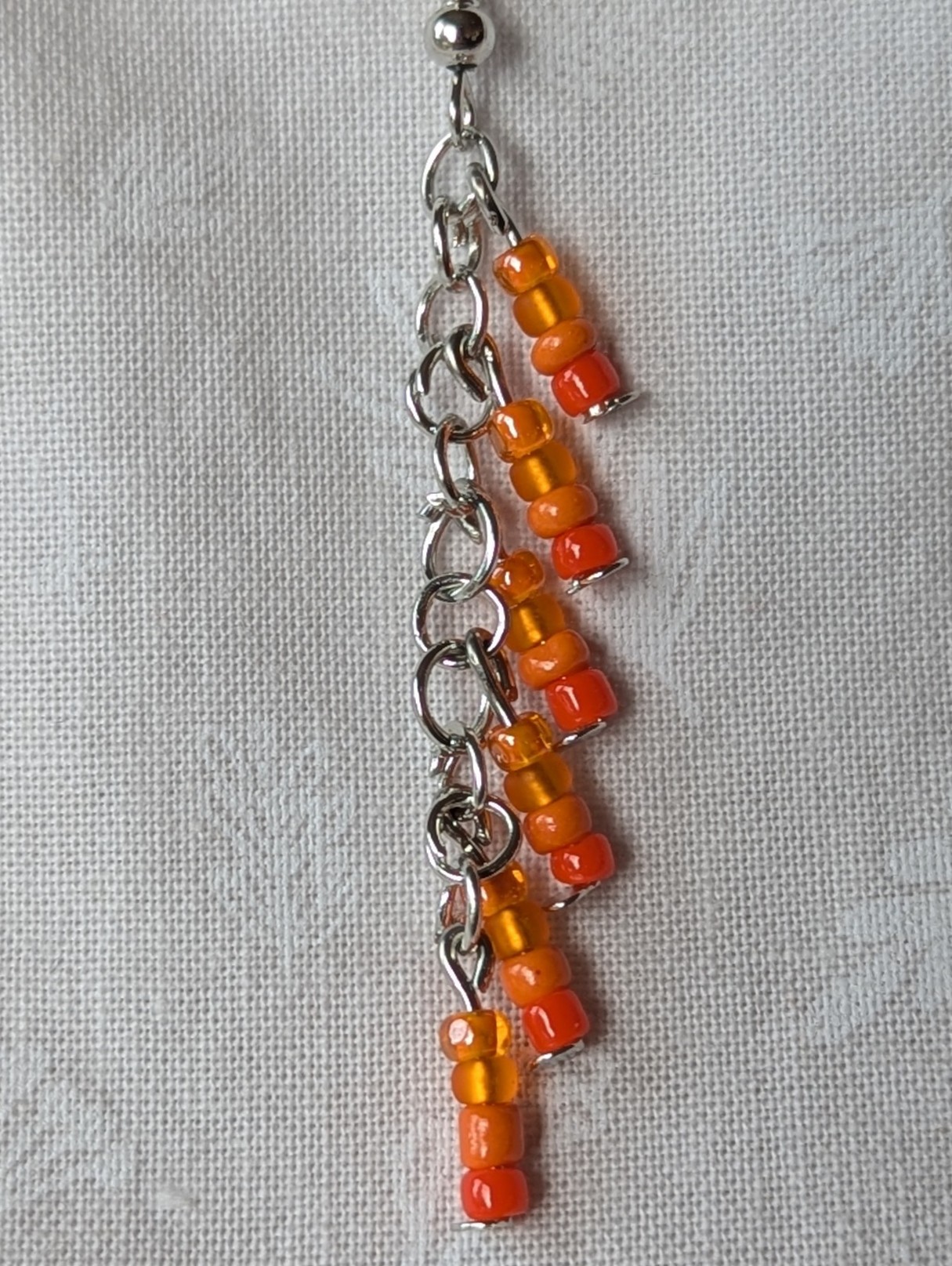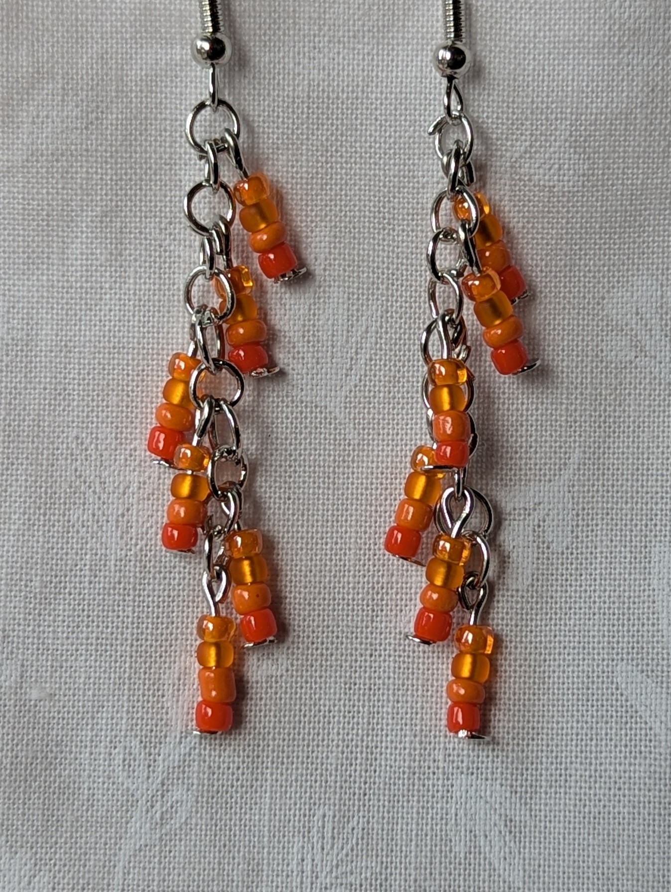 These sunset ember orange beaded earrings glow with the warmth of a summer sunset. Each earring features 13 glass beads in four radiant shades of orange—translucent tangerine, frosted peach, glossy coral, and amber honey. The vibrant hues shimmer against steel-colored jump rings and matching hooks, creating a lively, cascading movement that captures the essence of glowing embers and fading daylight. Perfect for adding a cheerful spark to any outfit.