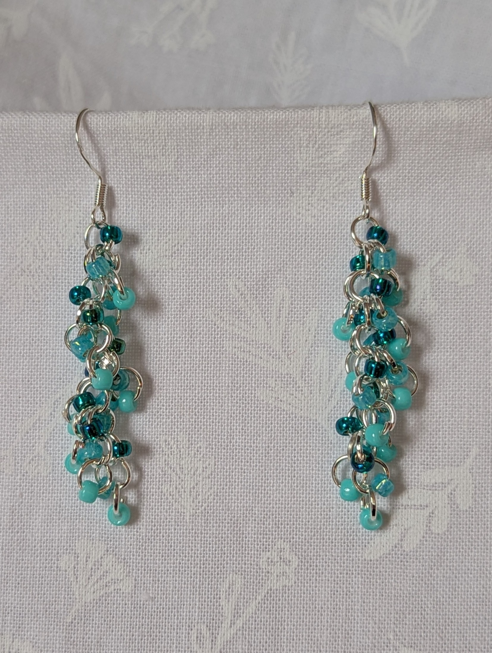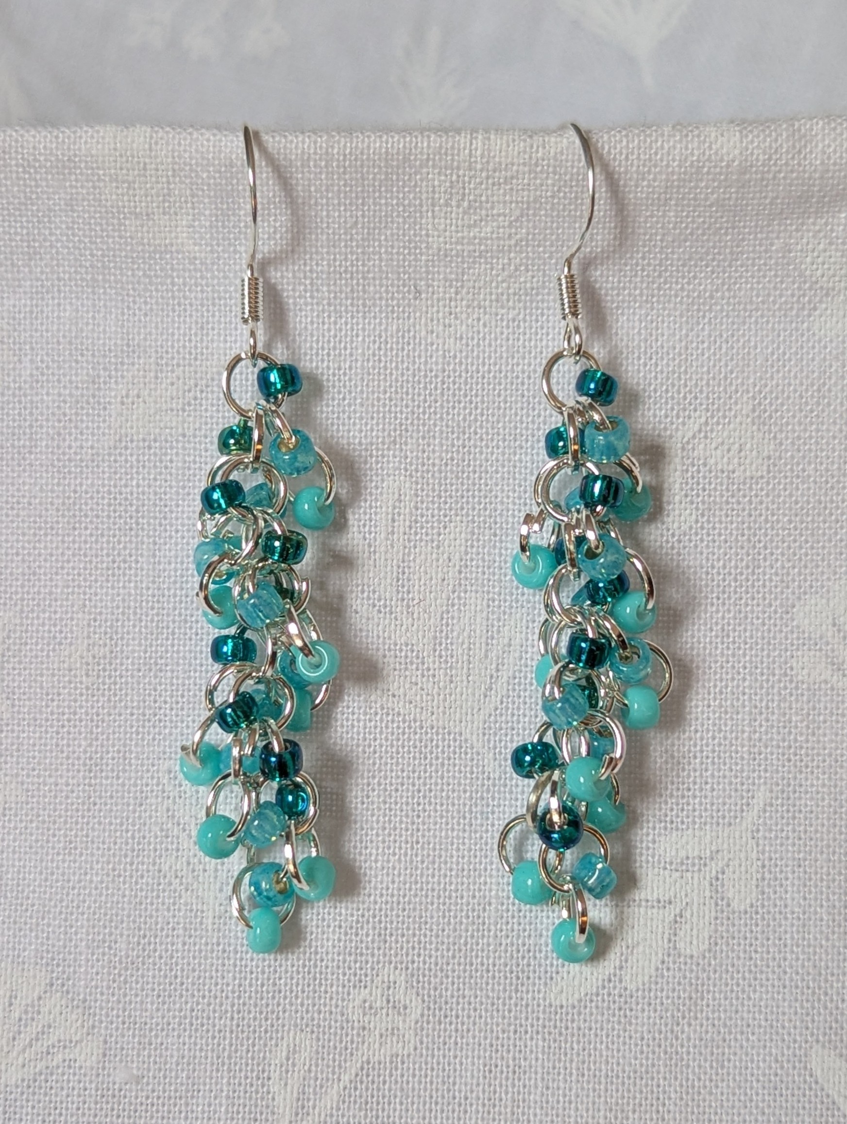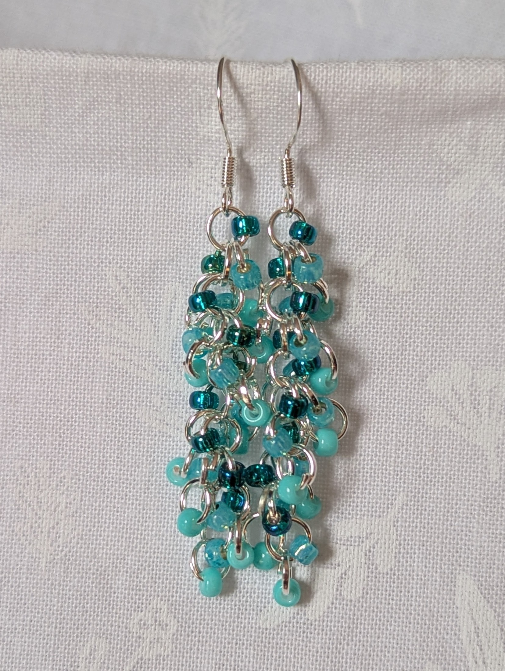 Teal dangle earrings! Make waves with the Ocean Drift Earrings—a breezy, lightweight pair of teal dangle earrings that bring ocean energy to your every step. Each handcrafted pair features 27 glass beads in a lush mix of beachy blues: soft matte seafoam, luminous silver-lined teal, and radiant iridescent cyan. The beads are delicately linked together with bright silver-colored rings, forming a free-flowing cascade of color and shine. Sterling silver hooks add an elegant touch and ensure comfortable wear all day long. These earrings shimmer with movement and light—just like sunlight on the sea.