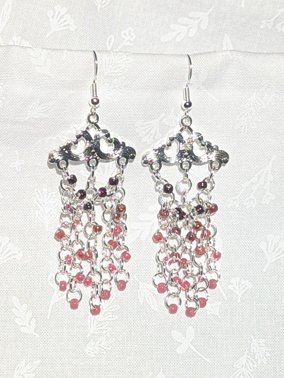 Elegant and enchanting, Twilight Chandelier earrings are a perfect harmony of deep garnet and soft mauve tones. Featuring 25 glass seed beads in five colors—silver-lined garnet, shimmering mauve, mauve-lined clear, and solid mauve—these earrings are delicately arranged from a Tibetan-style chandelier ornament. Silver-colored jump rings and matching earring hooks complete the look, creating a graceful accessory that captures the essence of dusk-lit skies and timeless romance.