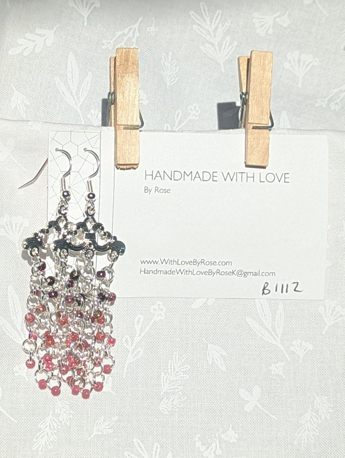 Add a touch of elegance and artistry to your style with these stunning handcrafted chainmail earrings. Carefully designed with intricate detail, each pair features delicate metal rings woven together to create a flowing, eye-catching design. Tiny seed beads and shimmering crystal accents add just the right amount of sparkle. As they dangle and move, they catch the light beautifully, making them a perfect statement piece for any occasion.